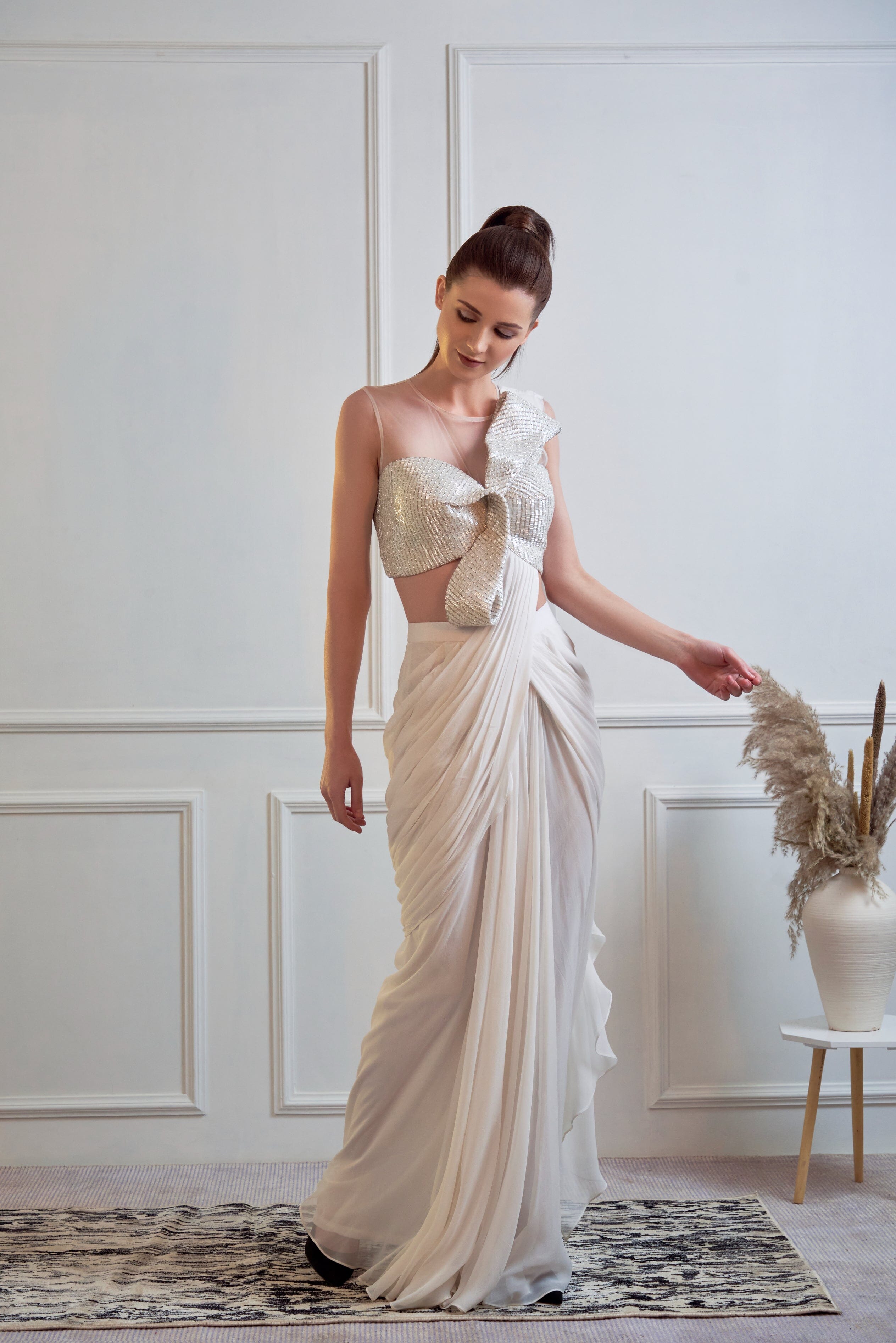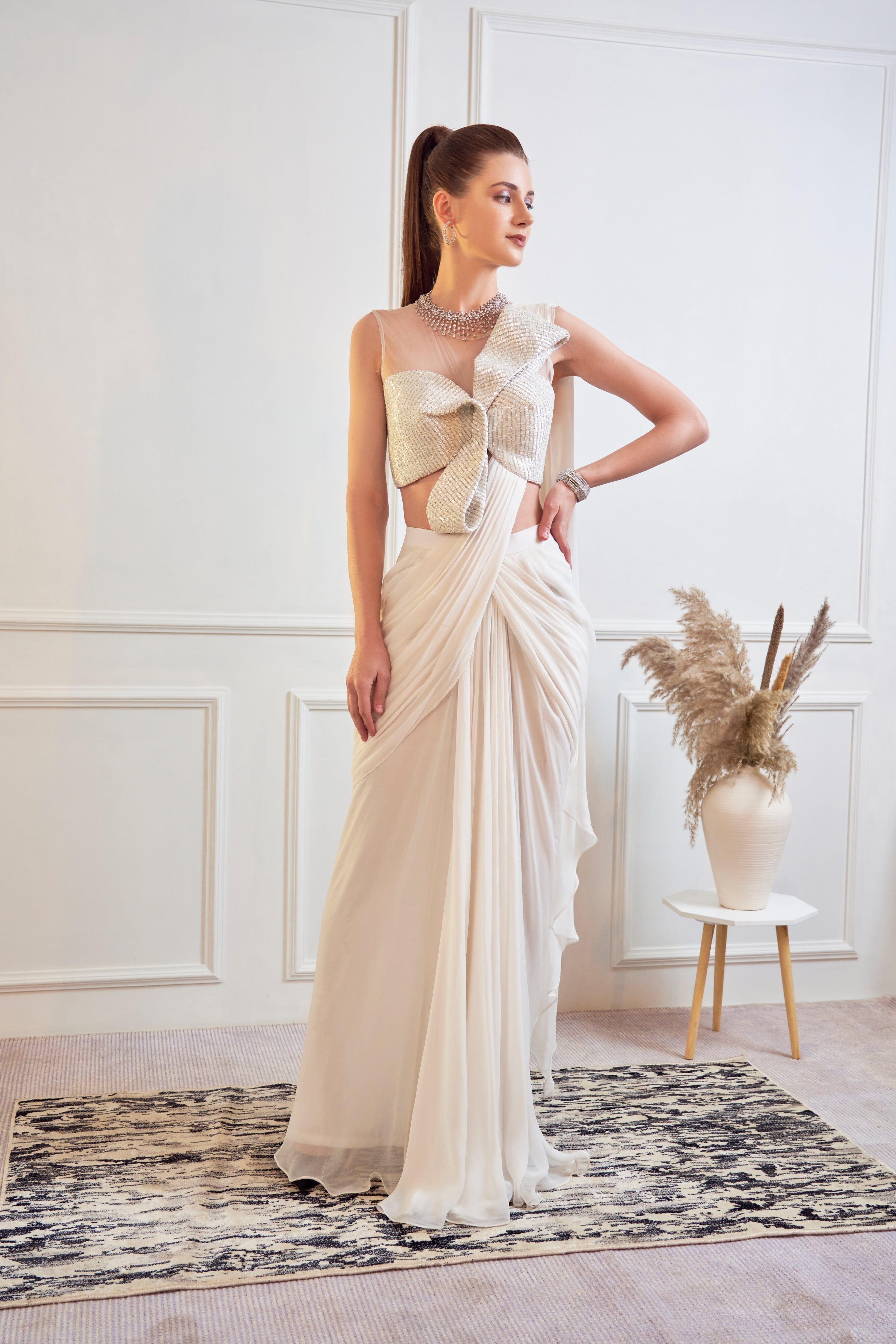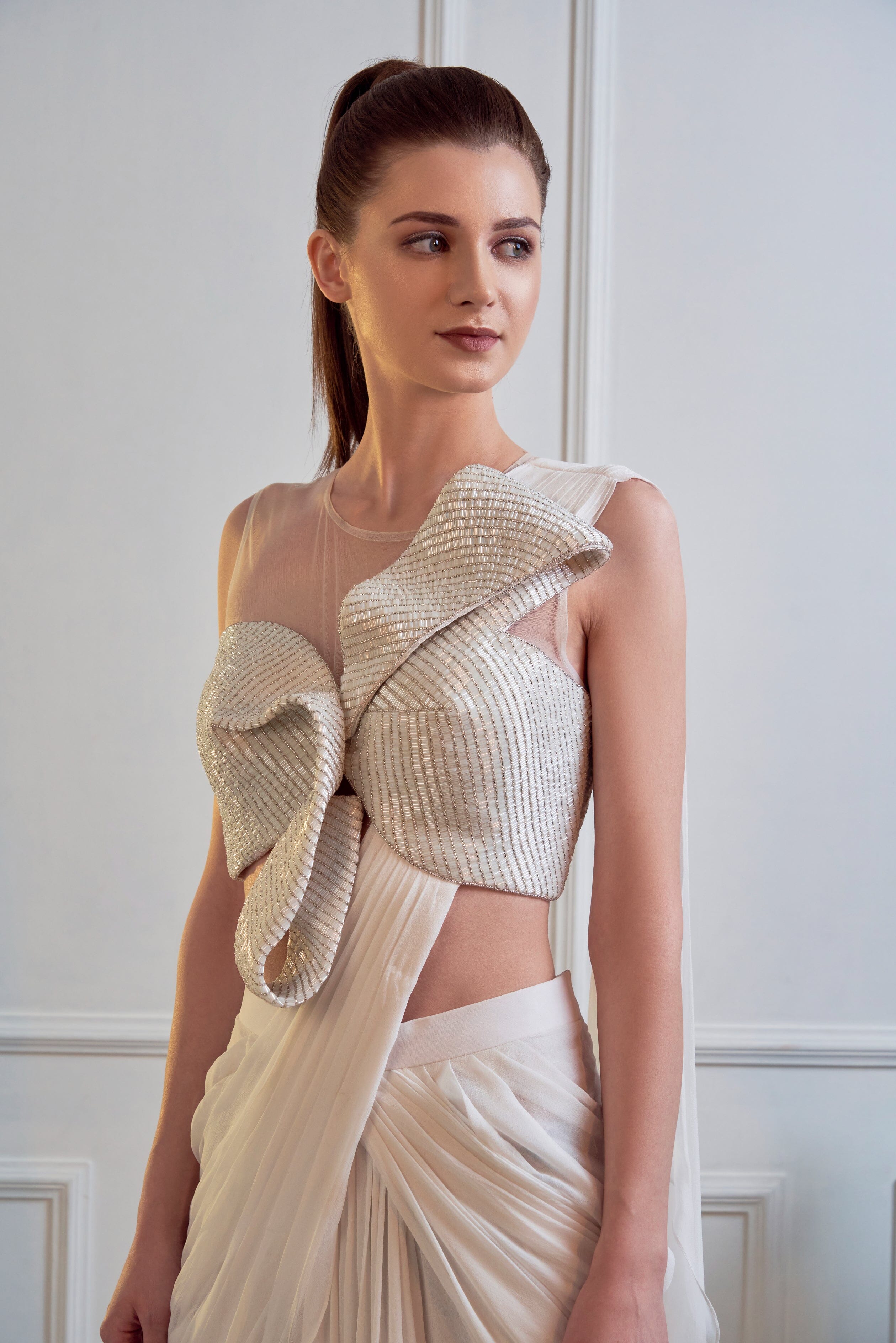 Un vestido de georgette Pantone color marfil y sari de red adornado con apliques de nalki y moti. Combinado con una hermosa blusa con lazo, este look es ideal para todas tus ocasiones del atardecer al amanecer.