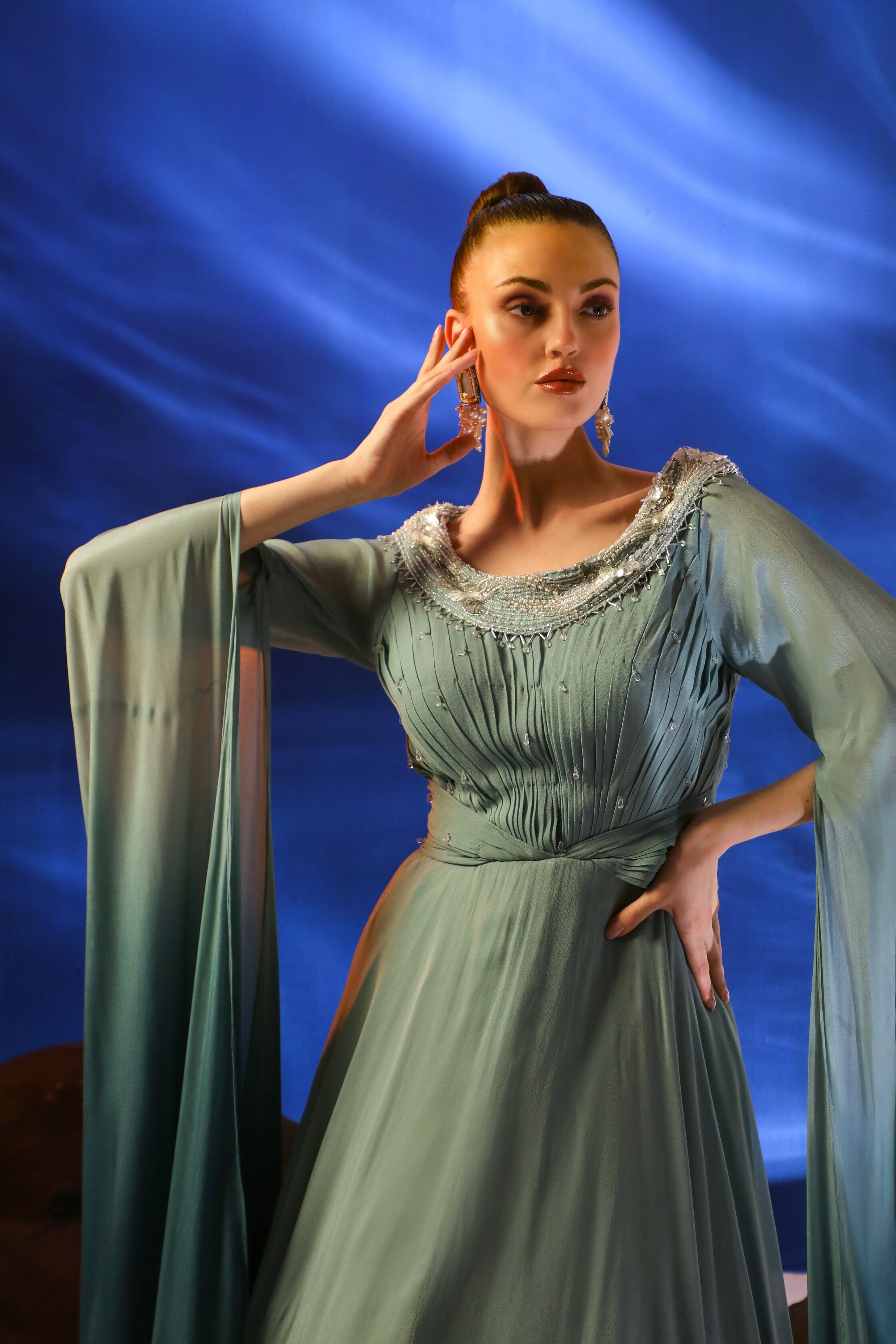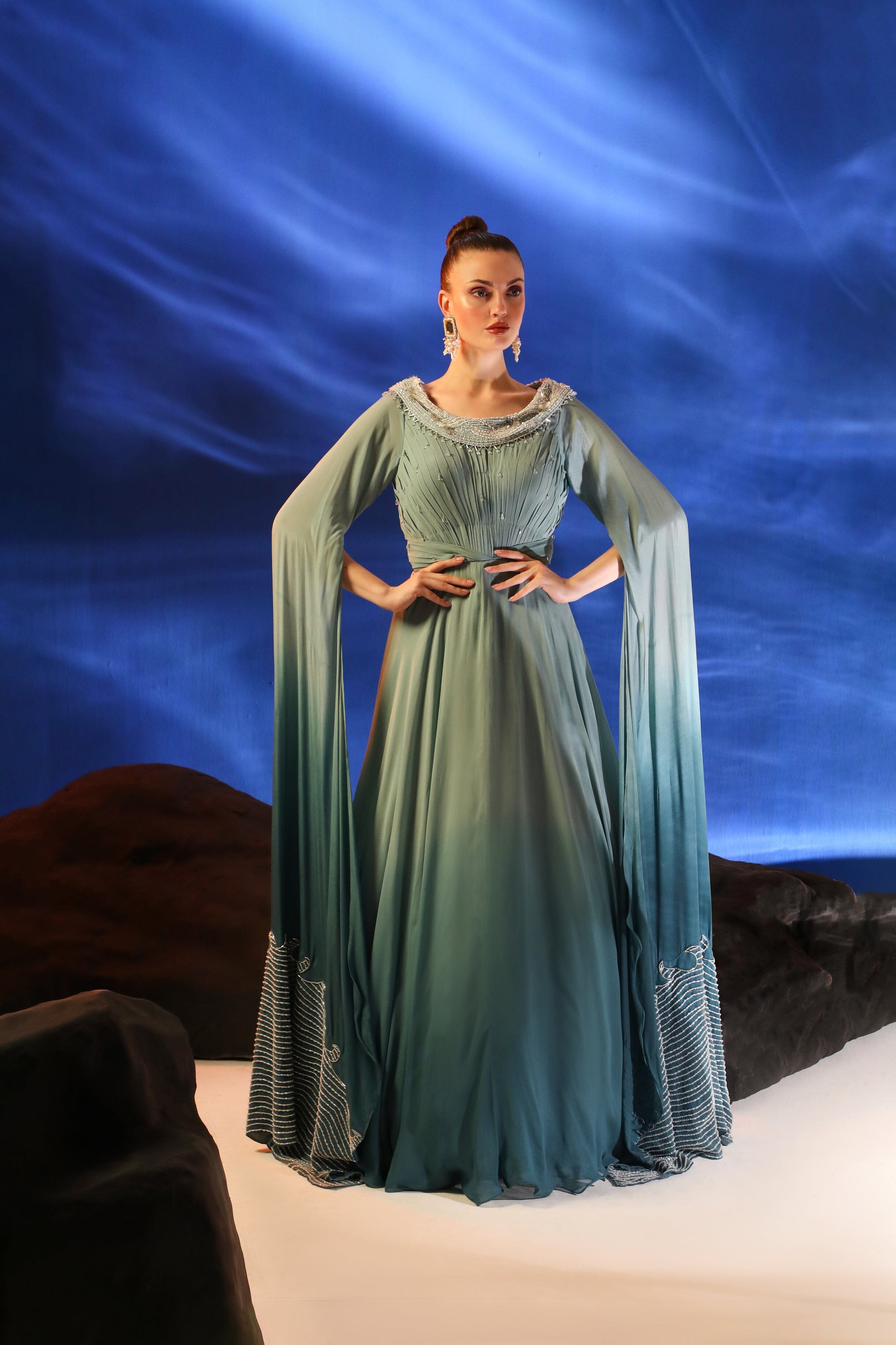 El vestido Darya es una amalgama poética de un corpiño plisado con cuello barco y mangas tipo capa bordadas que complementan maravillosamente un vestido circular completo con degradado. Es un clásico de Jade que habla magníficamente por sí solo.