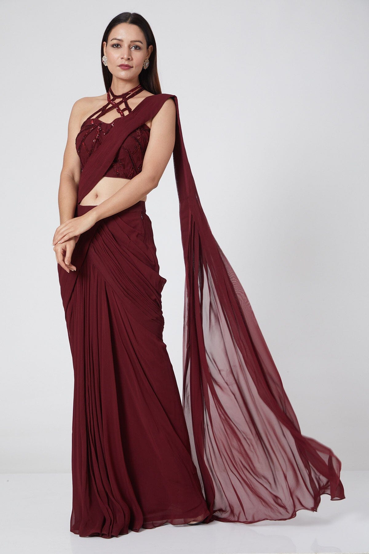 Elegante drapeado color vino combinado con una elegante blusa con detalles de lentejuelas.