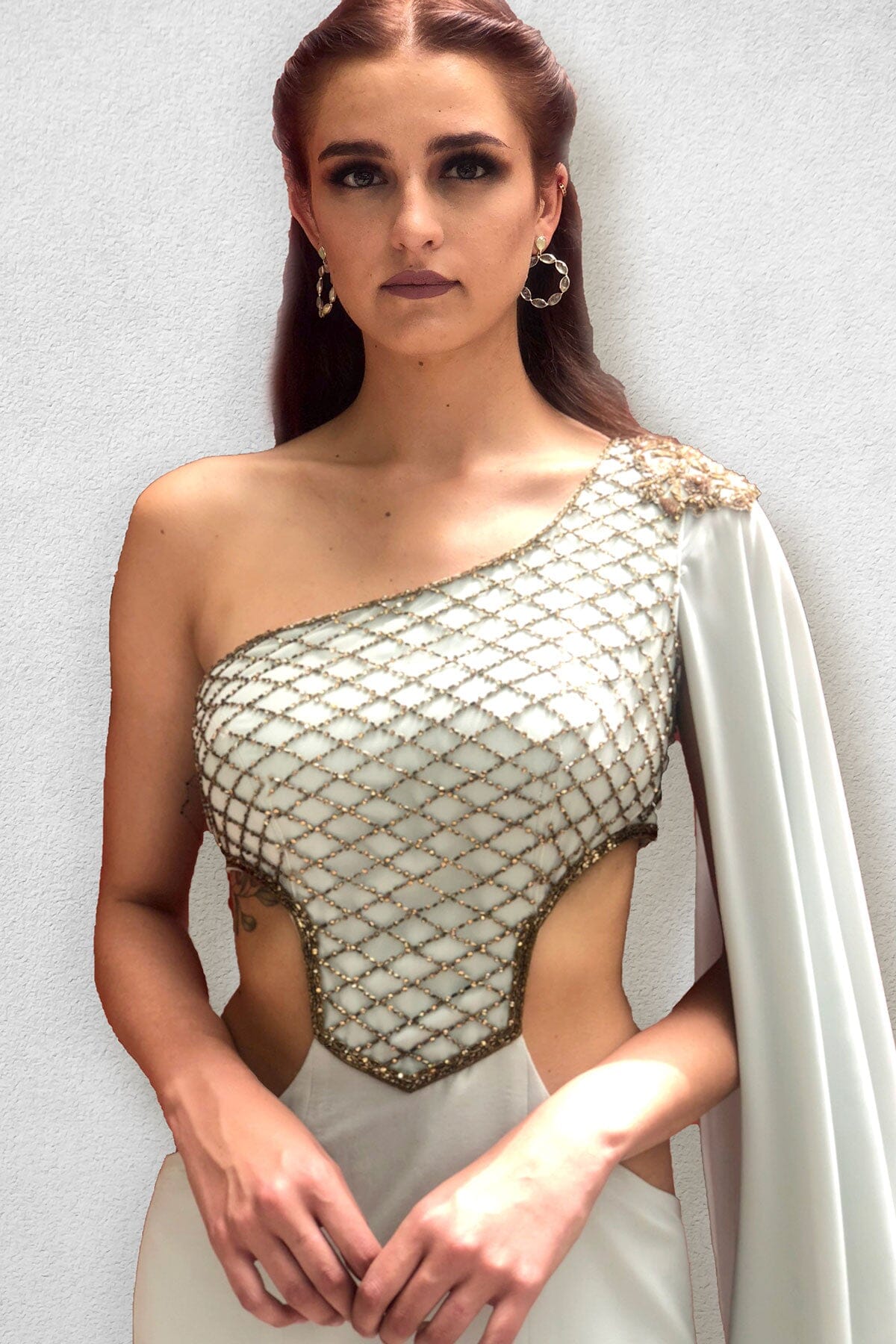 Un vestido inglés azul con corte de pescado compuesto de georgette italiana.