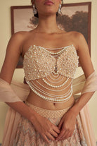 This charming heavy lehenga with beautiful and finely constructed embroidery on the whole outfit with pearls , cruystals and aari work. Ready to not get your eyes off on this garment.