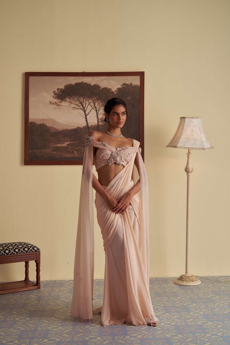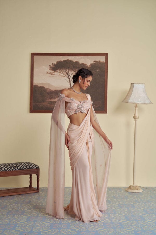 This drape saree is a perfect mix of classic and traditional. The pastel colour palette on the organza and chinon fabric is a delight for the eyes. It features our intricate garment construction and is furthered engineered with detailed Pearl and Aari embroidery.