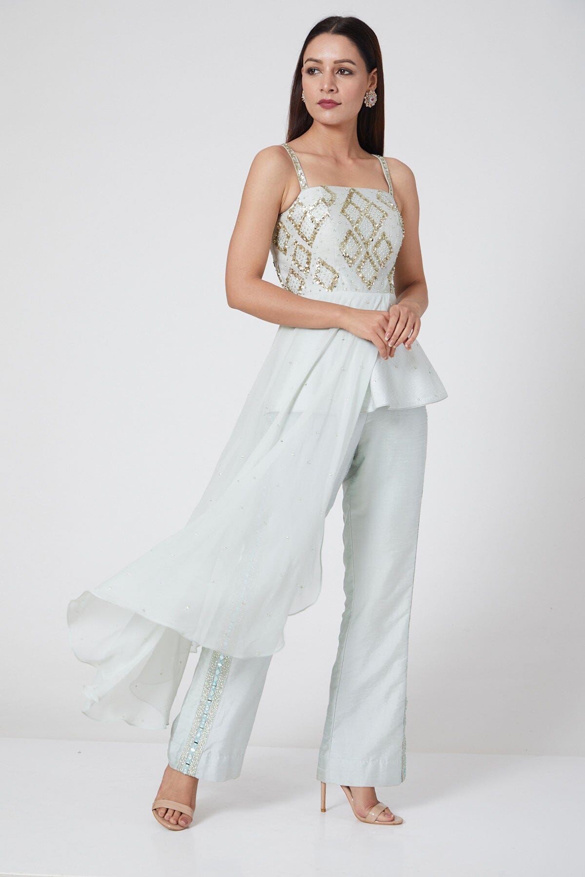 Top peplum asimétrico azul hielo sobre pantalones adornados. El elegante conjunto está elaborado con seda Dupion.