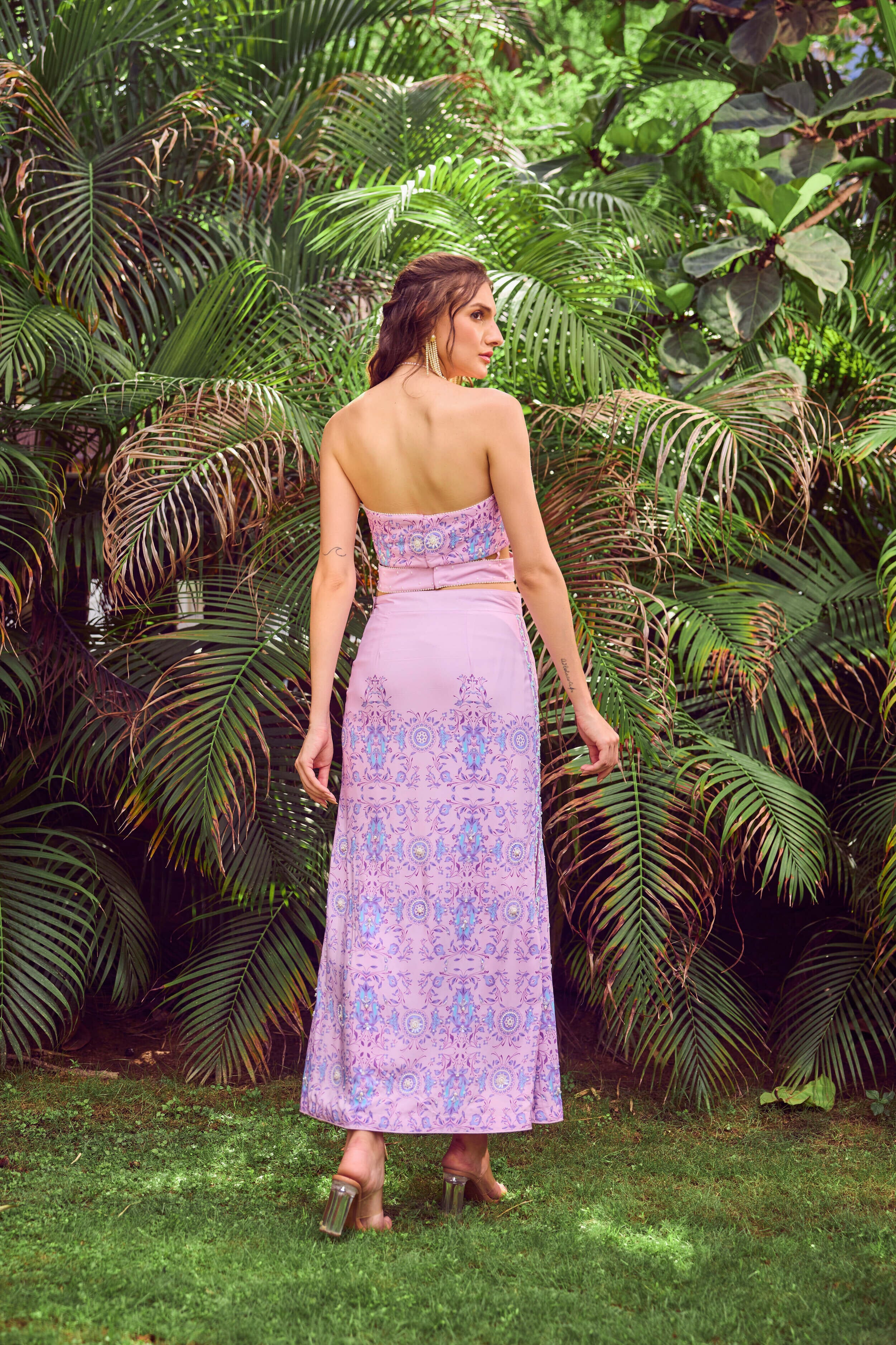 The crop top has a front criss cross element paired with a slit on both sides of the skirt. This ensemble highlights a striking embllishments against finely constructed garment and continues to be distinctive and modern in style.
