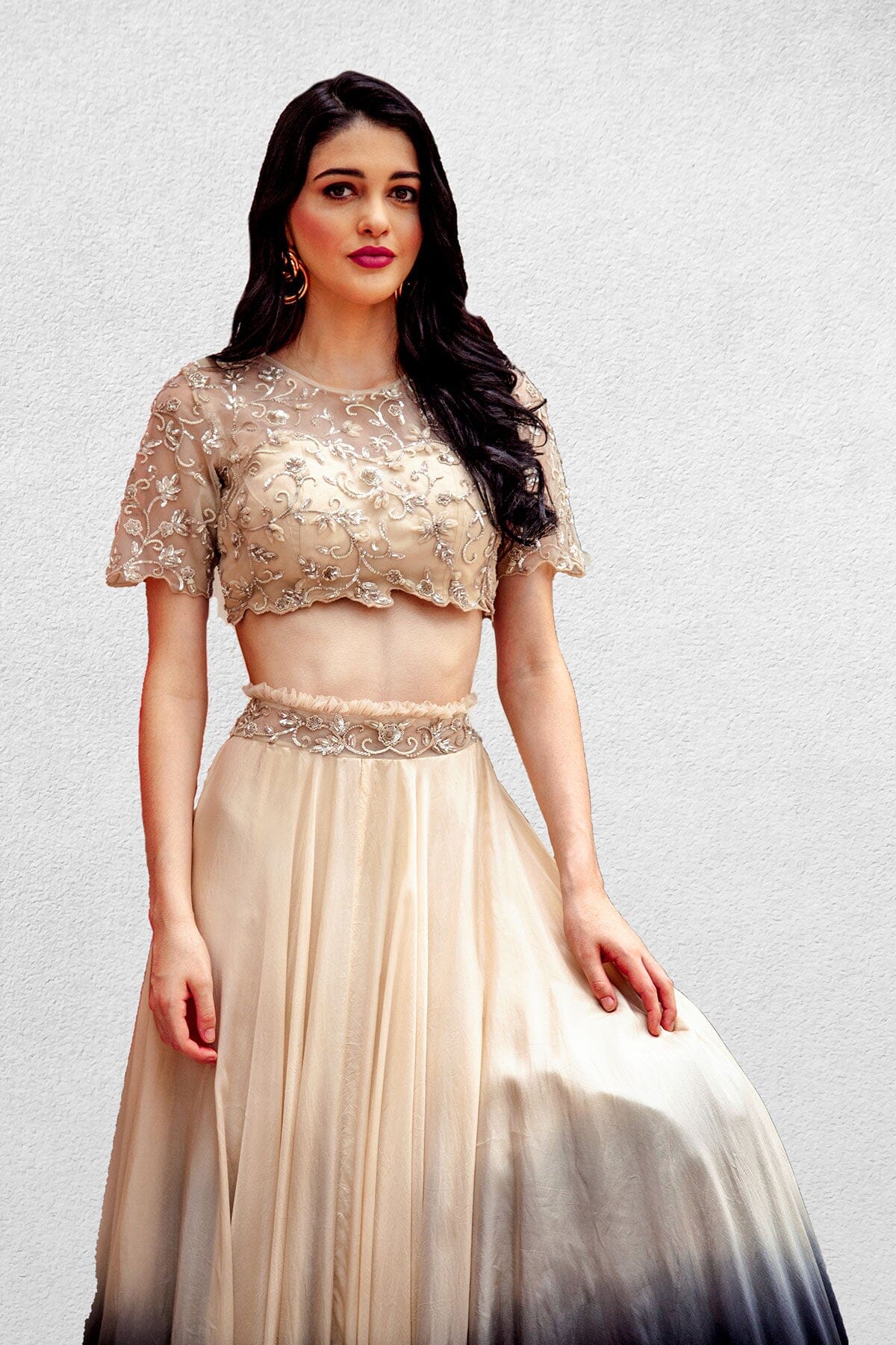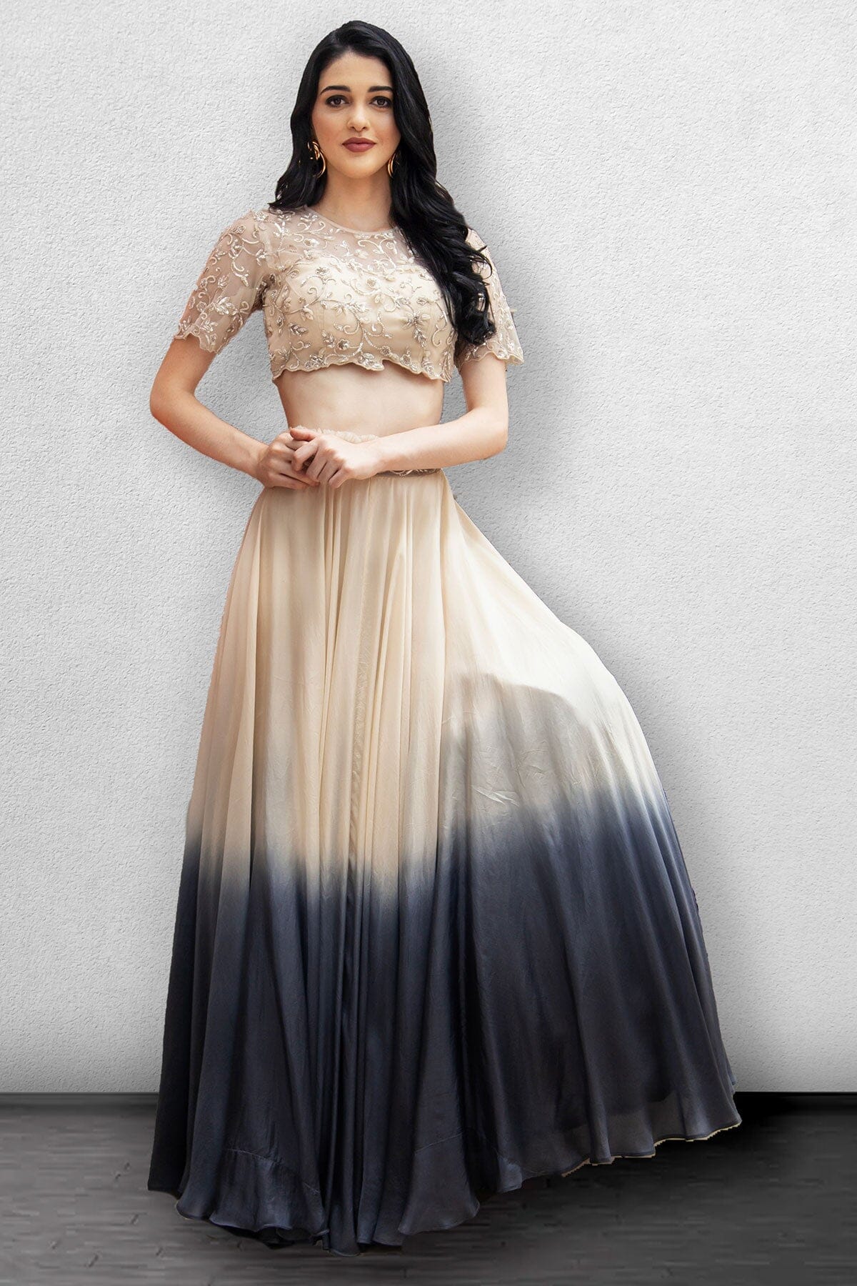 Lehenga marfil-ombré con top corto