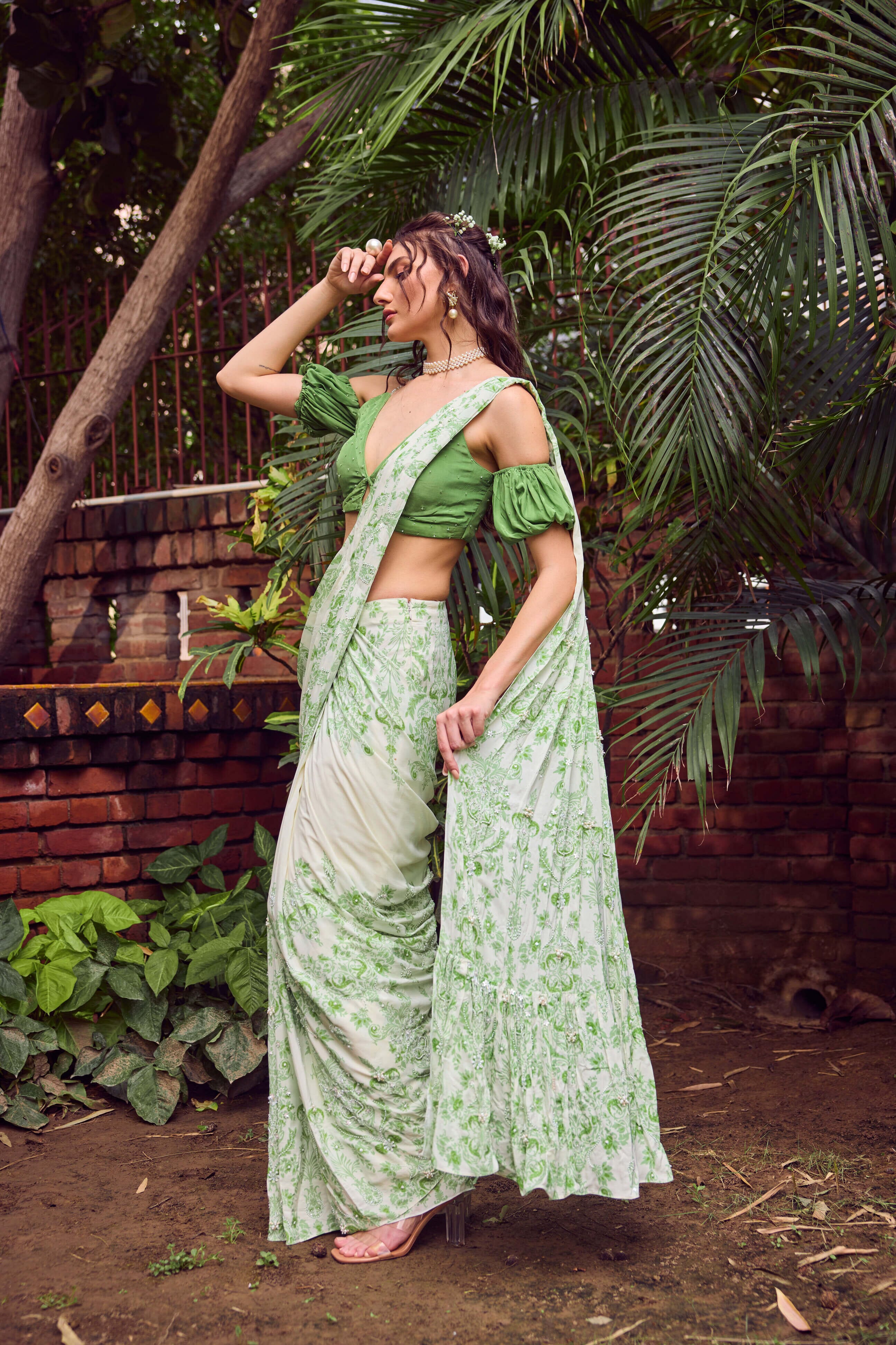 This ensemble has our classic pearl highlight on the print detailing complimenting linear artwork perfectly juxtaposed together exhibiting impeccable couture craftsmanship. This outfit is a perfect fit to dance away the cocktail night or hit the reception party!