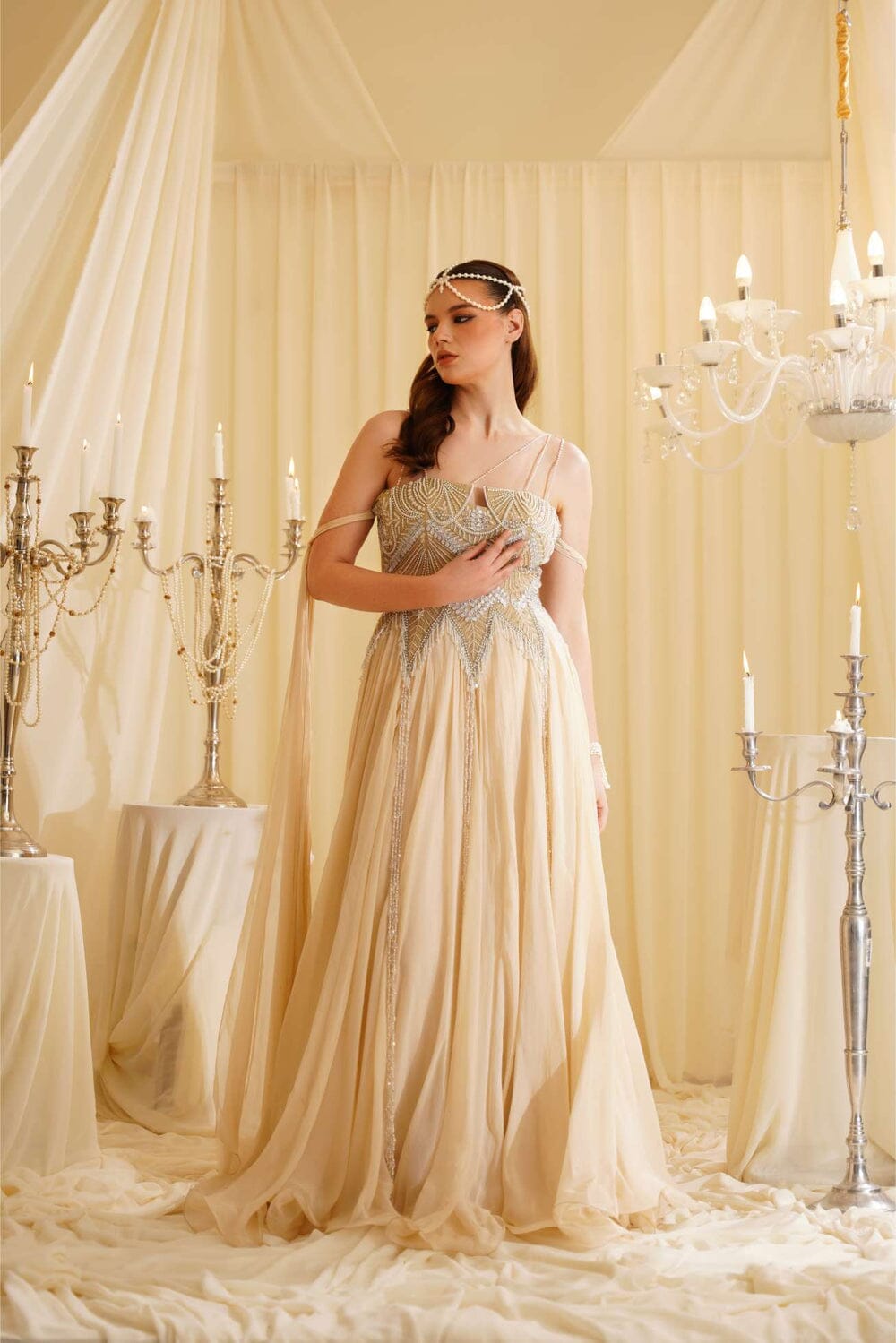 Our beguiling ‘Mabel Gown’ off white organza outfit features a bouquet of pearl detailing with foliage around the drape and the bodies. It is a perfect fit complemented with an extravagant detailing on the bodice. Our pearl and crystal Embroidery along the bodice makes it all the more graceful and a perfect fit for any occasion for you which requires contemporary touch.