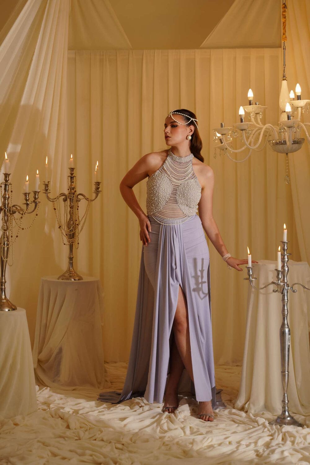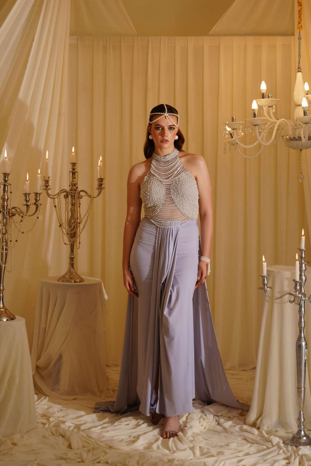 The bodice is adorned with pearl strings crystal work comprising Jade’s iconic designs, encompassing intricate pearl character embroidery , mesmerizing handwork, stunningly embroidered bodice, and exquisite summer colours