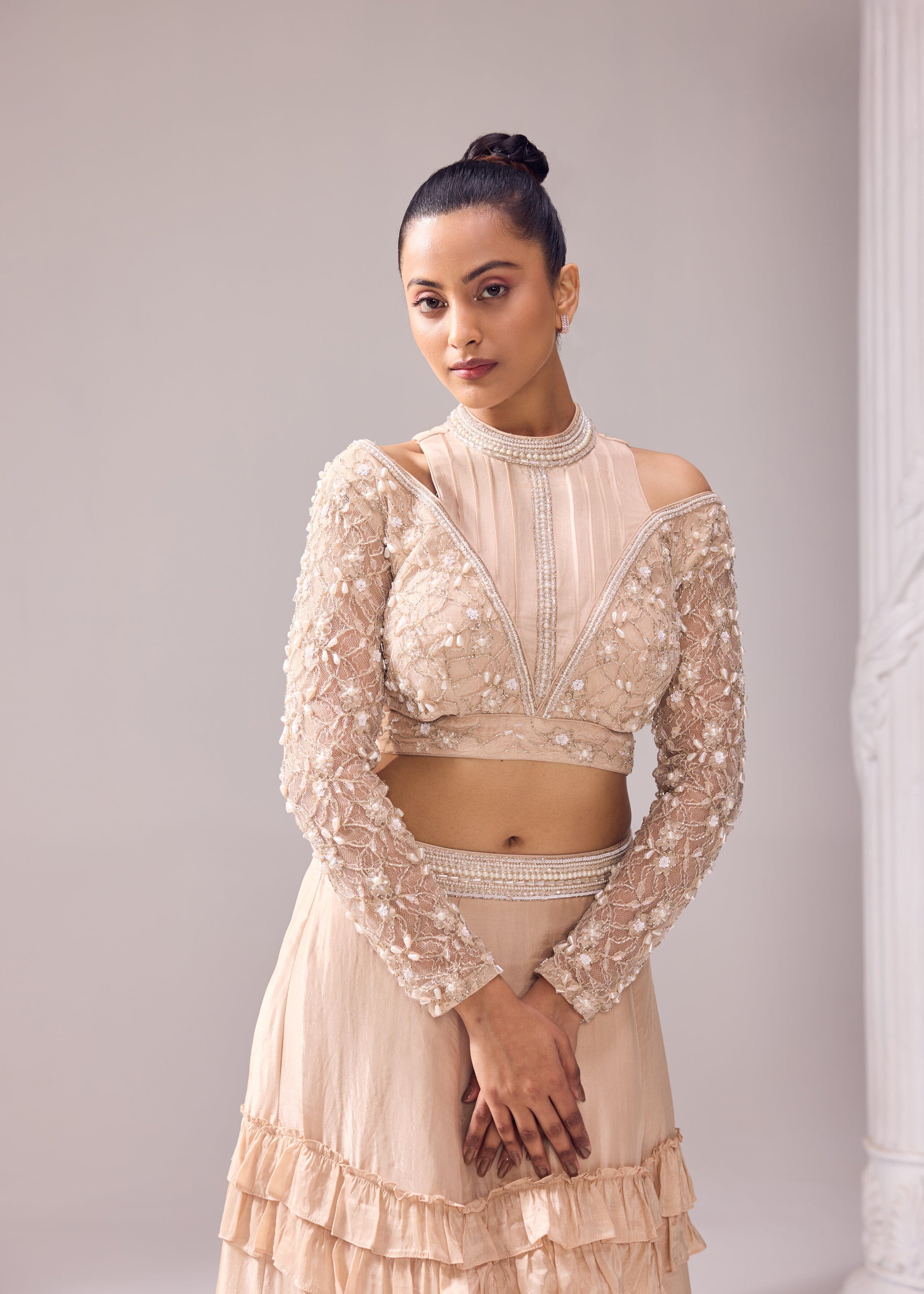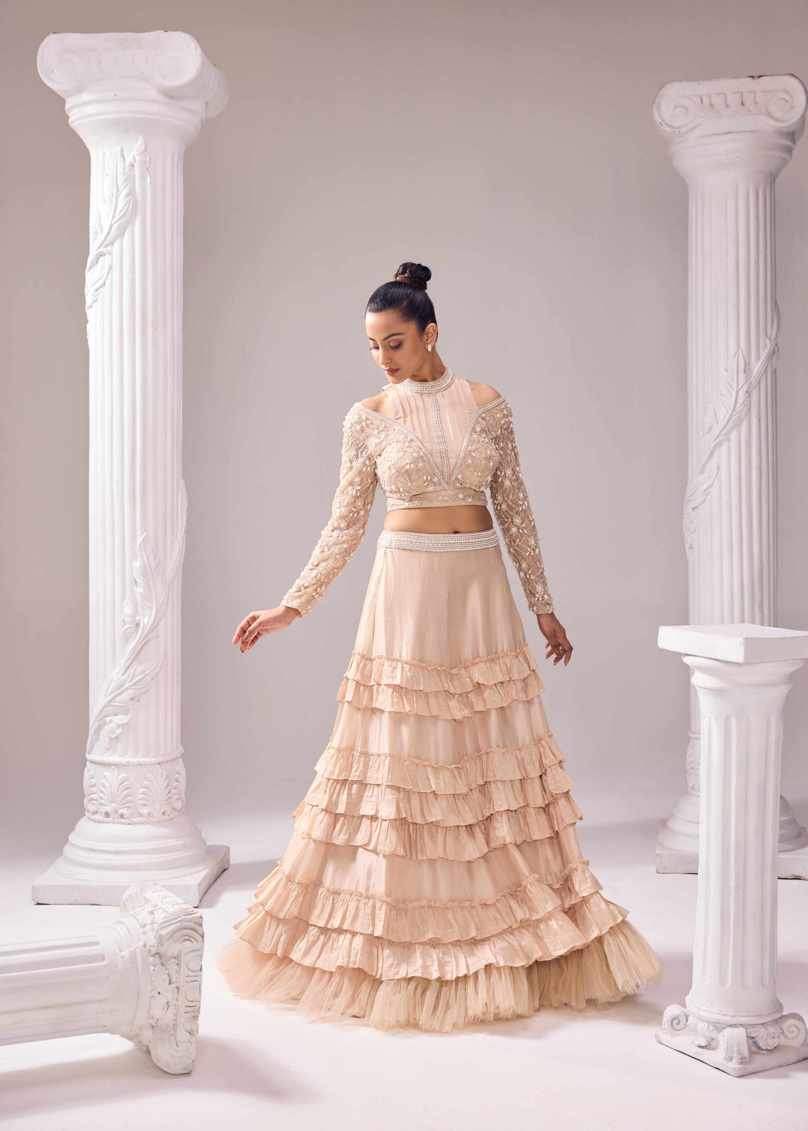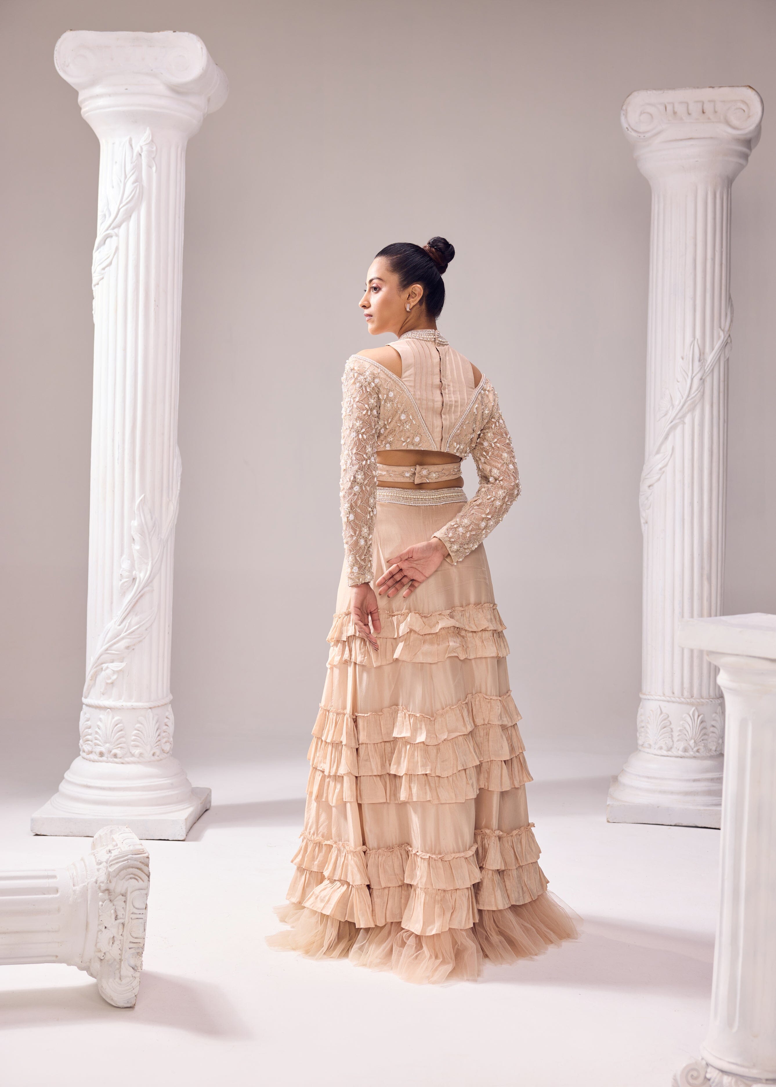 Serene, scintillating and sulty are all things that disbribe this jaw dropping outifit with a flattering silhouette. The skirt has a three tier ruffle detail complemented with a net ruffle at the bottom. The blouse has a halter neckline with a meticulously embroidred sleeves. The ensemble has both comfort and style hand in hand making it a cluster of art, luxury in a soothing hue along with feminine silhouettes and handcrafted creations.