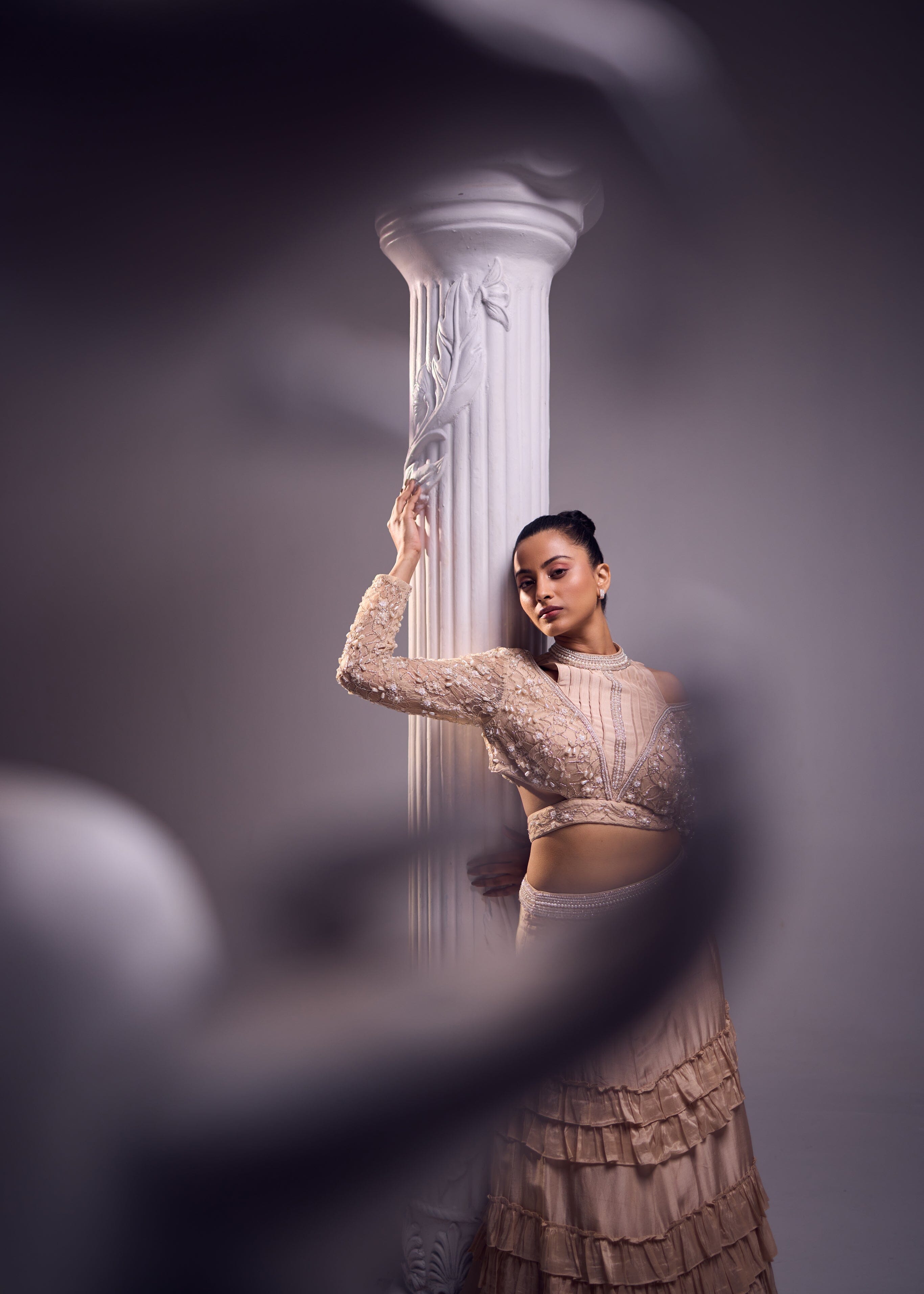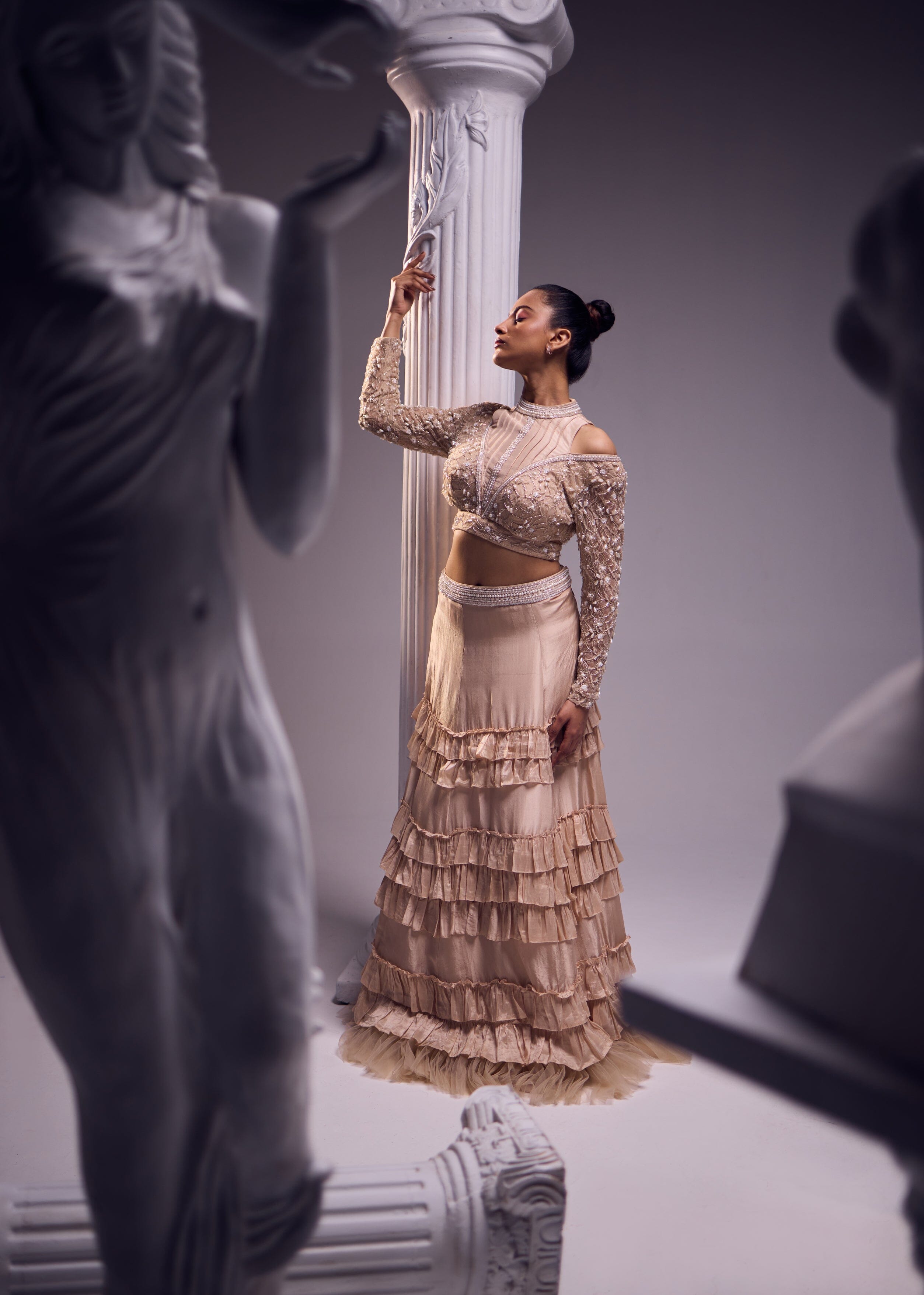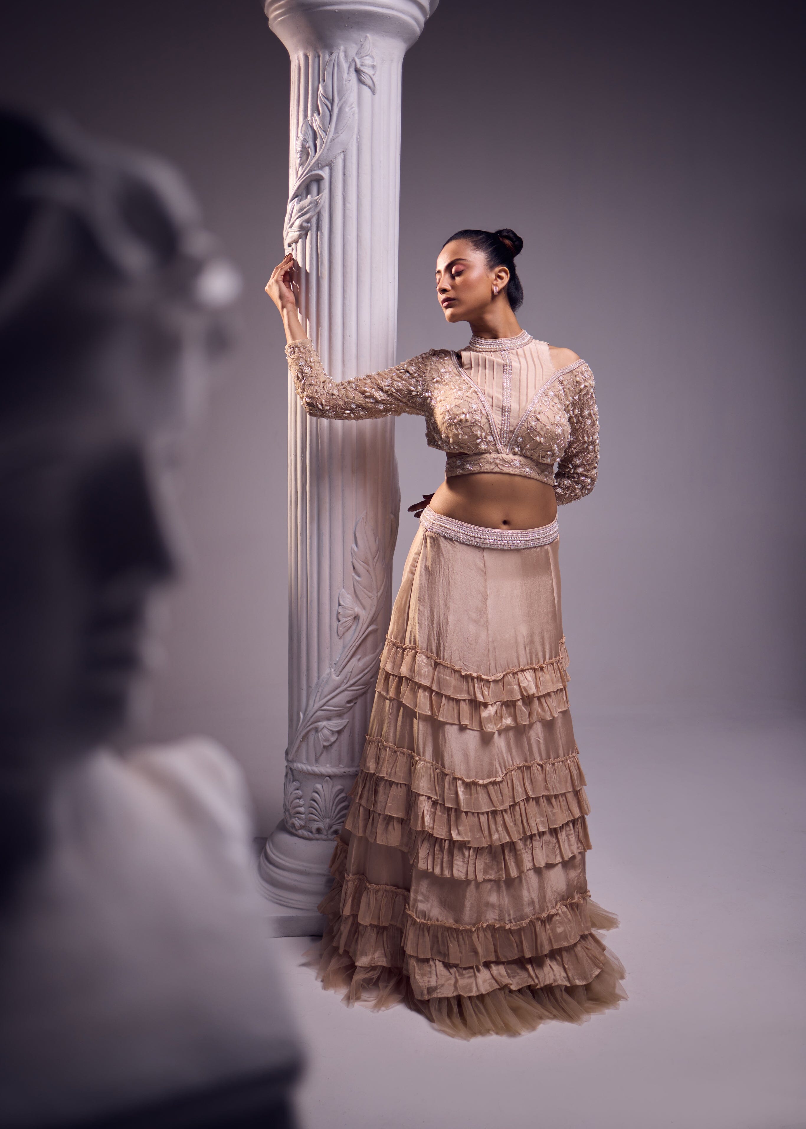 Serene, scintillating and sulty are all things that disbribe this jaw dropping outifit with a flattering silhouette. The skirt has a three tier ruffle detail complemented with a net ruffle at the bottom. The blouse has a halter neckline with a meticulously embroidred sleeves. The ensemble has both comfort and style hand in hand making it a cluster of art, luxury in a soothing hue along with feminine silhouettes and handcrafted creations.