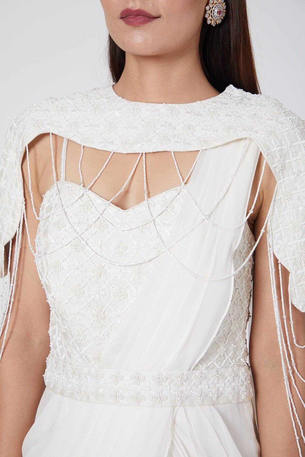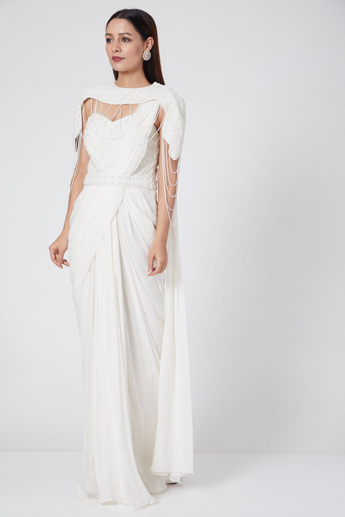 La prenda de primera ley hecha de capa sobre cortina blanca es simple pero elegante. Los intrincados adornos de la capa se suman a la sofisticación del conjunto, confeccionado con seda y georgette.