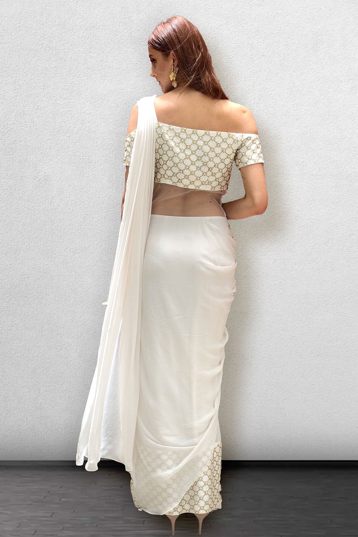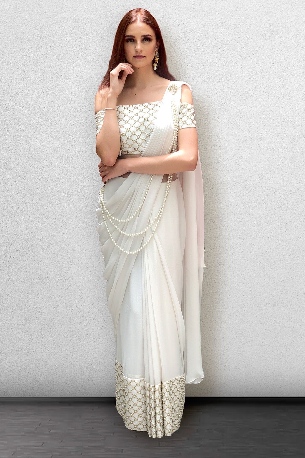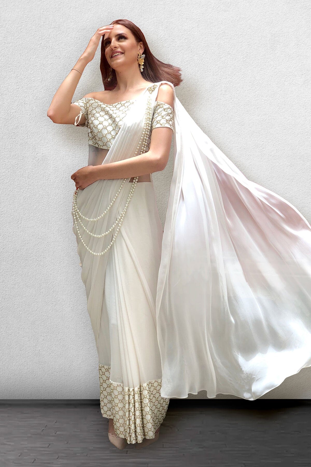 El sari drapeado de color blanquecino, con adornos a lo largo del borde inferior, está hecho de georgette y seda. Junto con una blusa elegantemente adornada con perlas y bordados de Cutdana.