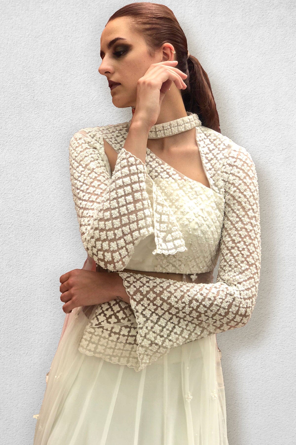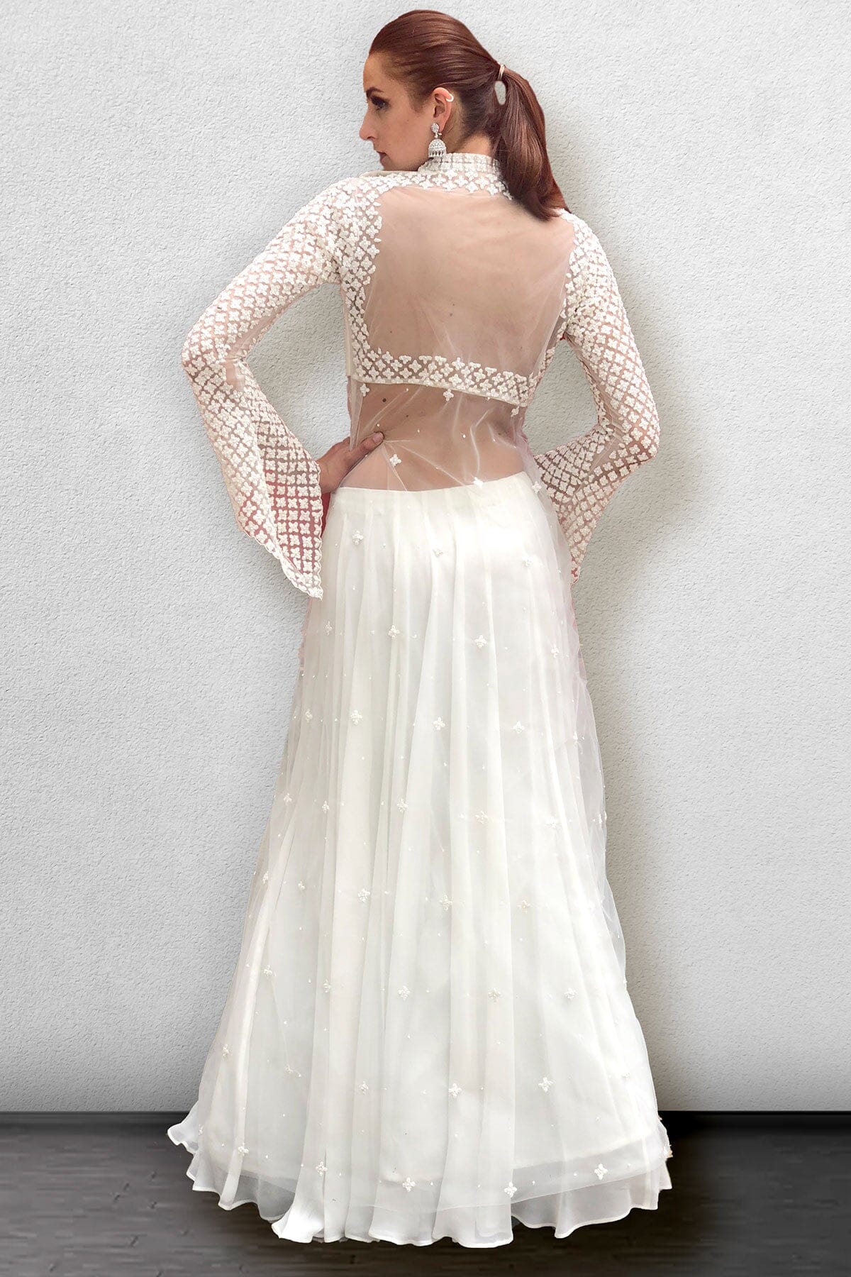 La falda y la capa de color blanco roto están confeccionadas en georgette y tejido de red. El elegante conjunto es elegante pero sofisticado.