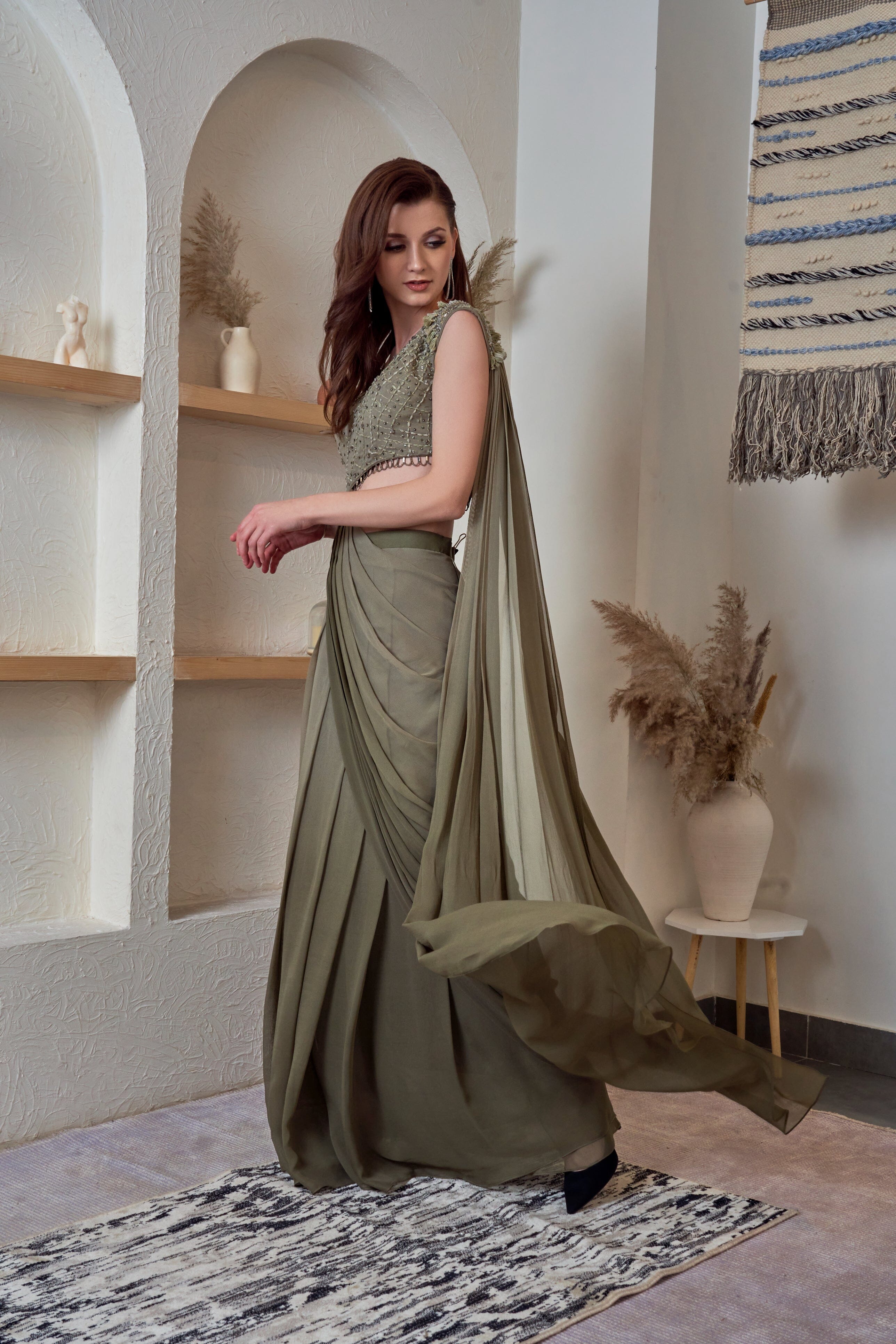 Abrace el encanto del atemporal drapeado sombrío de un solo hombro incrustado con apliques brillantes. Confeccionado a mano con la máxima precisión, el detalle del hilo de ancla en la cintura le aporta un toque femenino y moderno. El trabajo y la tela son una mezcla de Georgette, Anchor Thread, Zari, Crystal, Sequence y Moti.