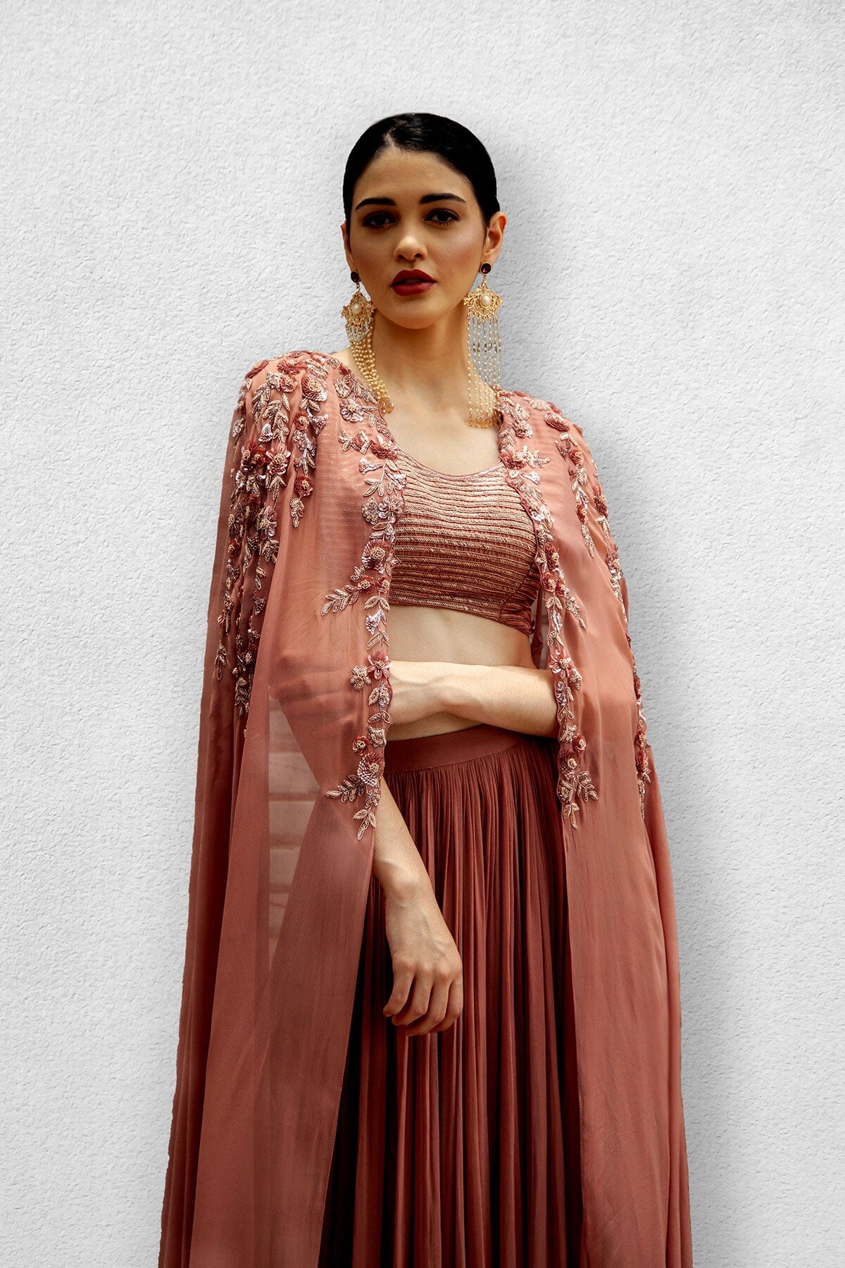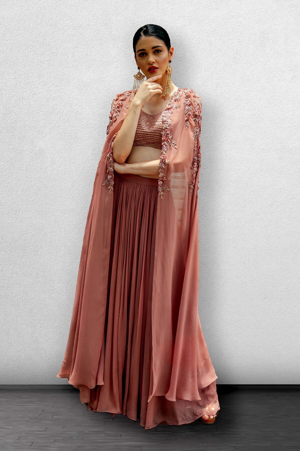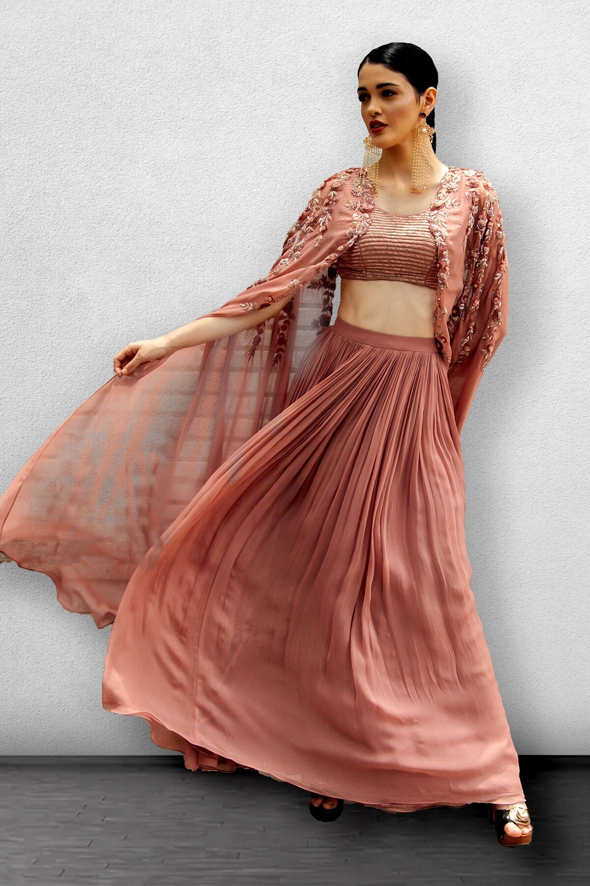 Blusa dupion adornada en rosa cebolla con capa adjunta adornada con Georgette y falda con frunces.