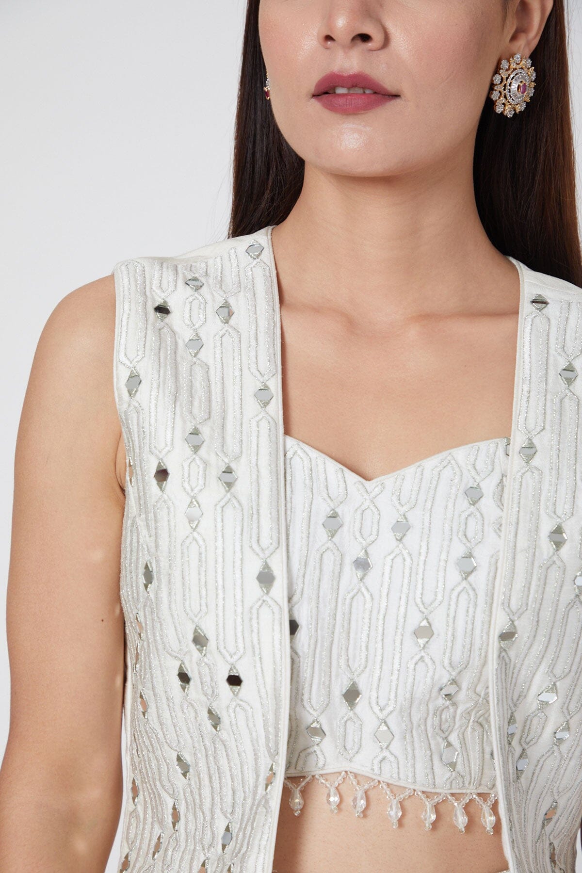 Pantalones pitillo con abertura central con chaqueta y top corto estilo espejo.