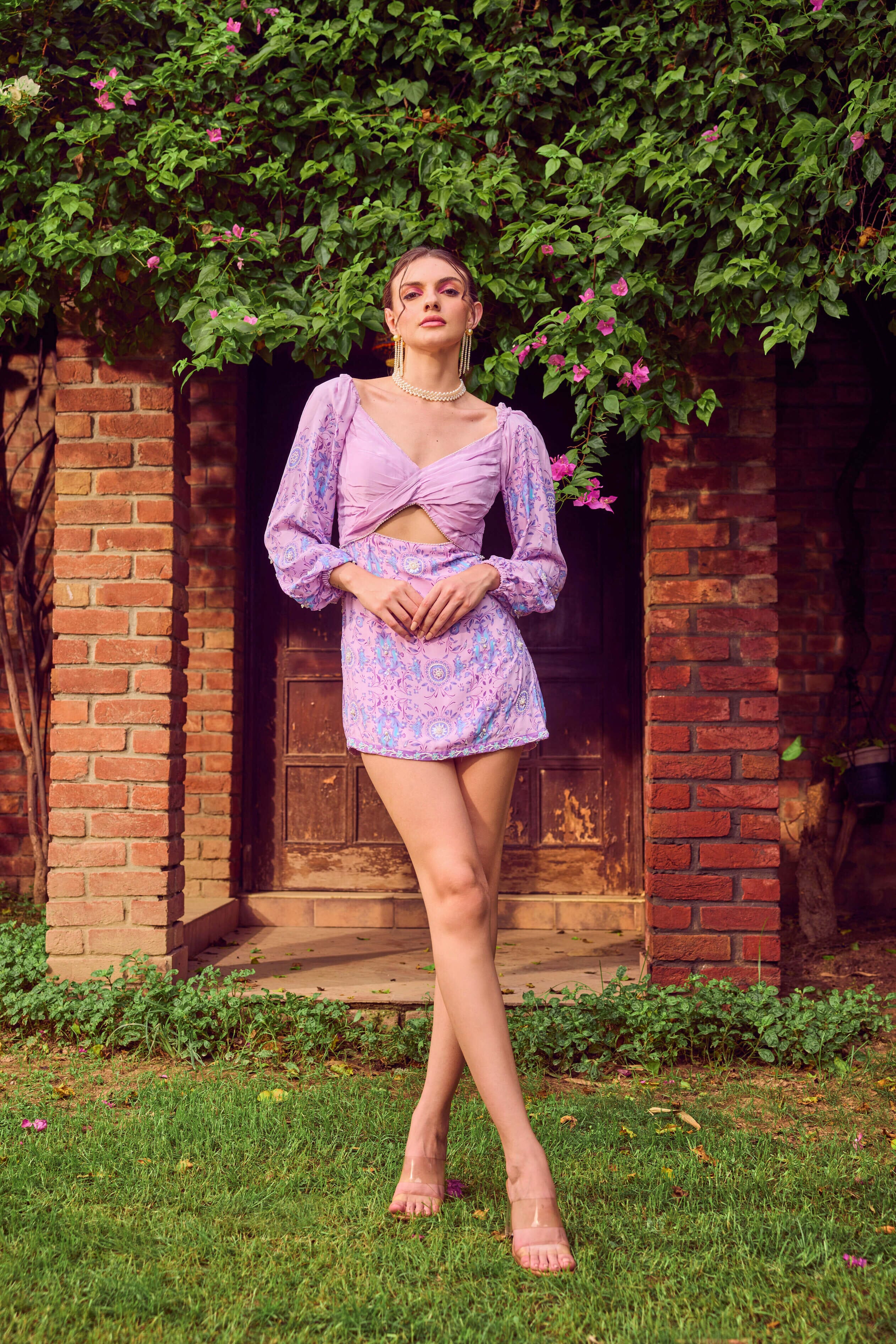 This ensemble is all about a sophisticated blend of the timeless classic with soothing hues and intrinsic craftsmanship. This ensemble comprise of a little dress with balloon sleeves with a pearl neckline detailing.