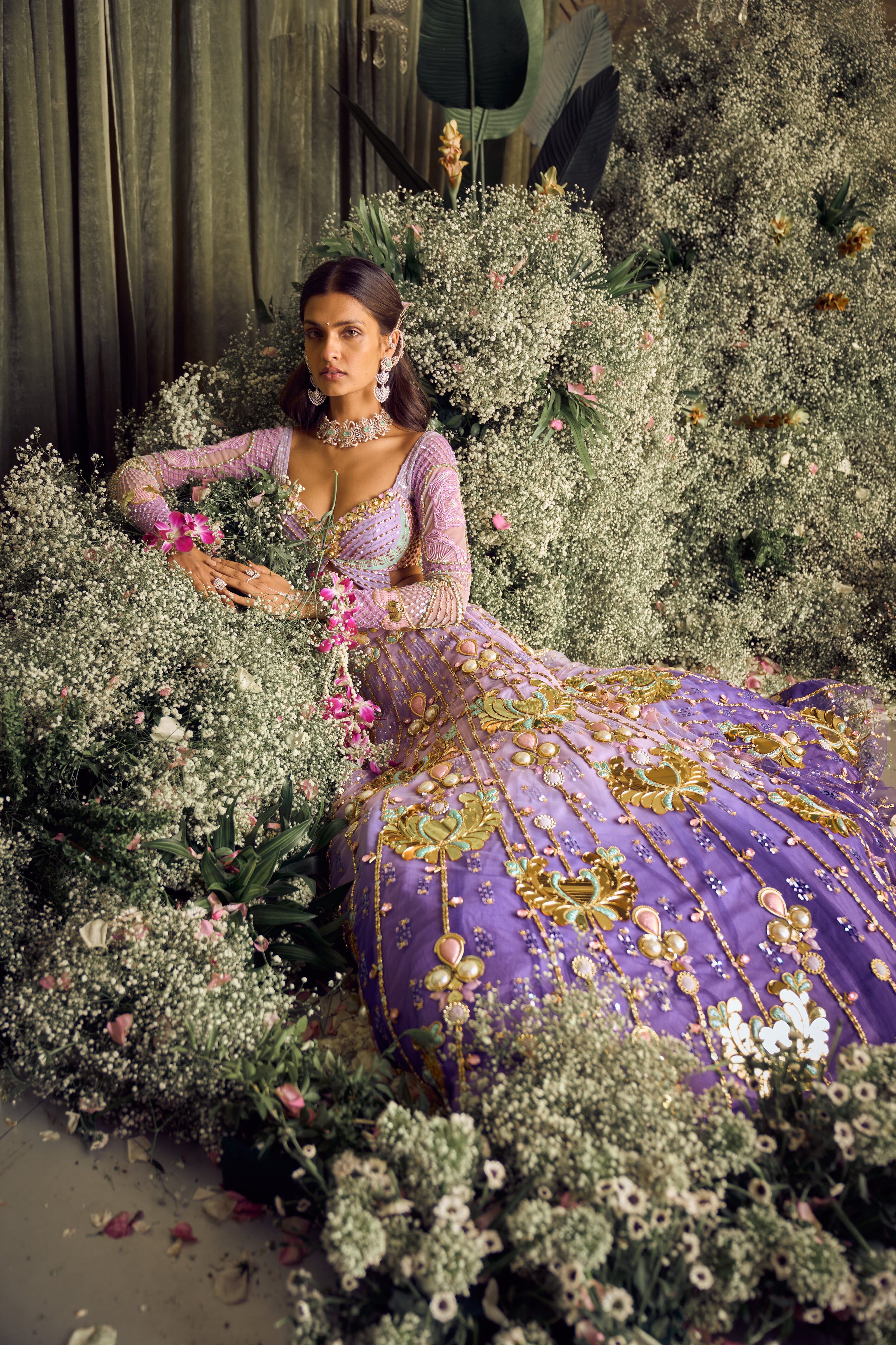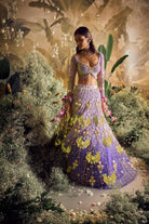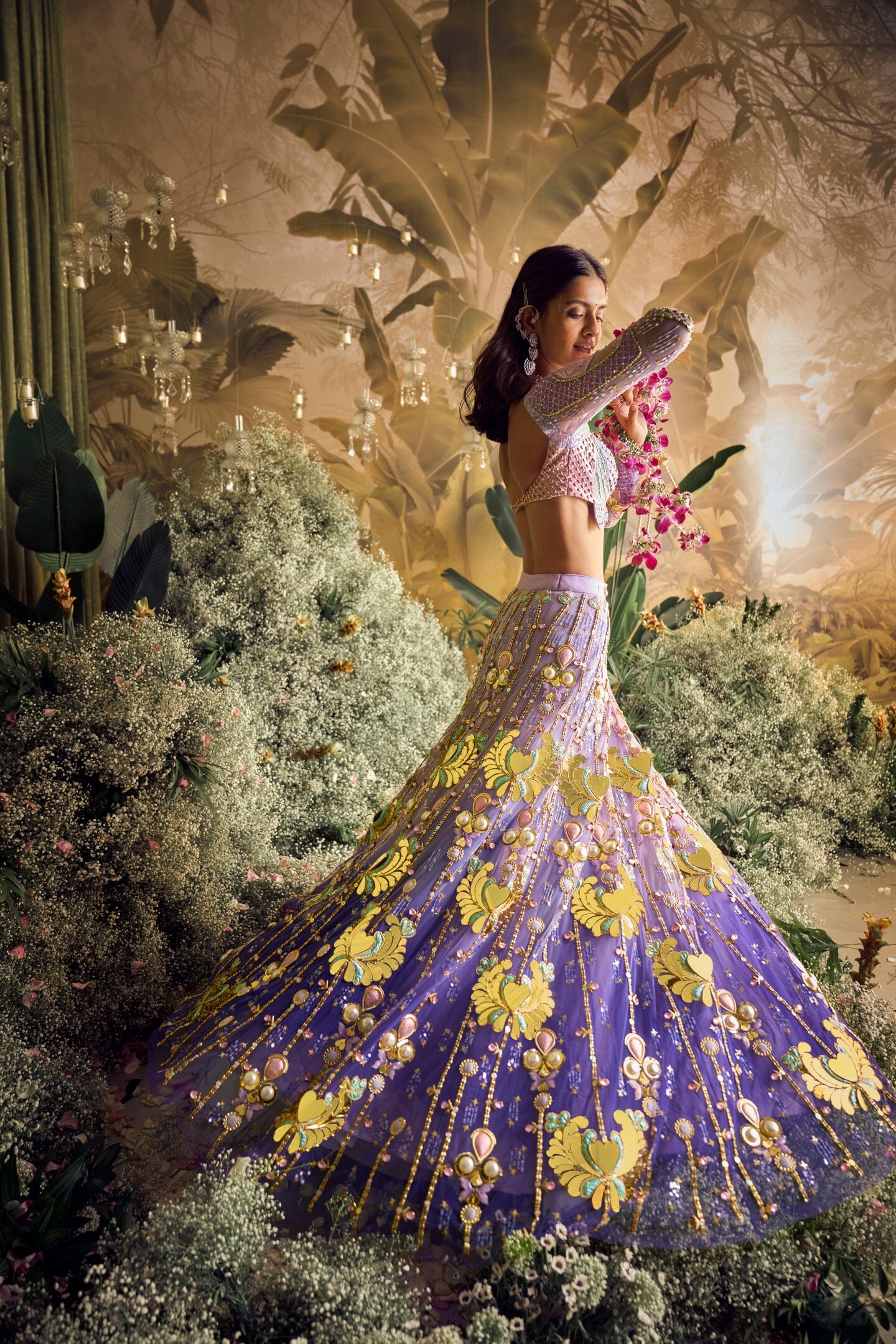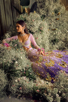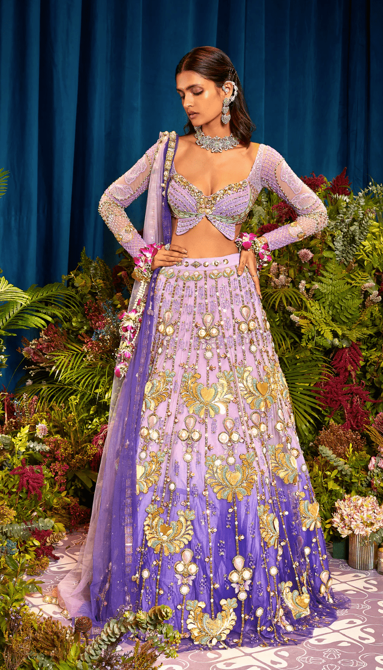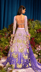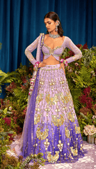 Step into a world of enchantment with our Shaded LILAC Tulle Lehenga Set - a spellbinding fusion of colors and textures. Watch as custom cut acrylic pieces, gold metal embellishments, and rich fabric appliques come together to create a truly mesmerizing design. Paired with our signature butterfly full-sleeved blouse in lilac silks, and a delicately embroidered tulle dupatta that glistens with metals, pearls, and sequins. Get ready to dazzle and make a statement on your special day!"