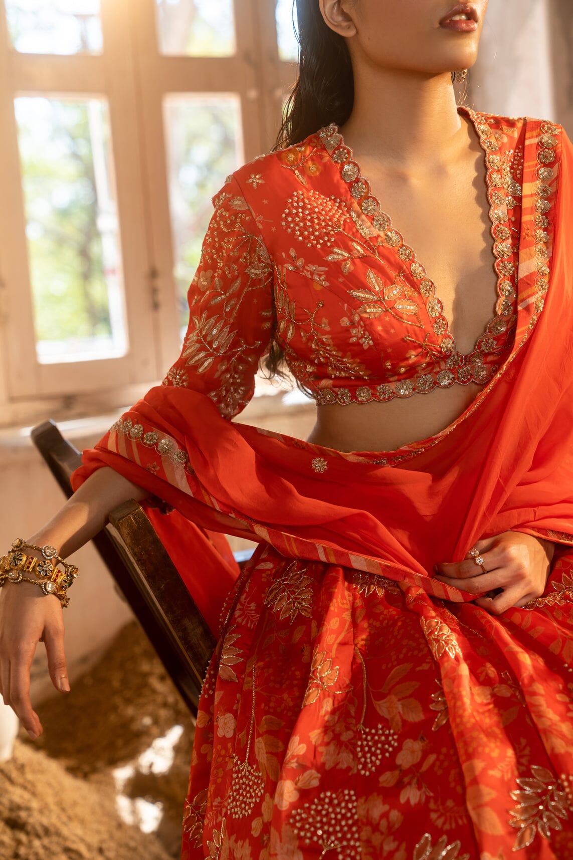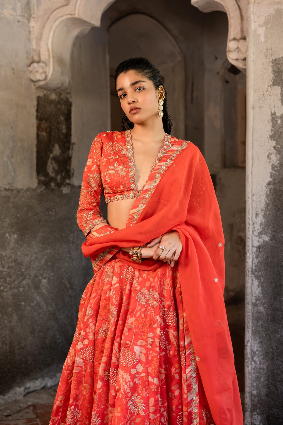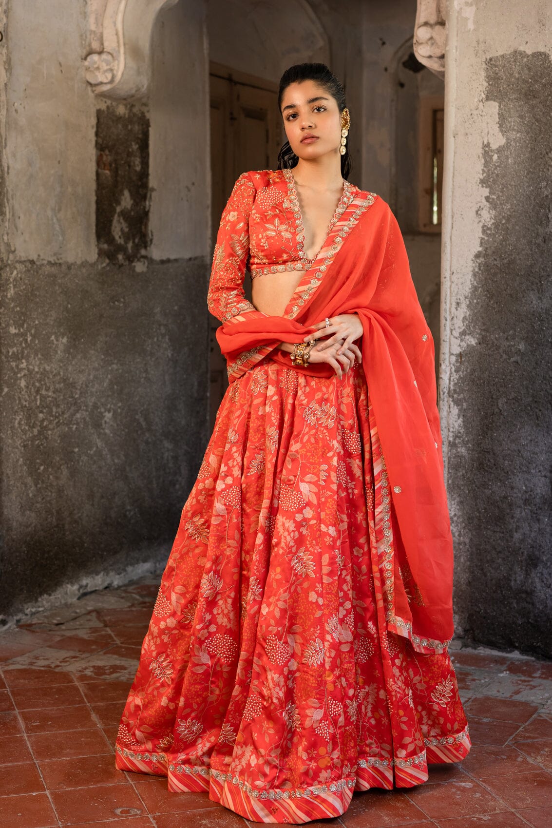 A tomato red printed embroidered lehenga with a deep V-neck blouse and organza dupatta with handwork border and buttis.A tomato-red embroidered lehenga with a V-neck blouse and a dupatta.