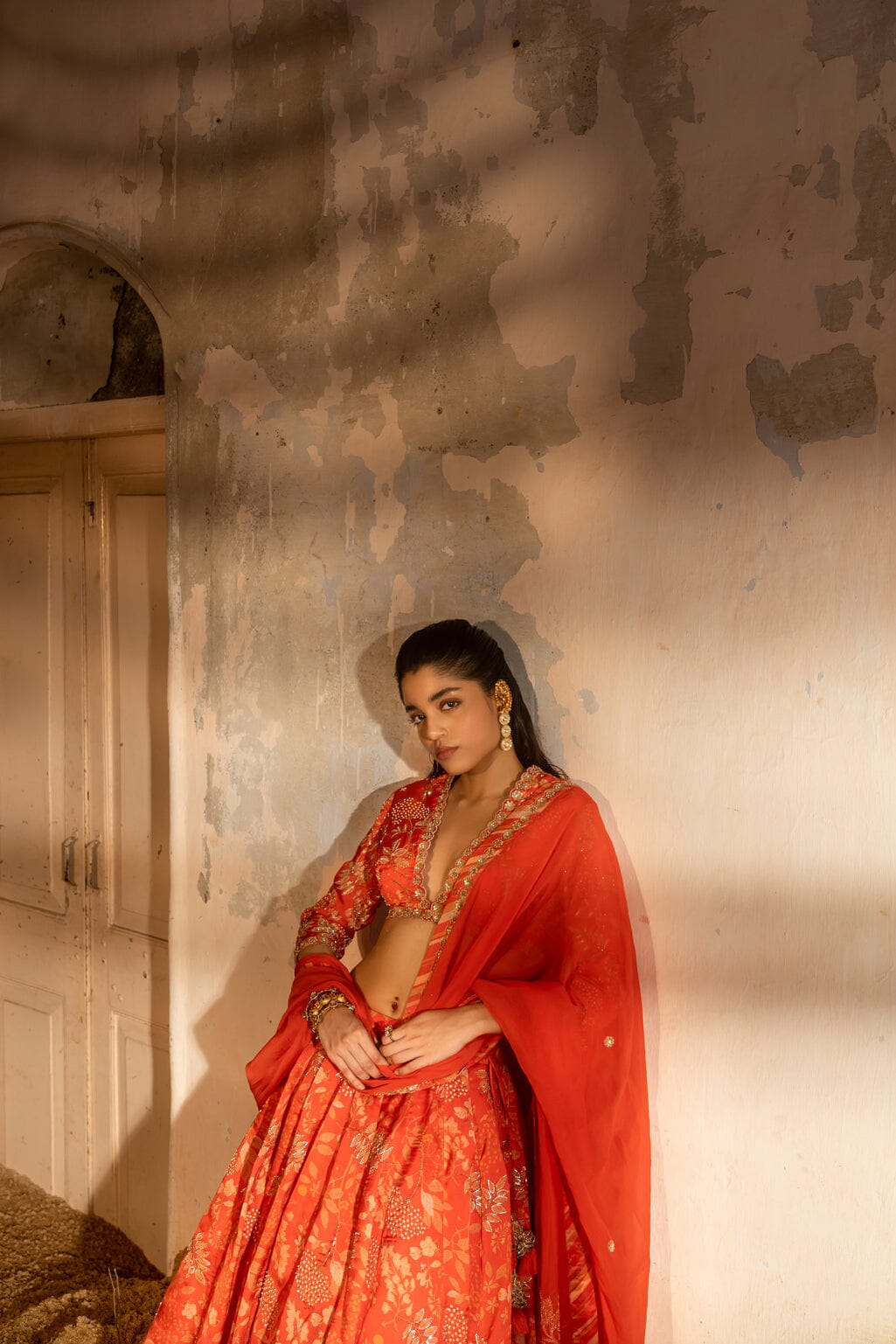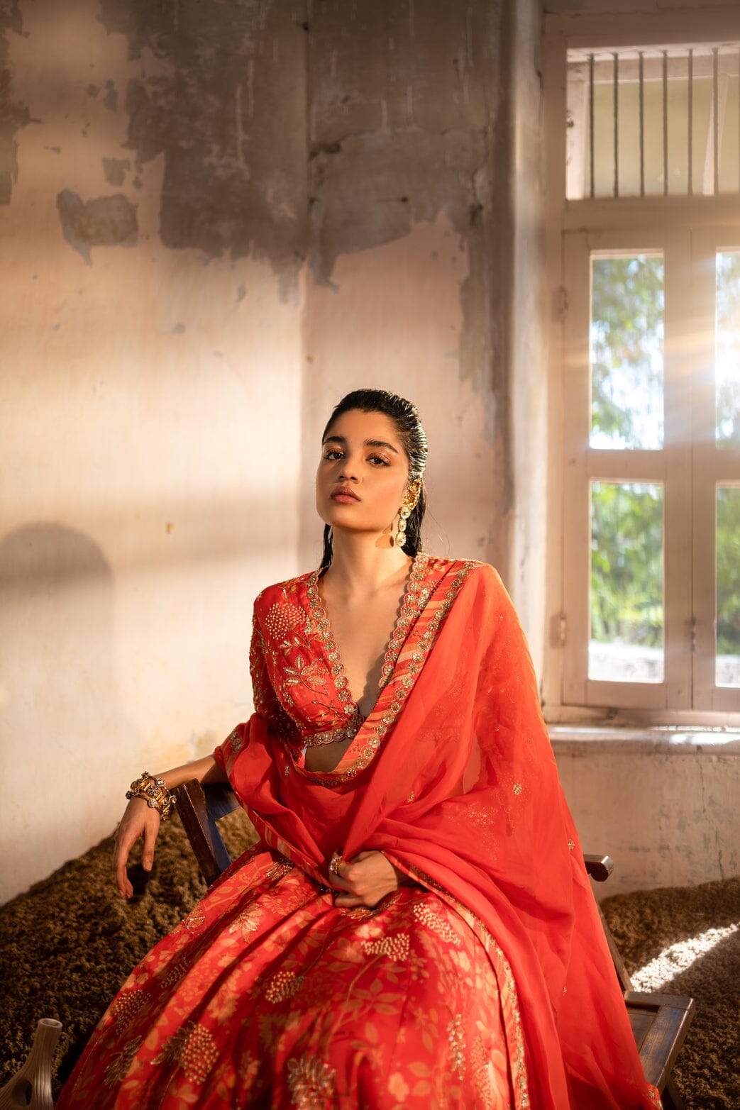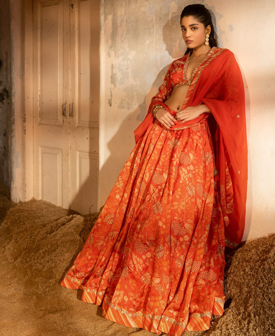 A tomato red printed embroidered lehenga with a deep V-neck blouse and organza dupatta with handwork border and buttis.A tomato-red embroidered lehenga with a V-neck blouse and a dupatta.