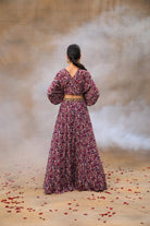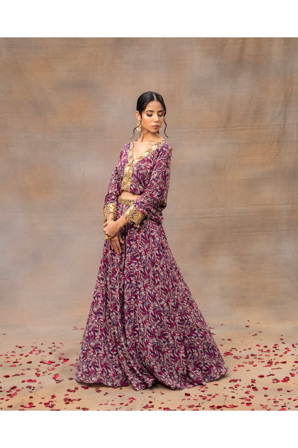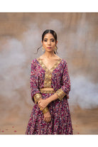 Prepárate para robar el centro de atención en la boda de tu mejor amigo con nuestro impresionante top con mangas de murciélago con estampado geométrico morado adornado con intrincados bordados dorados en el centro del frente y los puños. Combinado con una falda lehenga ligera y fluida, este conjunto garantiza una entrada espectacular. Gira y captura esos bumeranes perfectos mientras bailas toda la noche cómodamente, creando recuerdos que durarán toda la vida. Abraza la elegancia y la facilidad con este conjunto único.