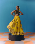 The Sunset Lehenga: Crepe Lehenga skirt paired with a lame' blouse and Organza dupatta . Embelished with hand embroidered sequin and pearls.