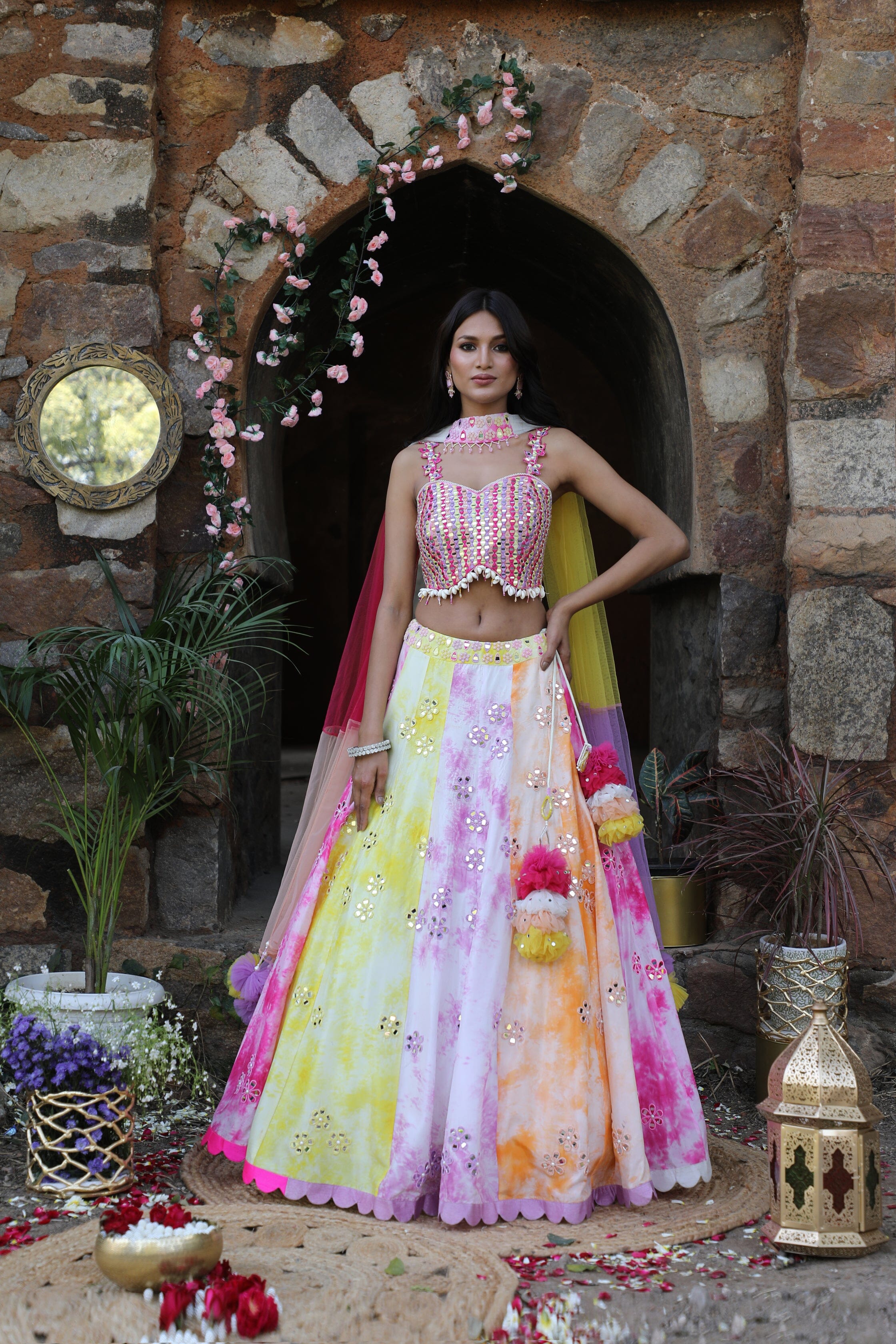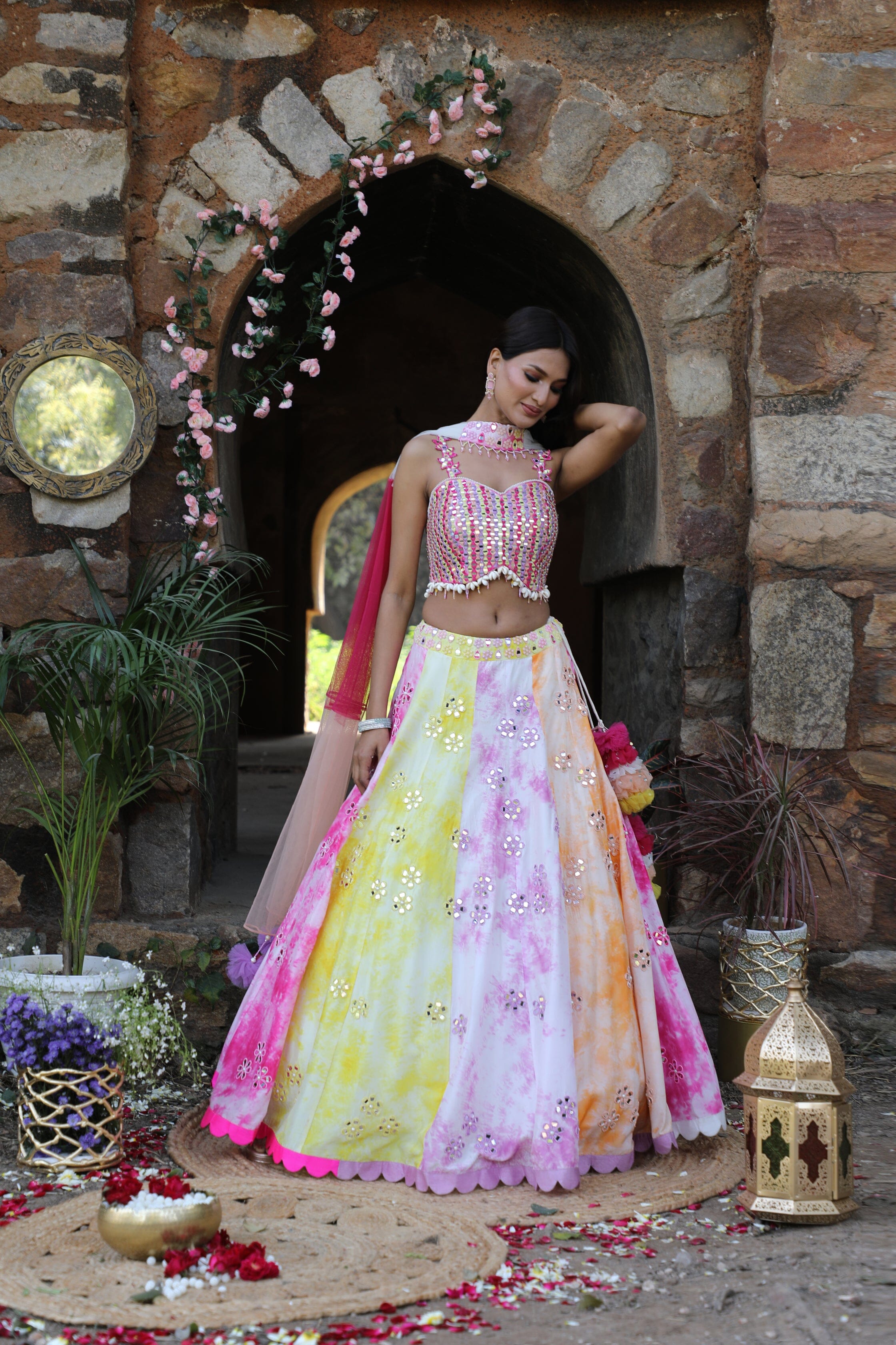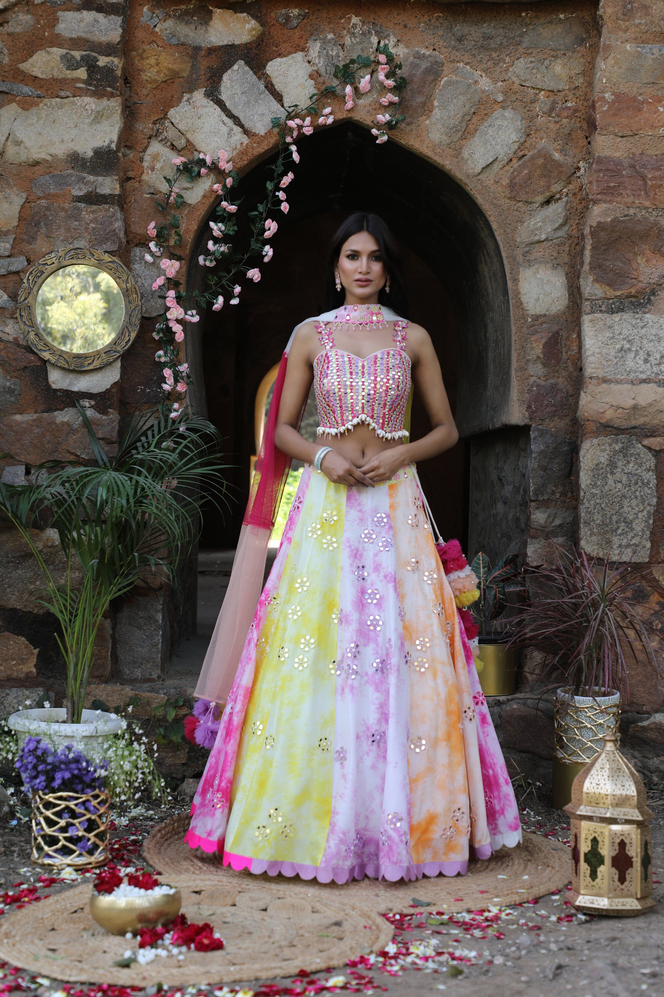 Conjunto Lehenga Tie-Dye Melocotón con Gargantilla Dupatta