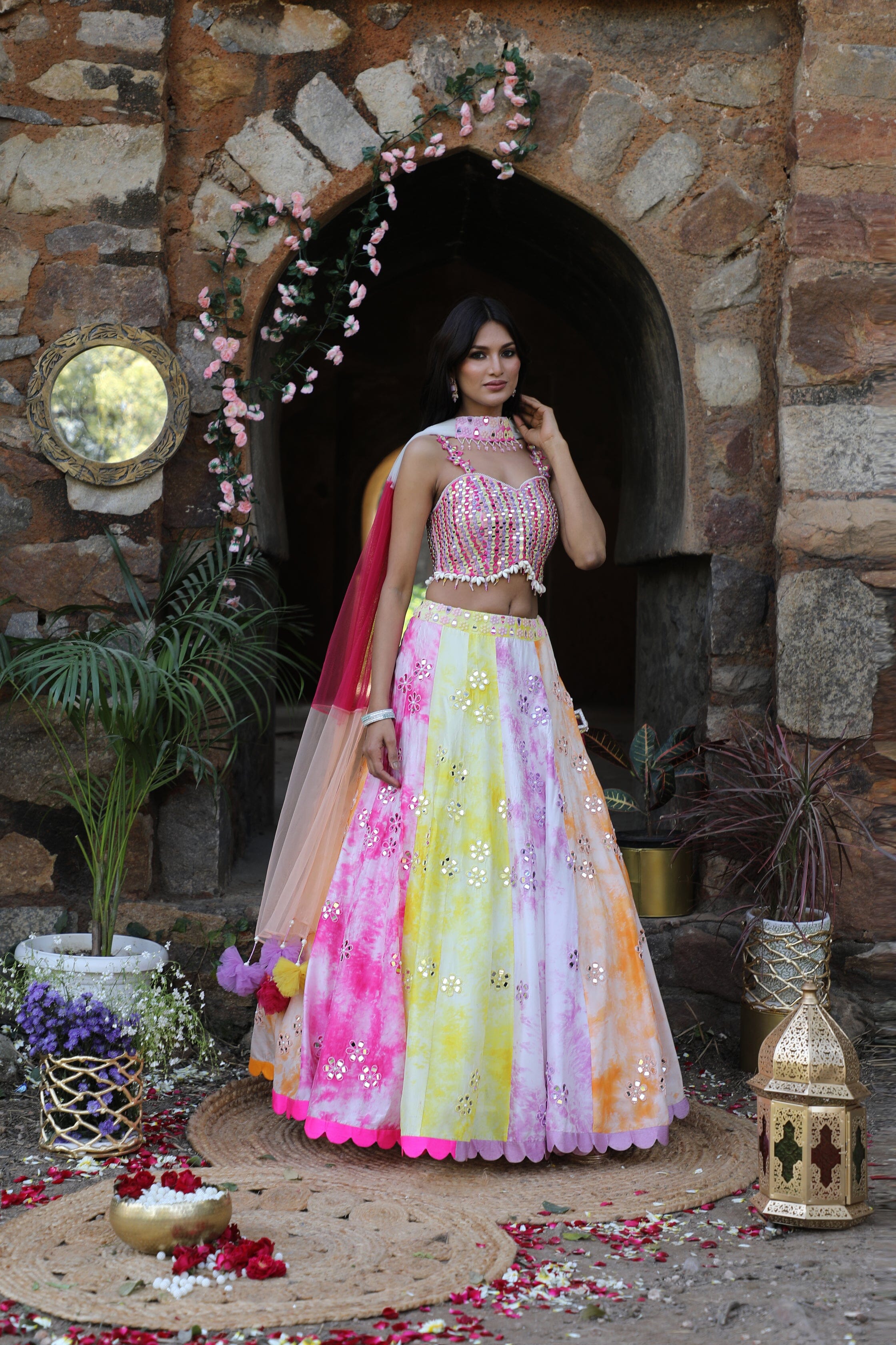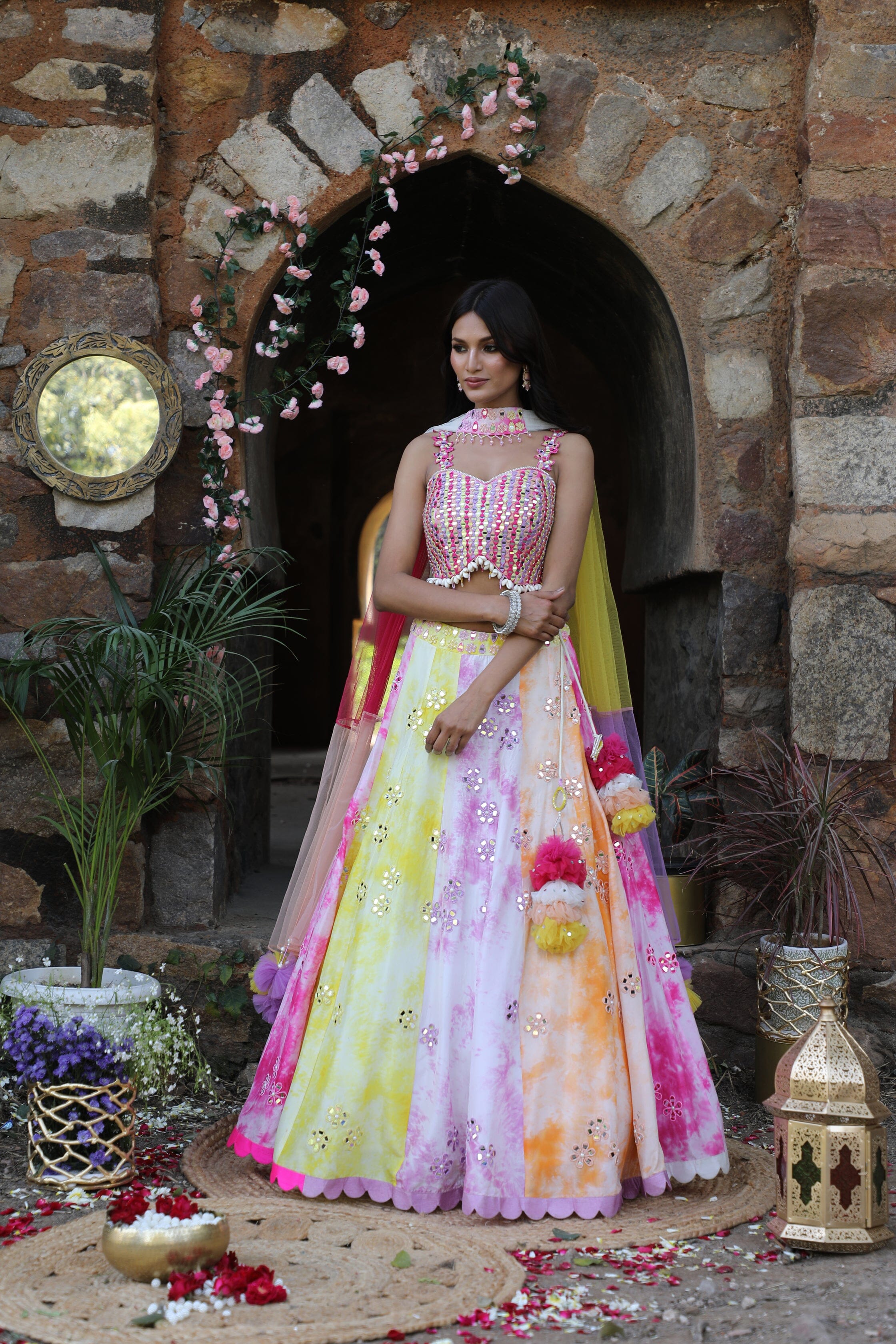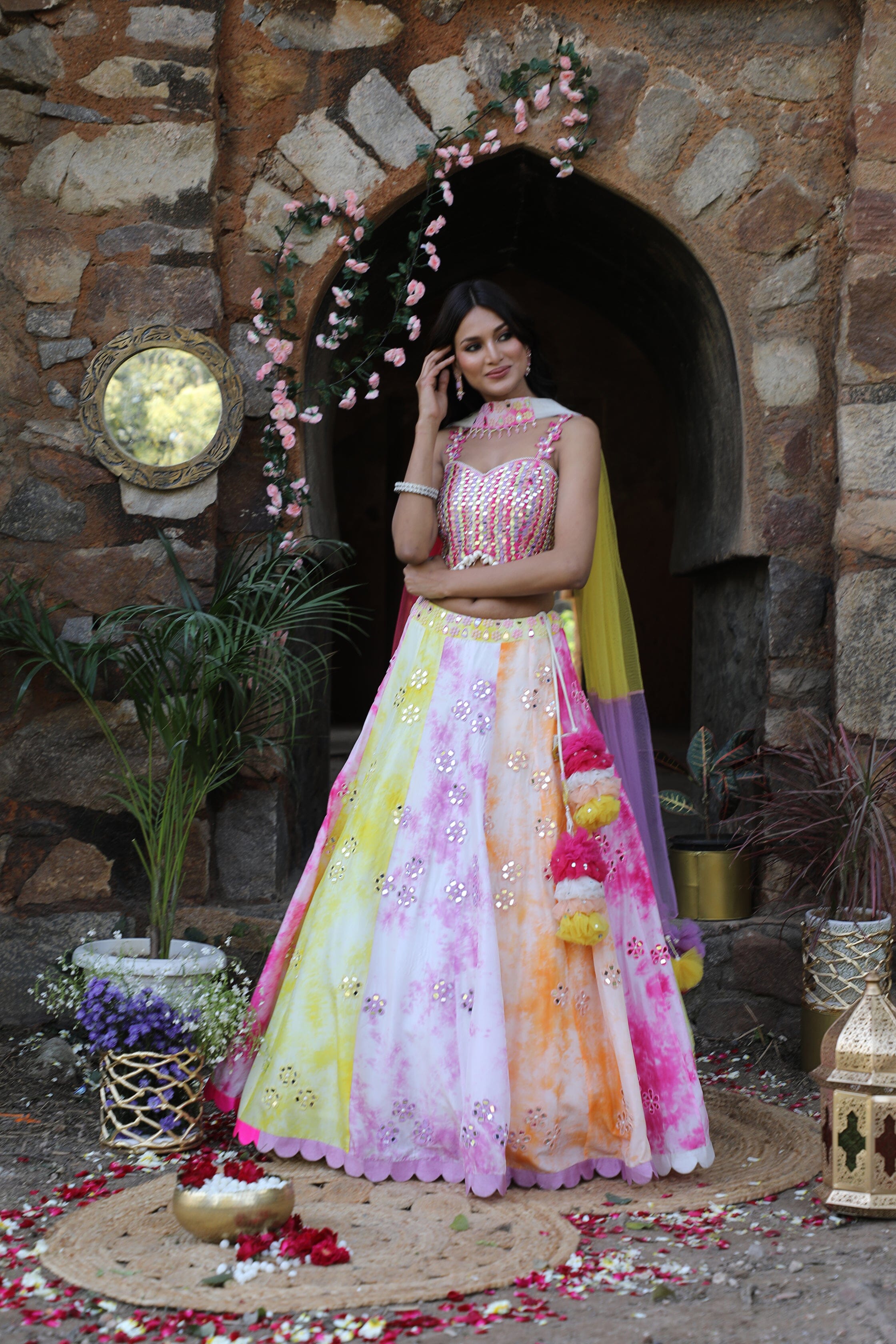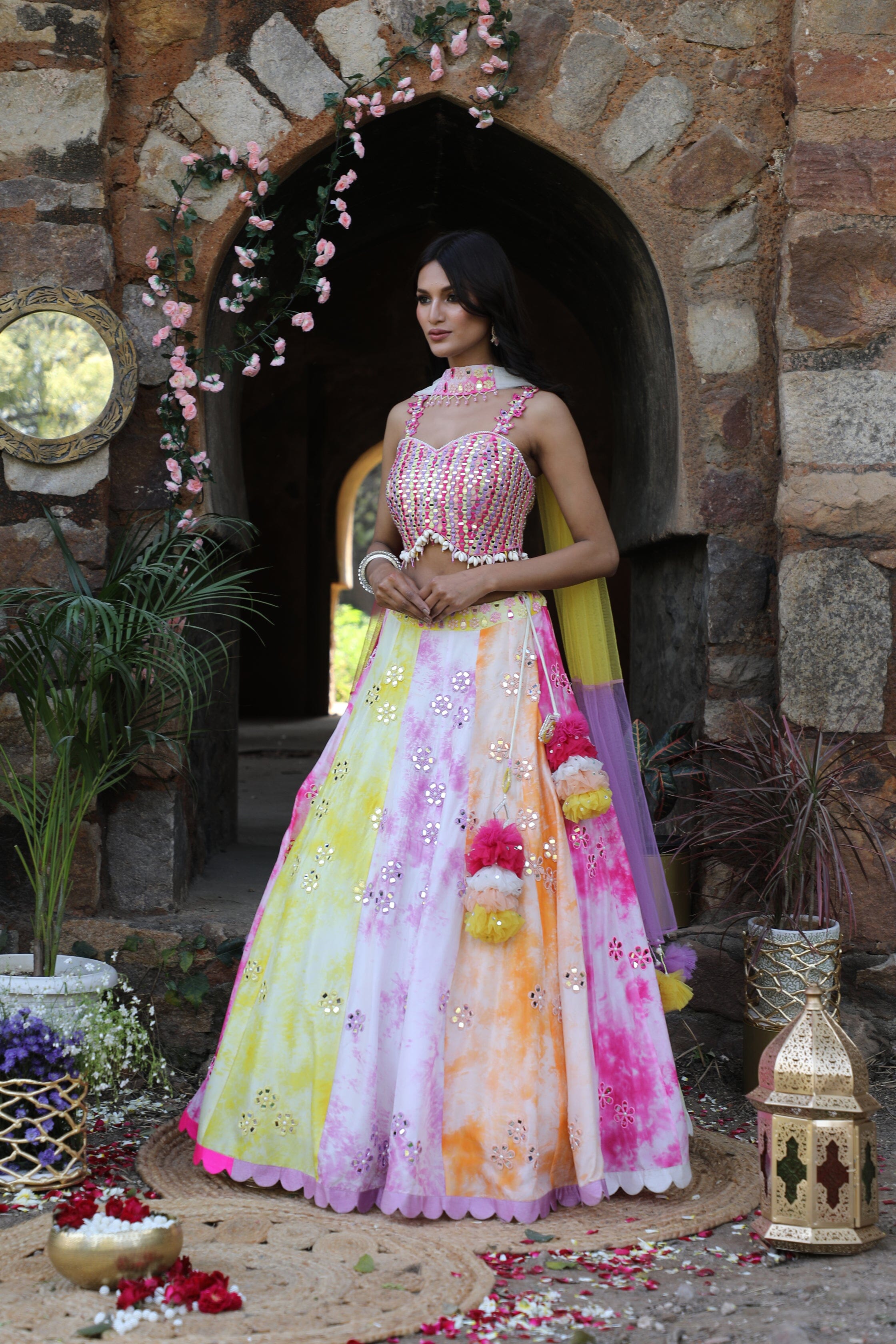 Conjunto Lehenga Tie-Dye Melocotón con Gargantilla Dupatta