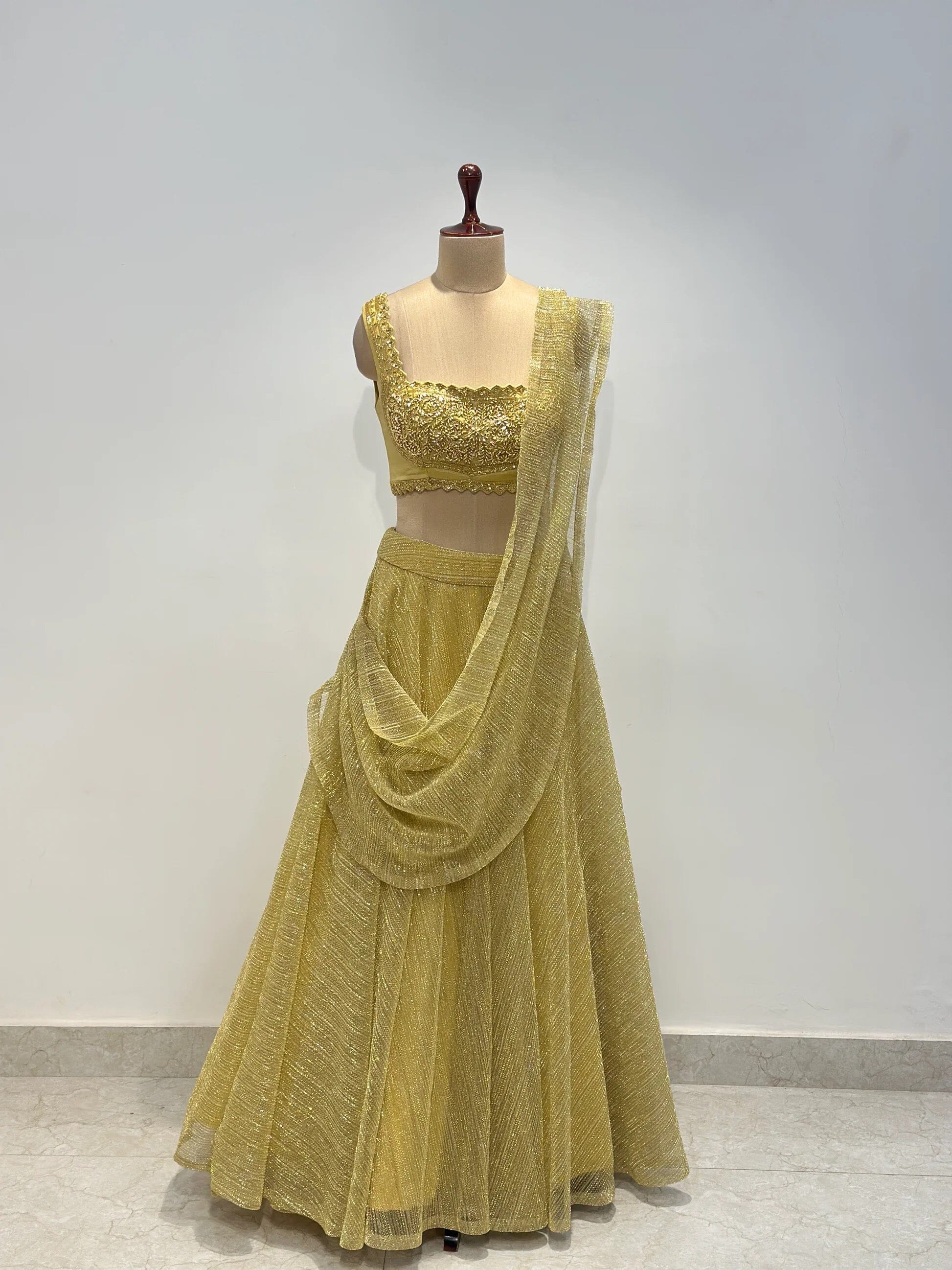 Yellow Floral Print Draped Lehenga ( Set of 3 )