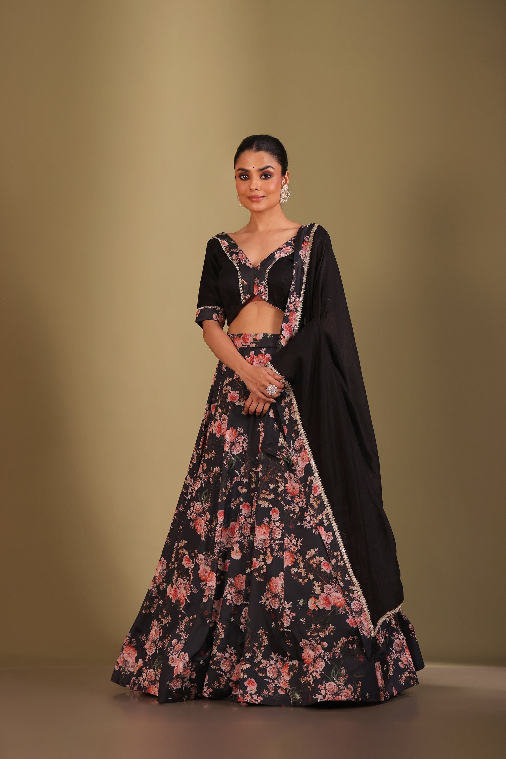 Gulzar Black Floral Printed Blouse With Lehenga And Dupatta Set of 3