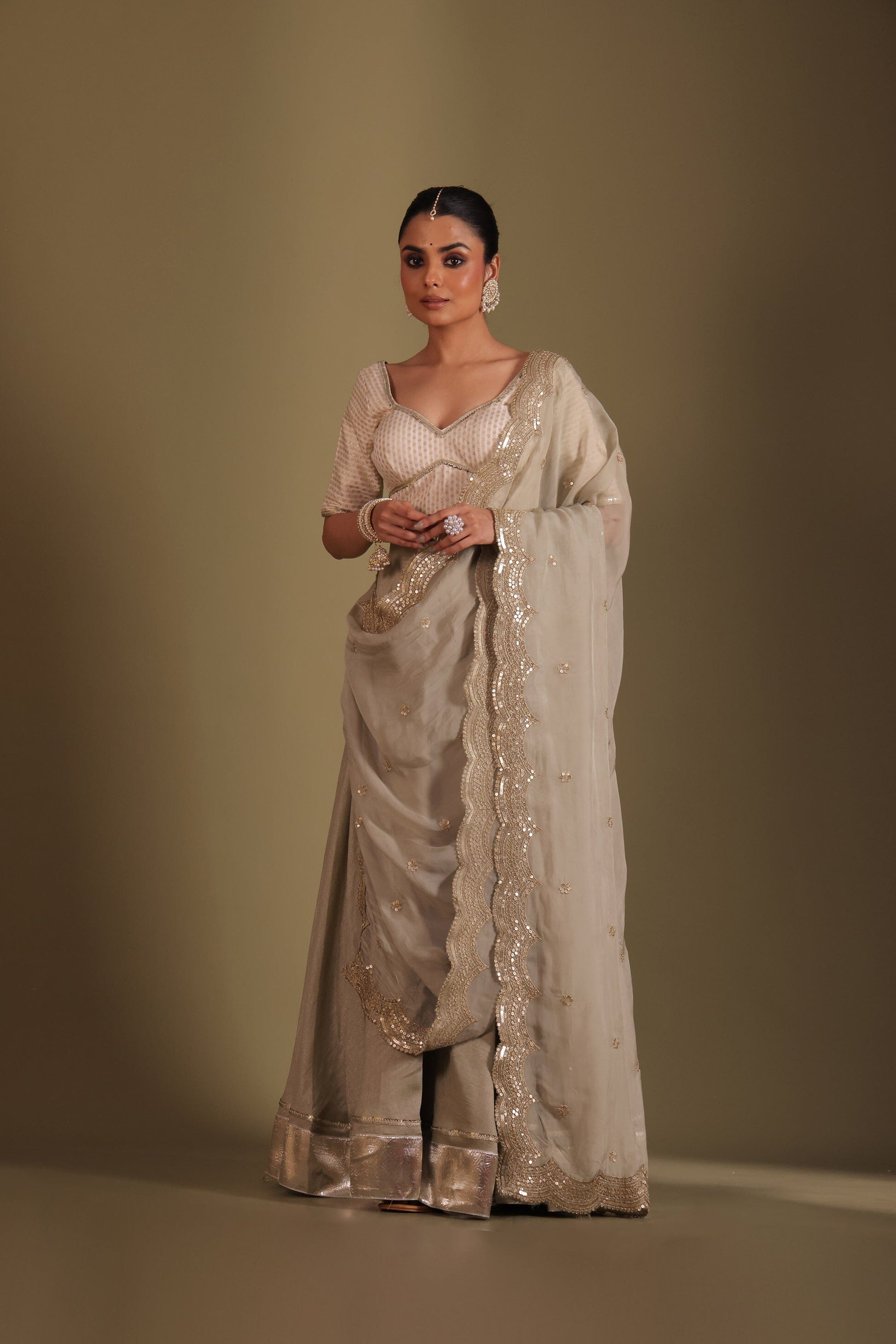 White Floral Hand Embroidered Organza Lehenga ( Set of 3 )