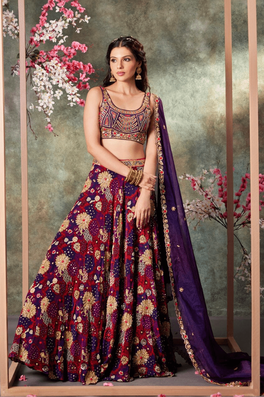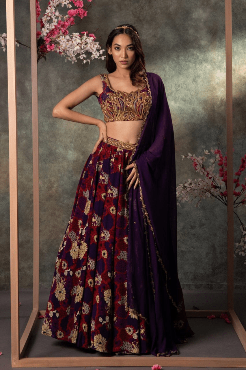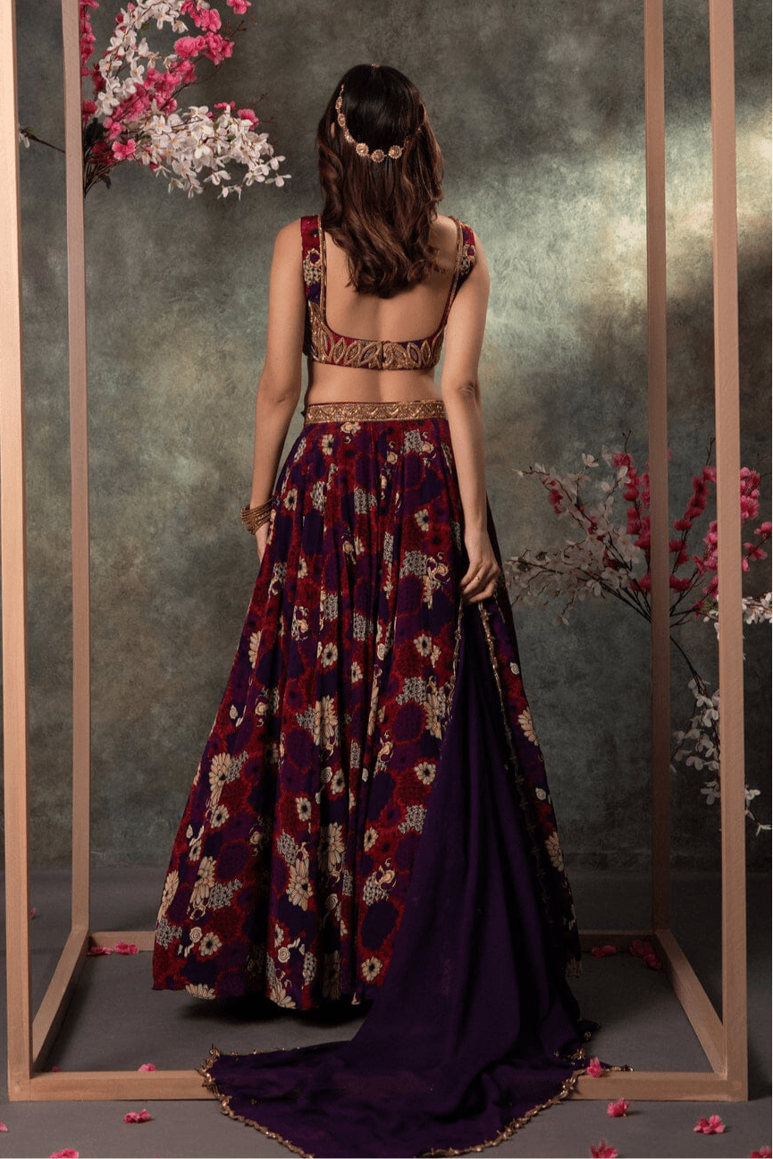 Purple Printed Panel Top And Lehenga Set With Embroidery