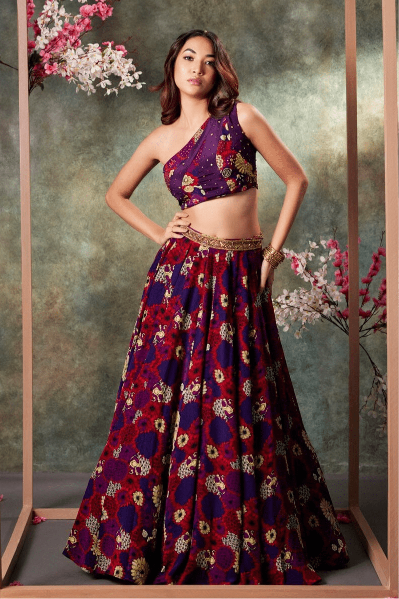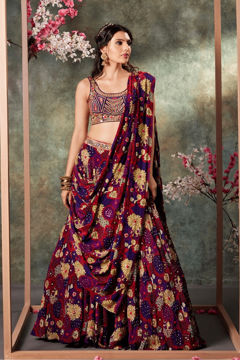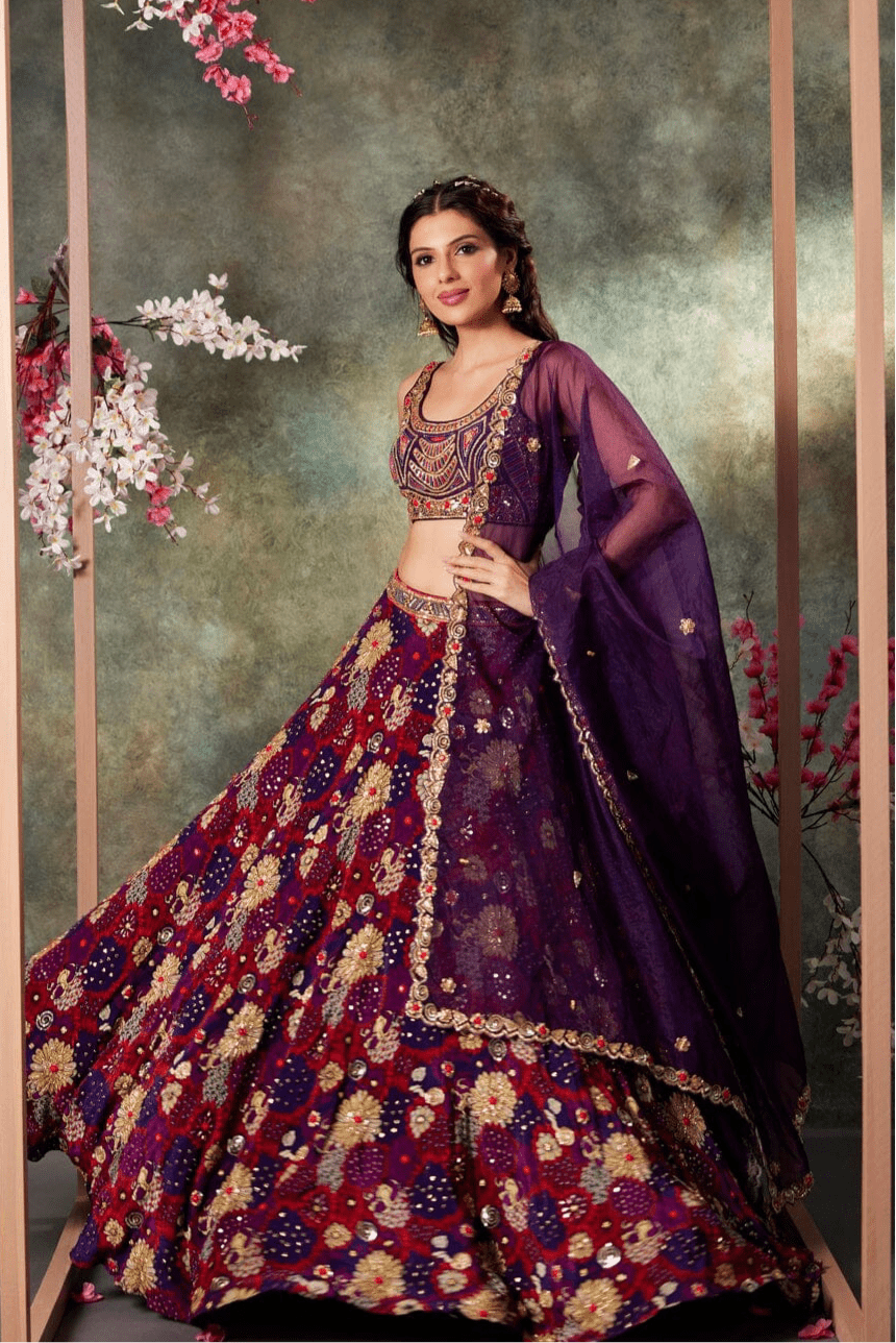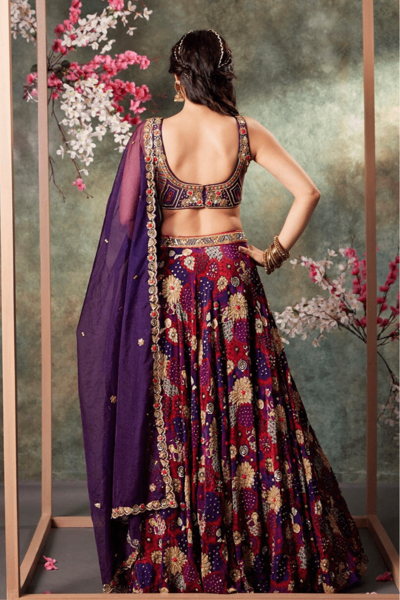 Purple Printed Panel Top And Lehenga Set With Embroidery