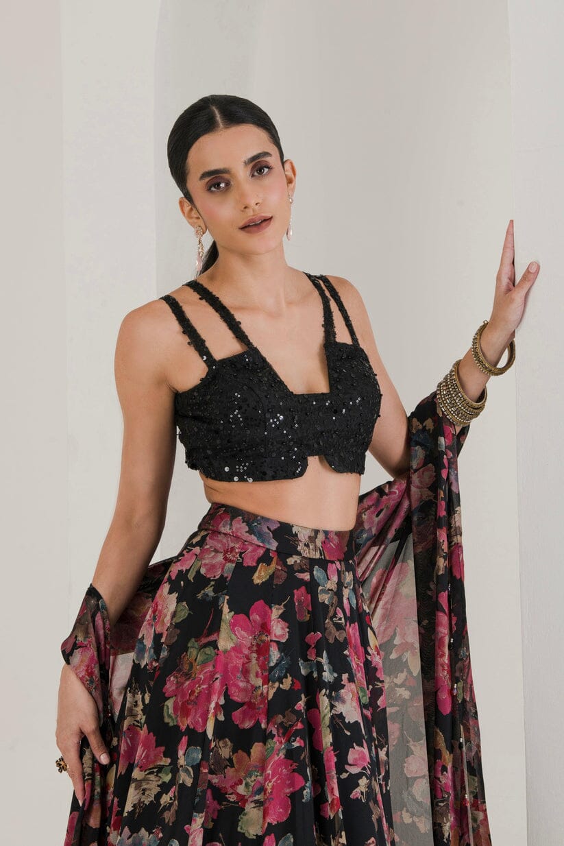 Black floral Print Lehenga With Cape ( Set of 3 )