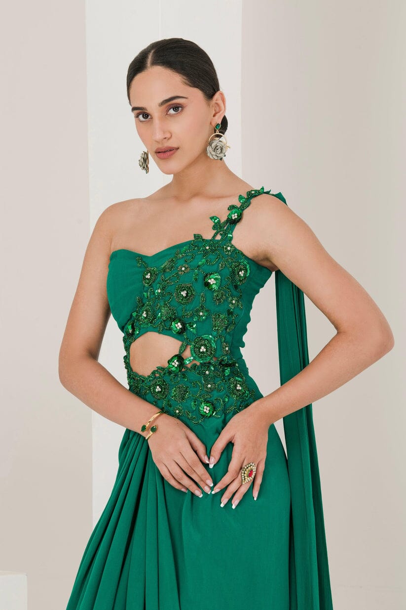 Bottle Green Hand Embroidered Pre Stitched Saree(Set of 2)