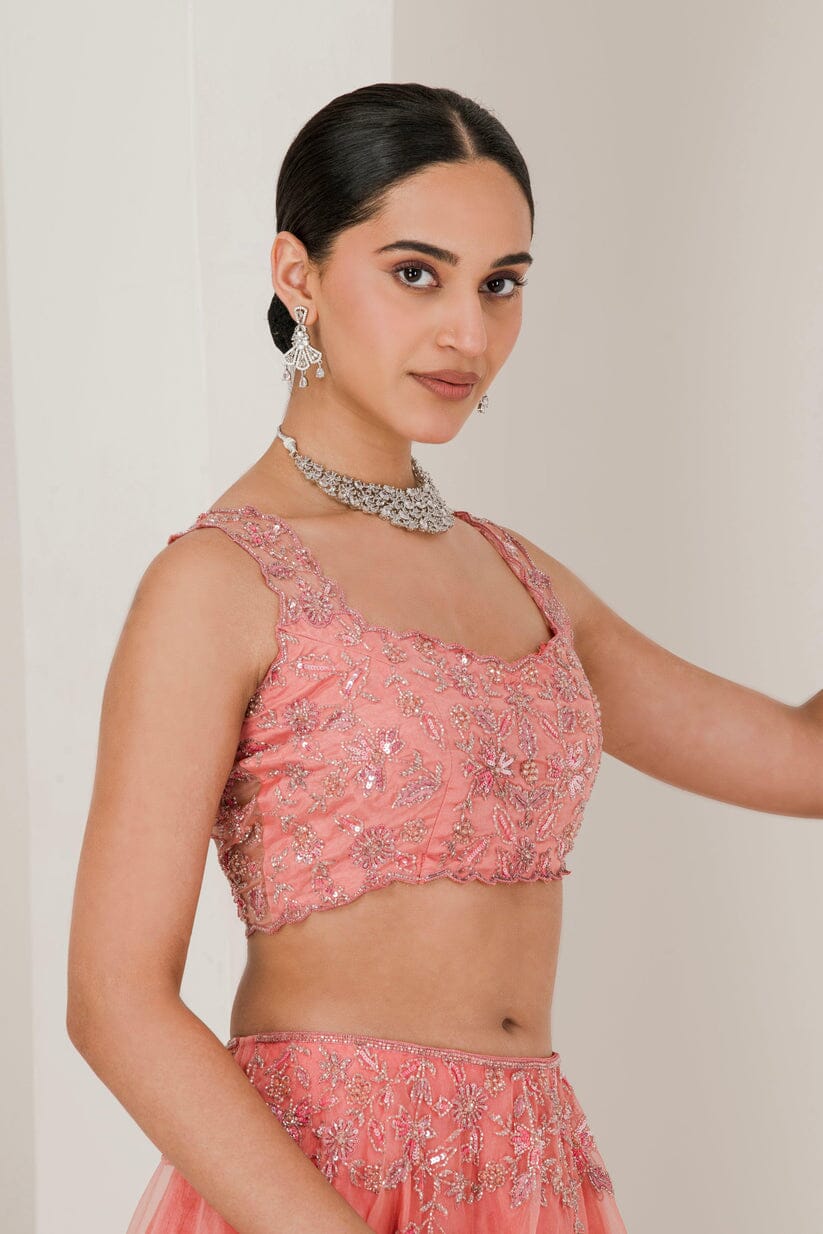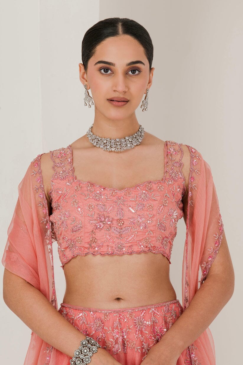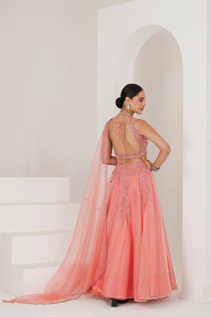 Dusty Pink Hand Embroidered Organza Lehenga (Set of 3)