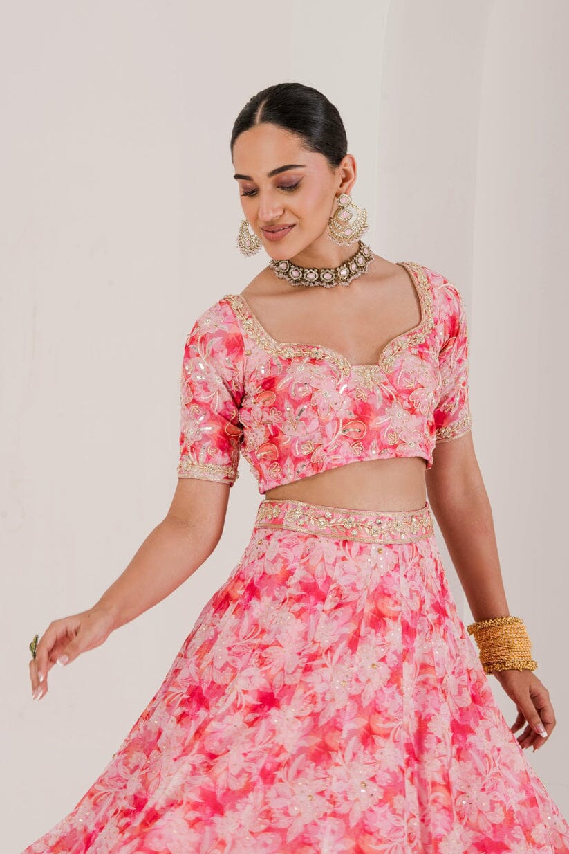Pink Floral Print Hand Embroidered Lehenga Set ( Set of 3 )