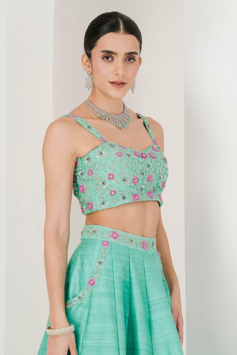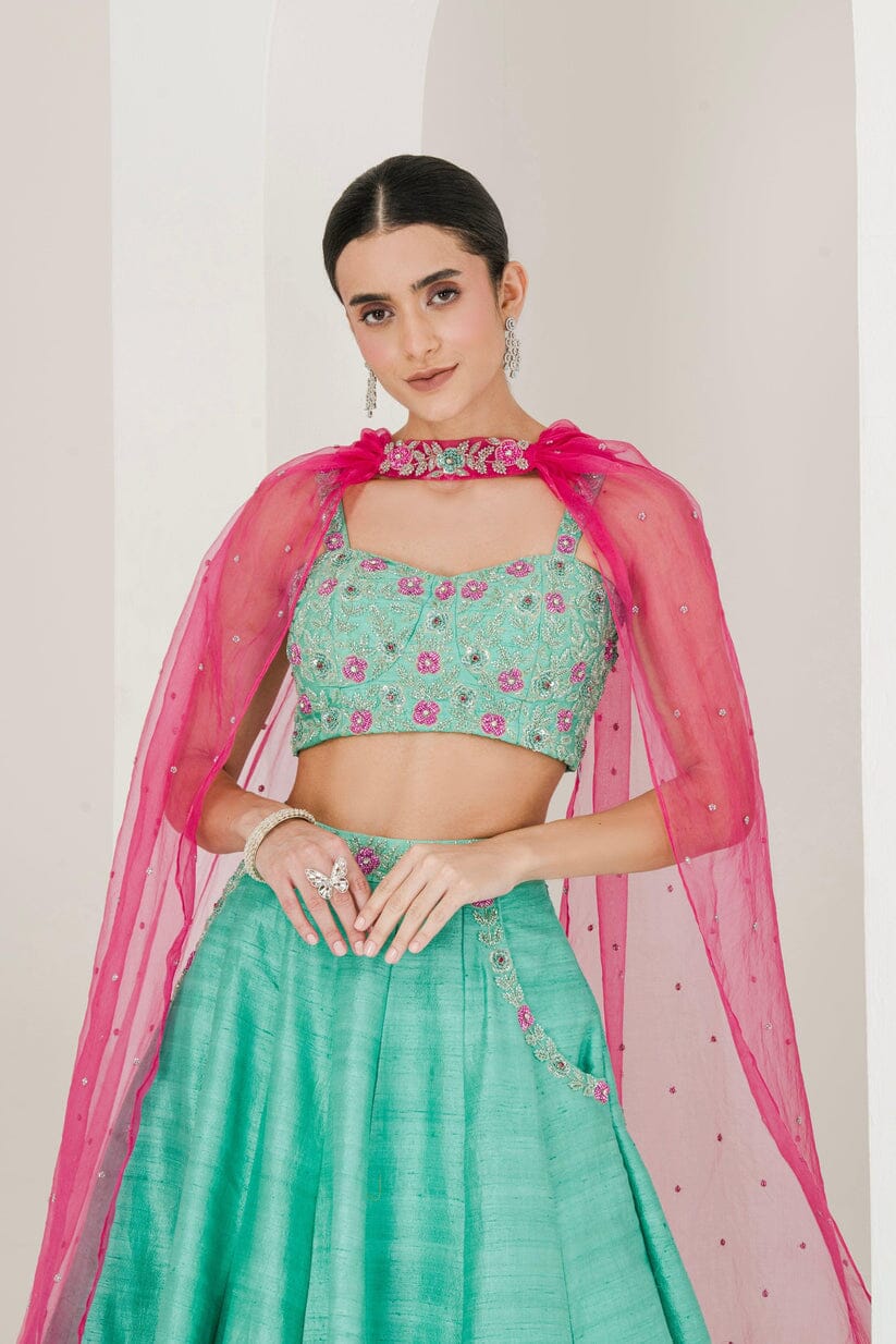 Sea Green & Ruby Pink Hand Embroidered Raw Silk Lehenga ( Set of 3 )