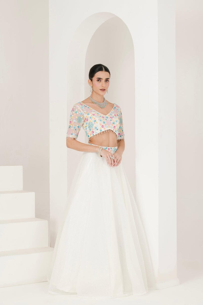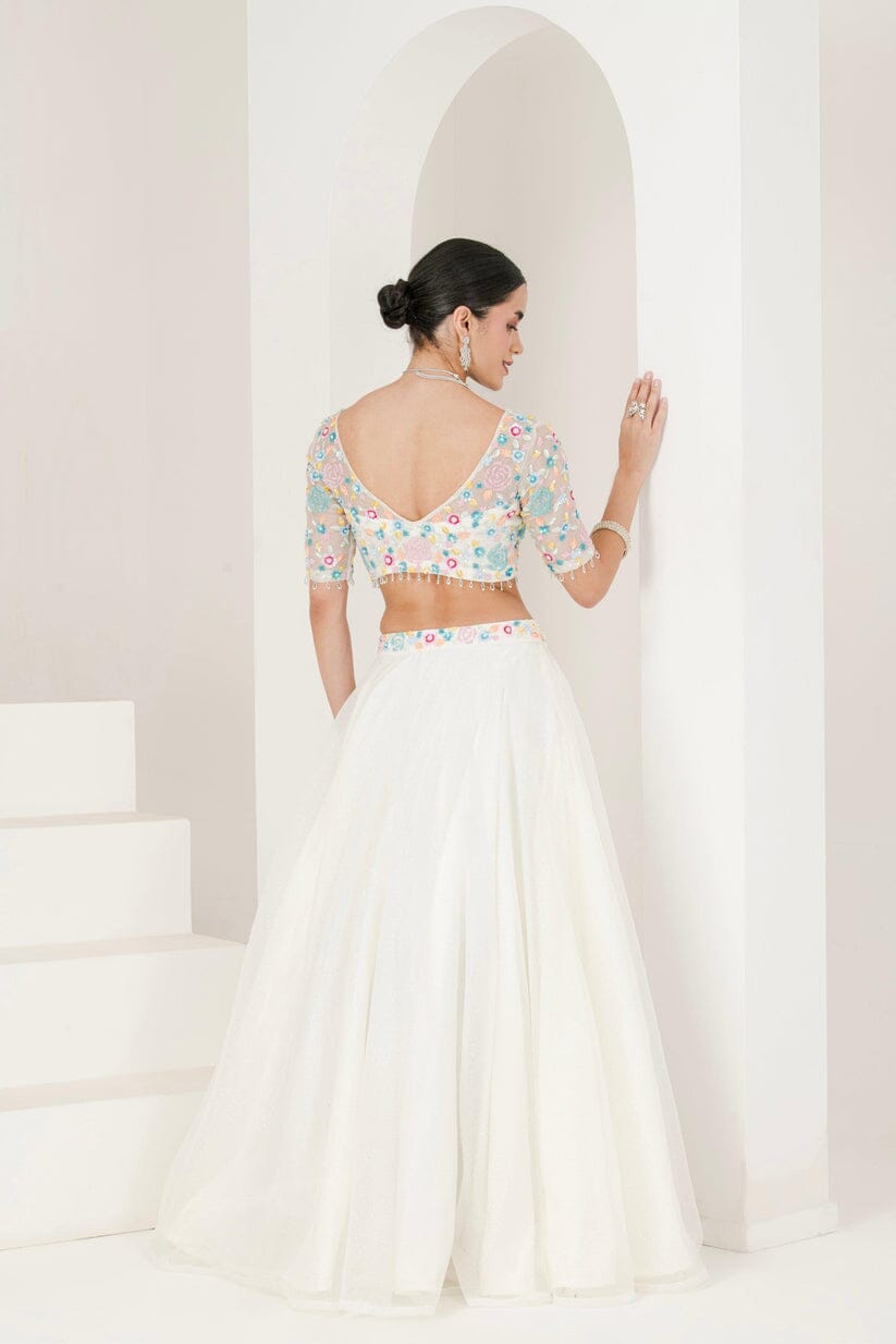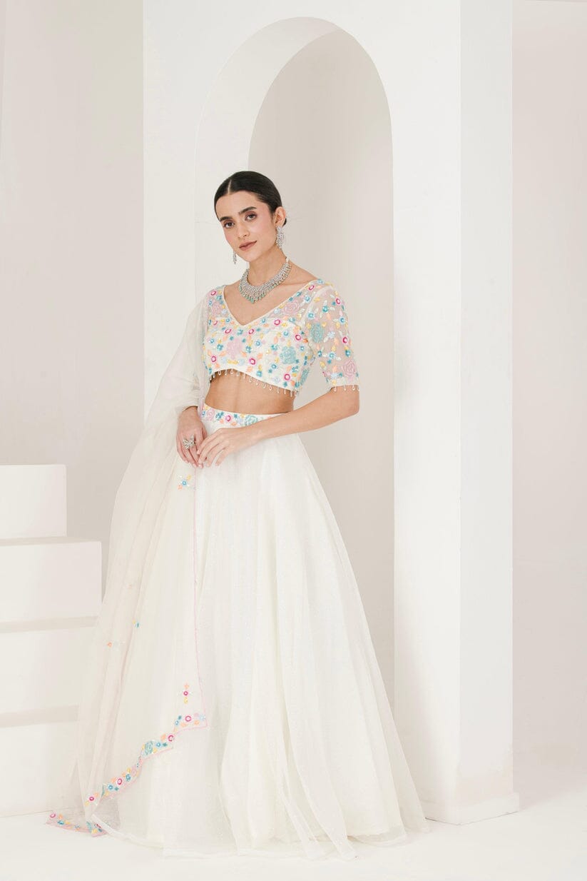 White Floral Hand Embroidered Organza Lehenga ( Set of 3 )