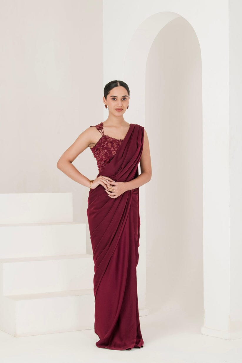 Maroon Hand Embroidered High Slit Pre Stitched Saree ( Set of 2 )