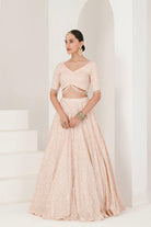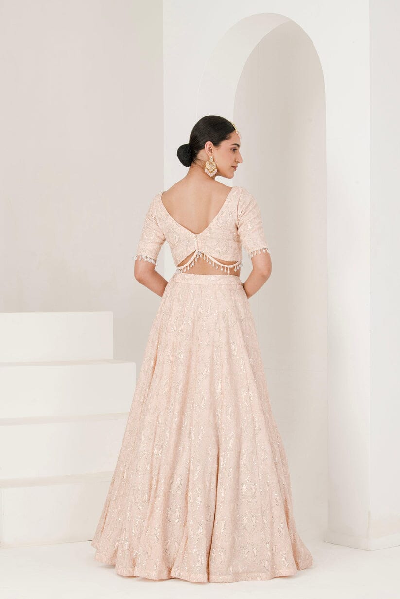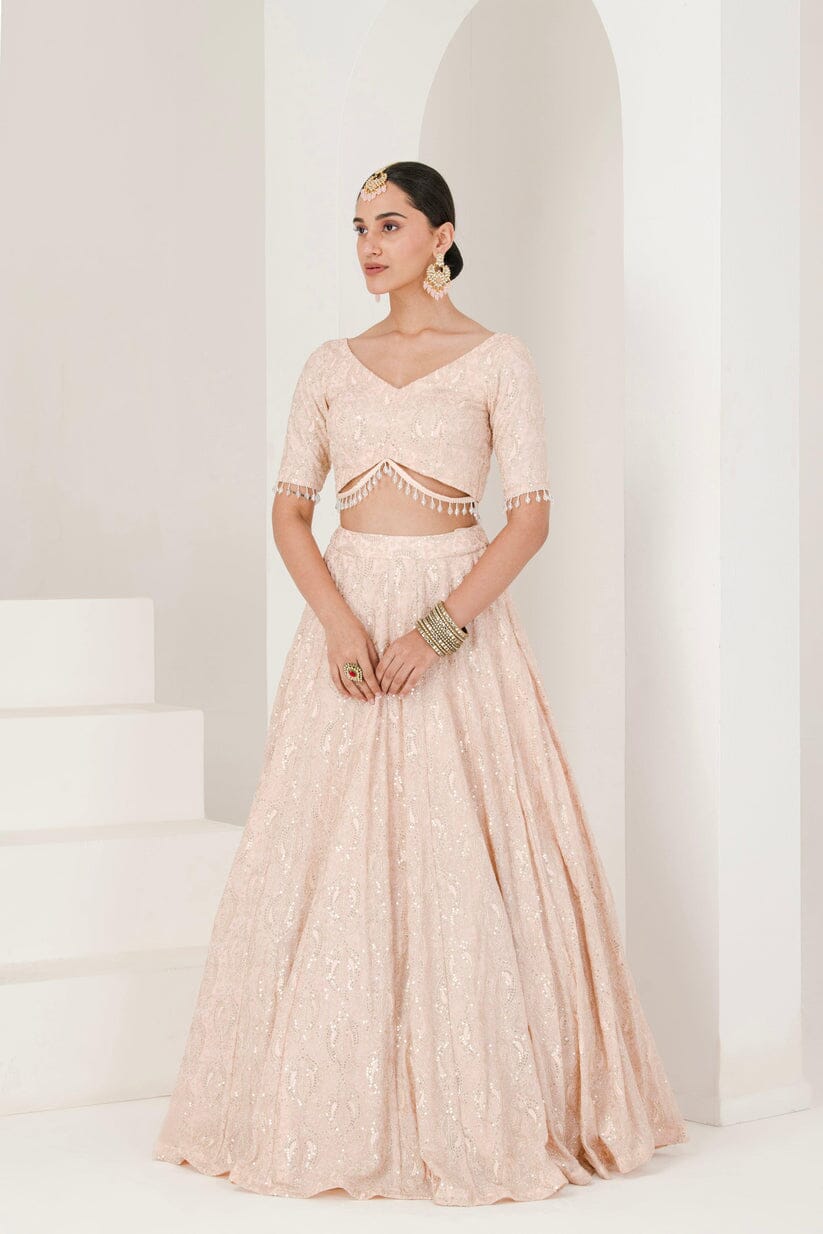 Featuring a light peachy shade lucknowi inspired embroidered lehenga set.This ensemble is perfect for day weddings or sangeet function.Made with delicately embroidered georgette fabric the set consists of lehenga choli and a sheer organza dupatta with similar thread work.