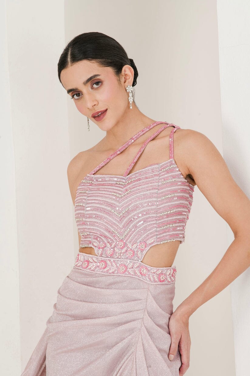 Get ready to stun the crowd with this exquisite and fancy ready-to-wear embroidered draped saree gown.The saree is attached with blouse with intricate pearls,beads, sequins and Swarovski embroidery that shimmers beautifully in the light.The saree is made with imported shimmer fabric and has a high slit to add glam to the overall outfit.