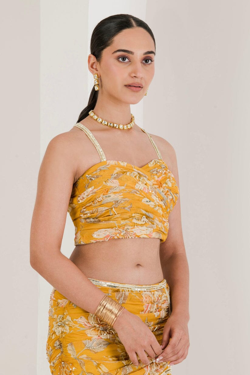 Indulge in ethereal charm with our mustard yellow floral print lehenga set a masterpiece of contemporary elegance and traditional allure.This enchanting ensemble features a strappy draped blouse and draped fish cut style lehenga skirt.The entire printed chinnon fabric is adorned with sequins pearls and glass beads.Glistening with glass beads and pearls  is a cape style sheer organza dupatta that create a mesmerizing fusion of  traditional technique with modern silhouette.