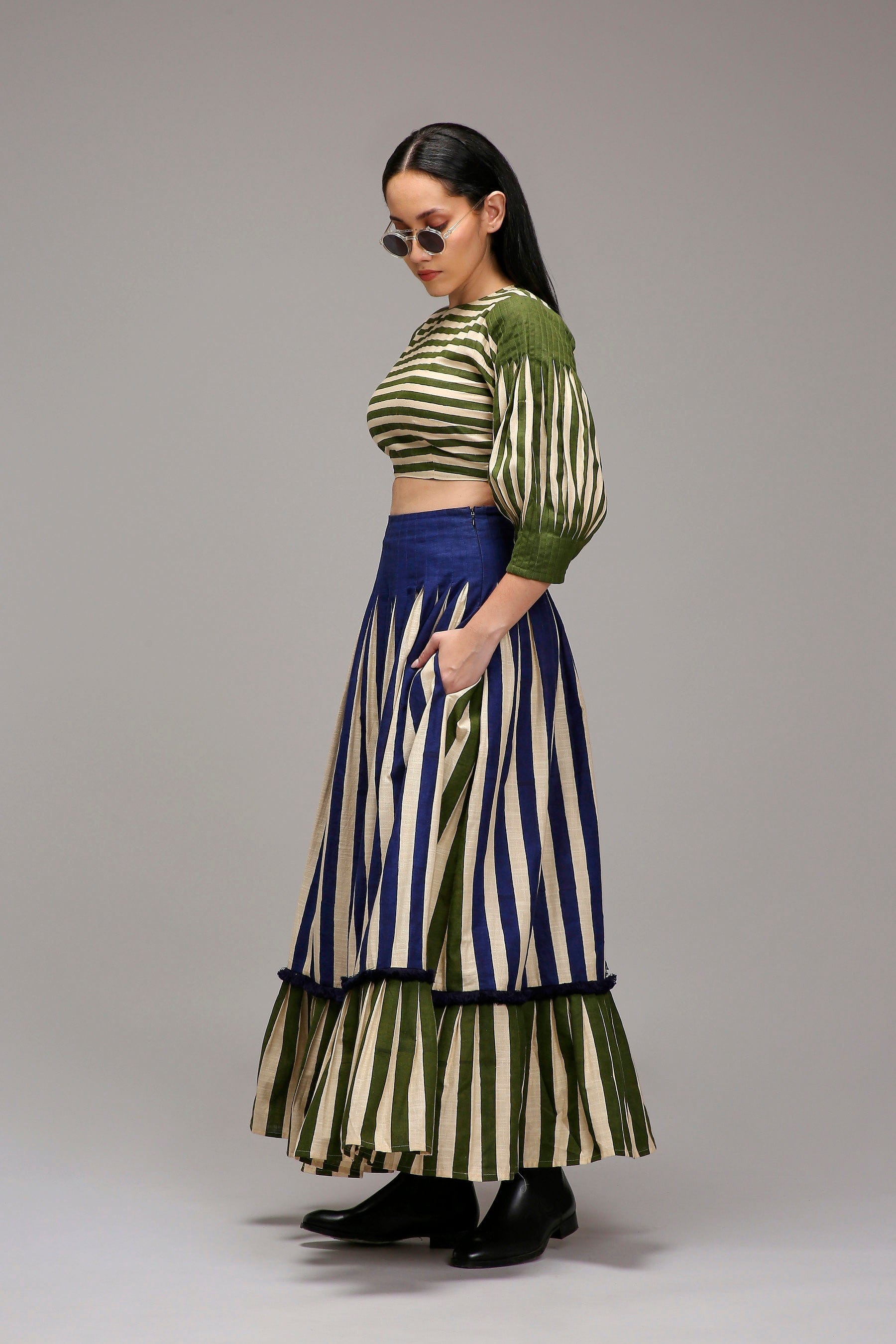 This set includes a dual-striped skirt and a striped-sleeve crop top, made from handwoven cotton with hand-blocked stripe patterns.l The skirt features a contrast pleated side panel, waistband pleats, side pockets, a hidden zipper, and fringed lace at the bottom. The top has striped sleeves, elastic hems, and a back button closure. Wear them together or pair with the striped stole from the collection for a bold, coordinated look.
