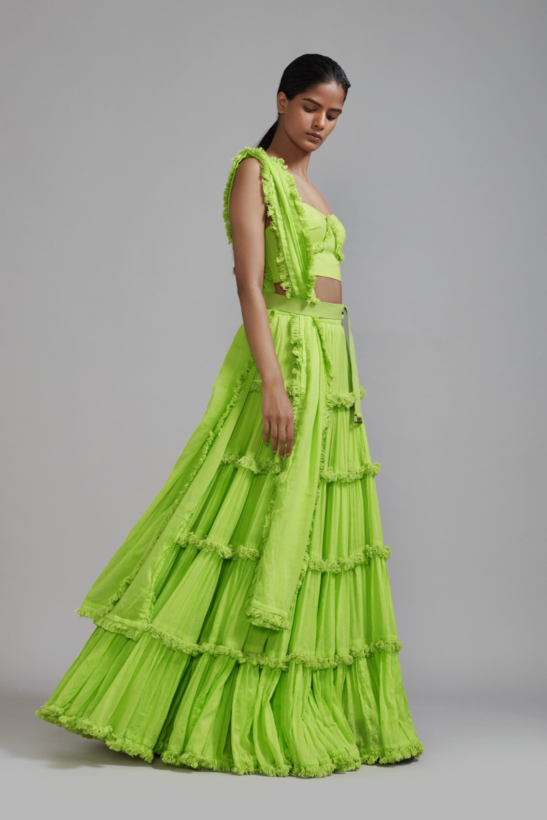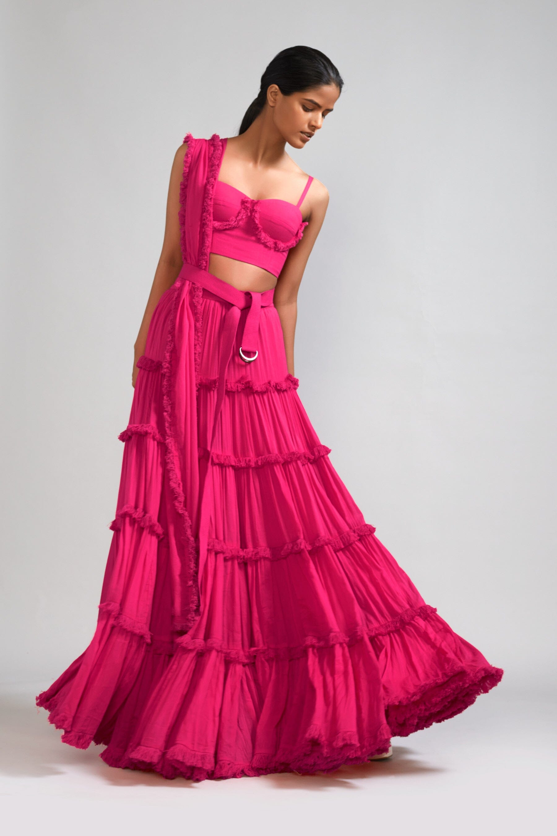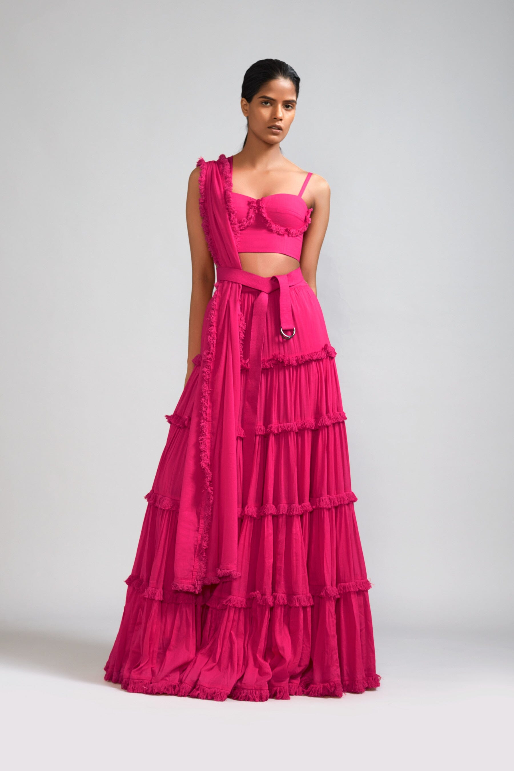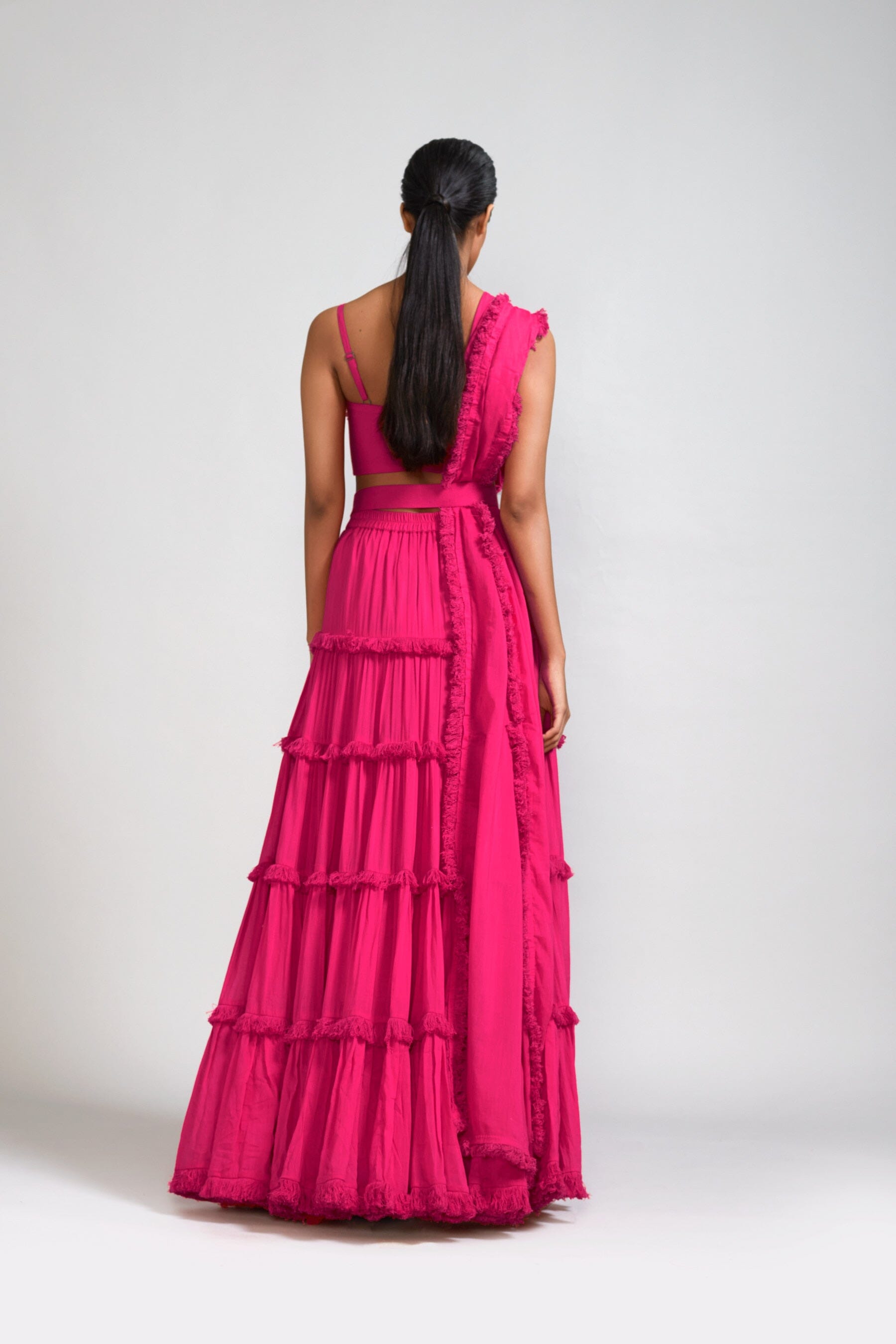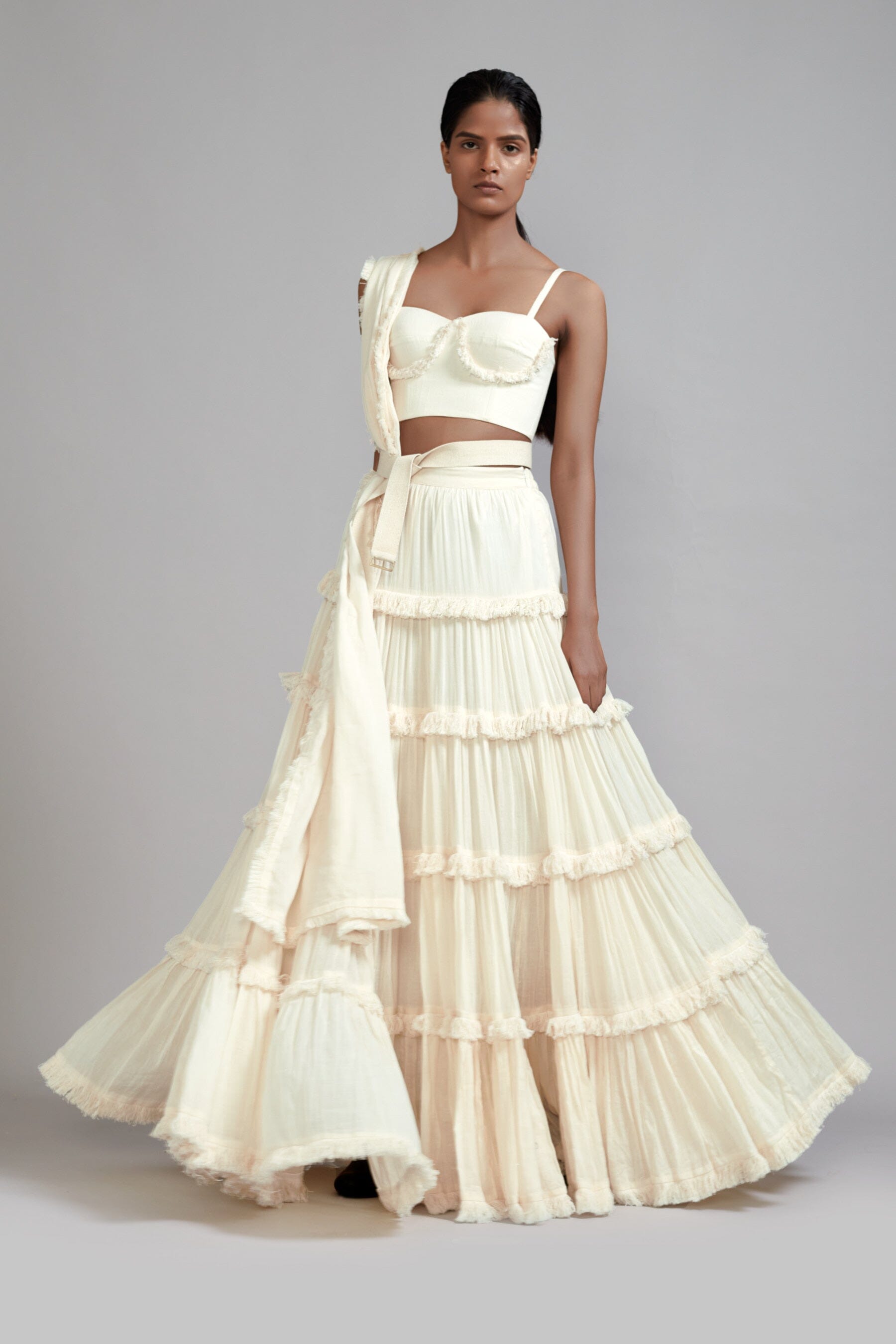 Un conjunto de tres piezas de corsé con flecos, mul lehenga y dupatta hilado a mano (juego de 3)