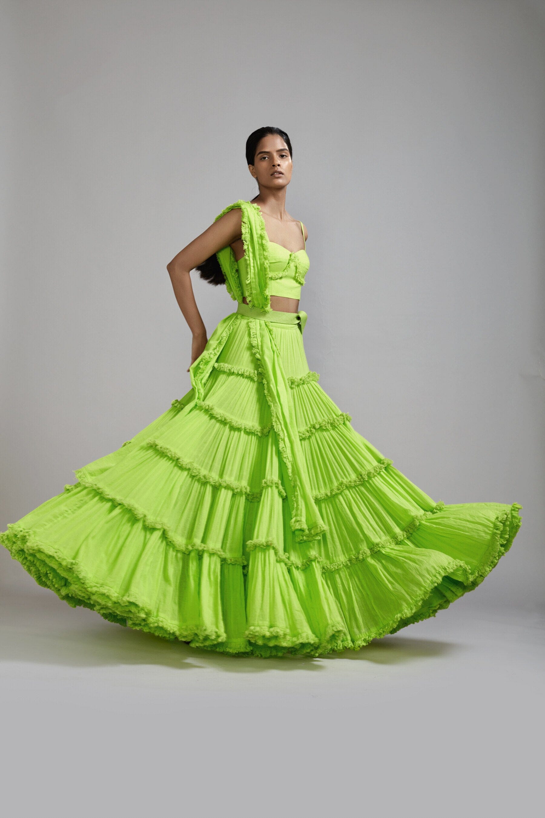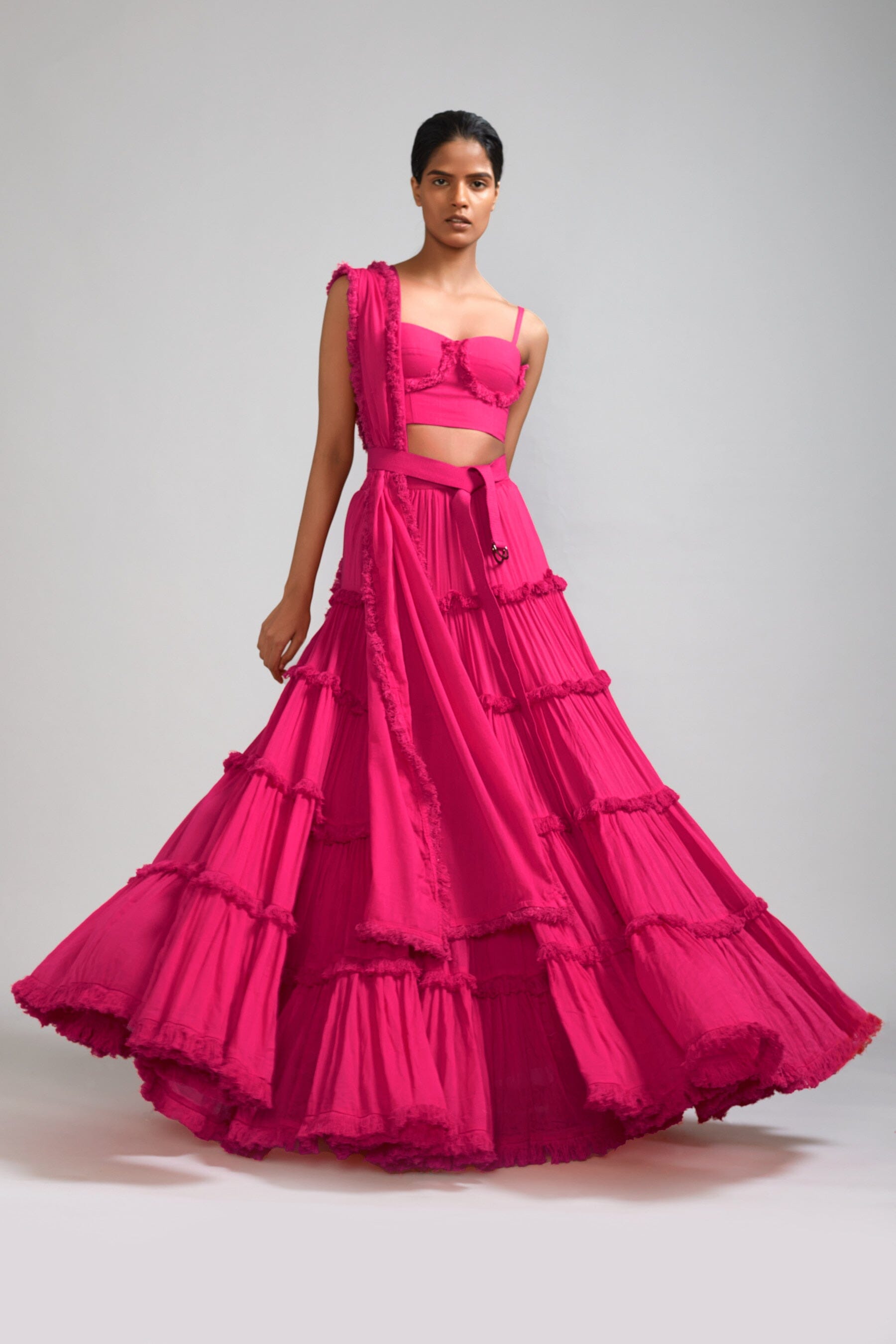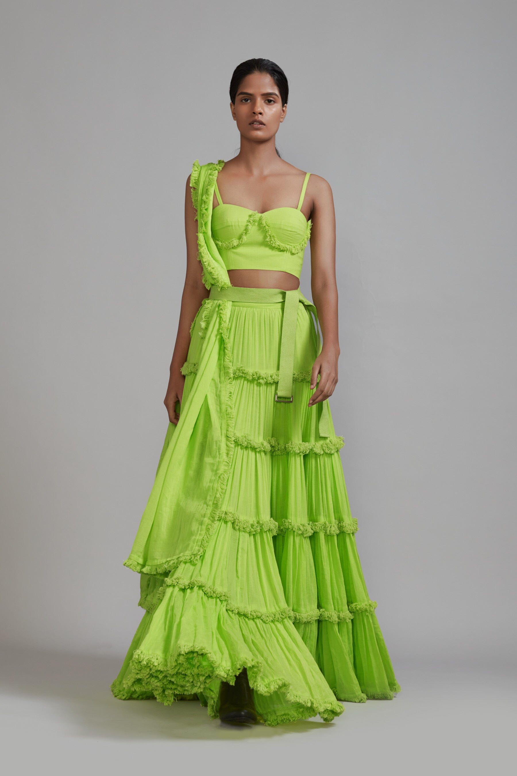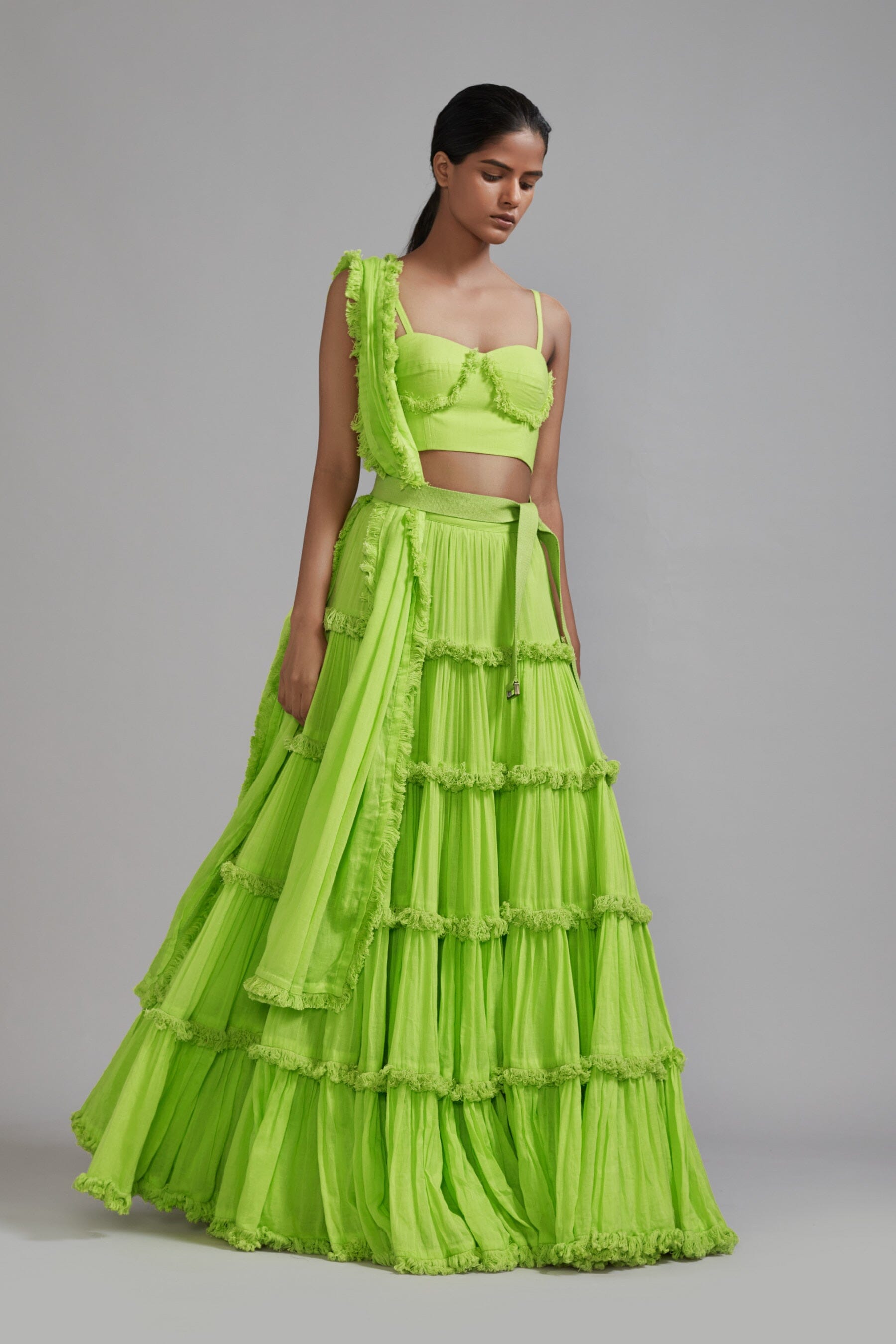 Un conjunto de tres piezas de corsé con flecos, mul lehenga y dupatta hilado a mano (juego de 3)