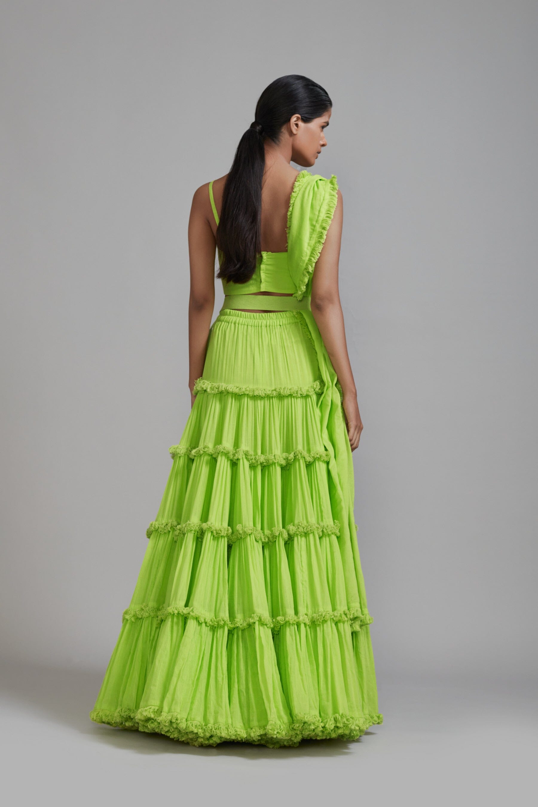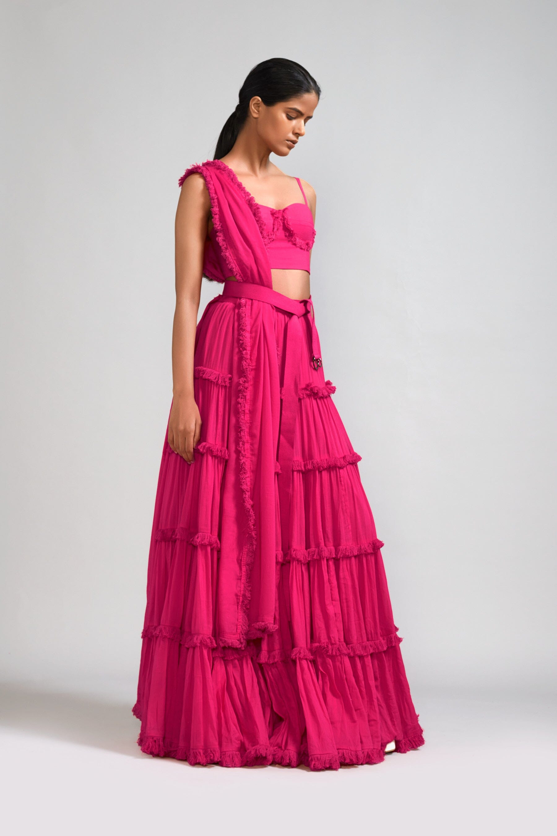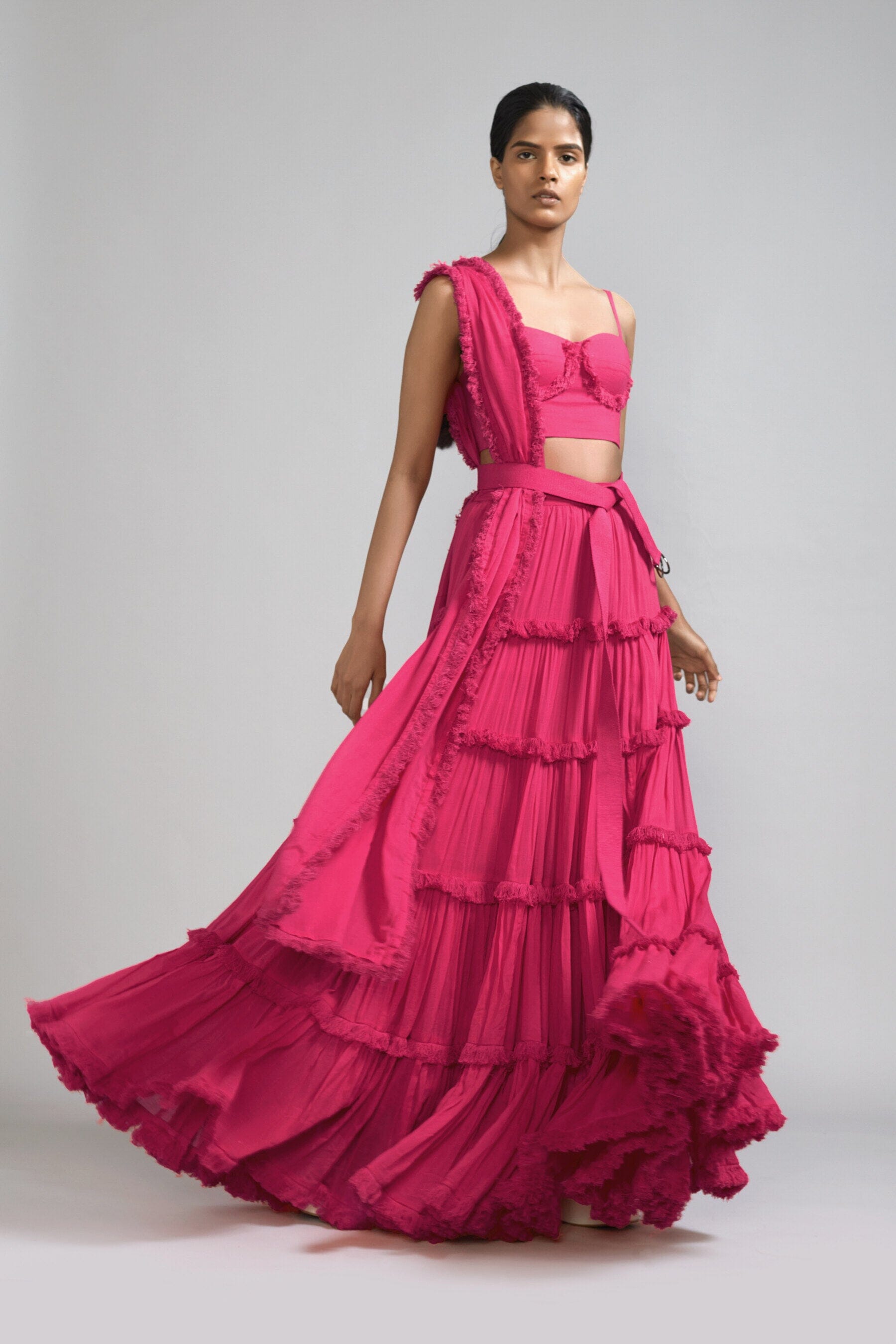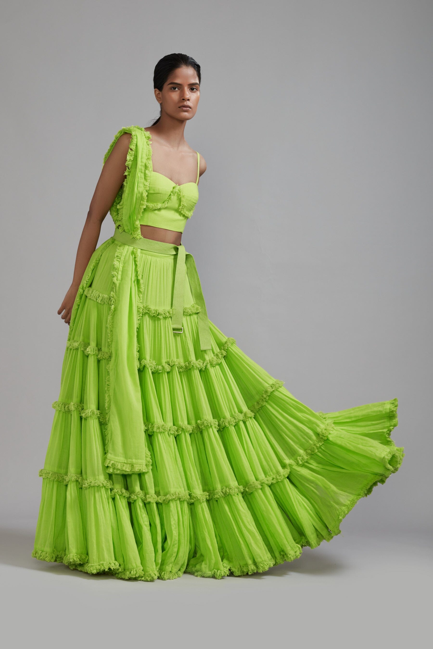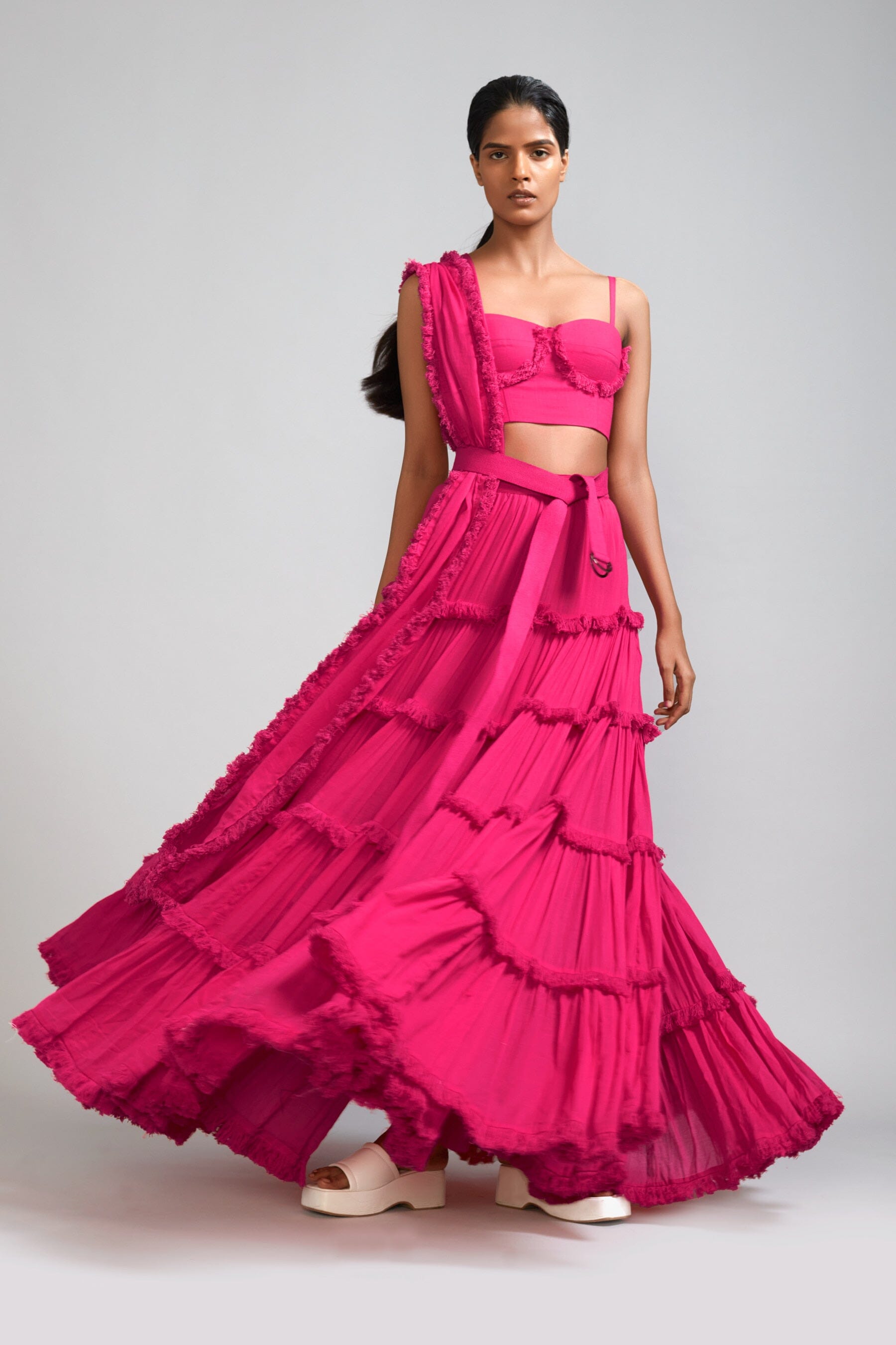 Un conjunto de tres piezas de corsé con flecos, mul lehenga y dupatta hilado a mano (juego de 3)
