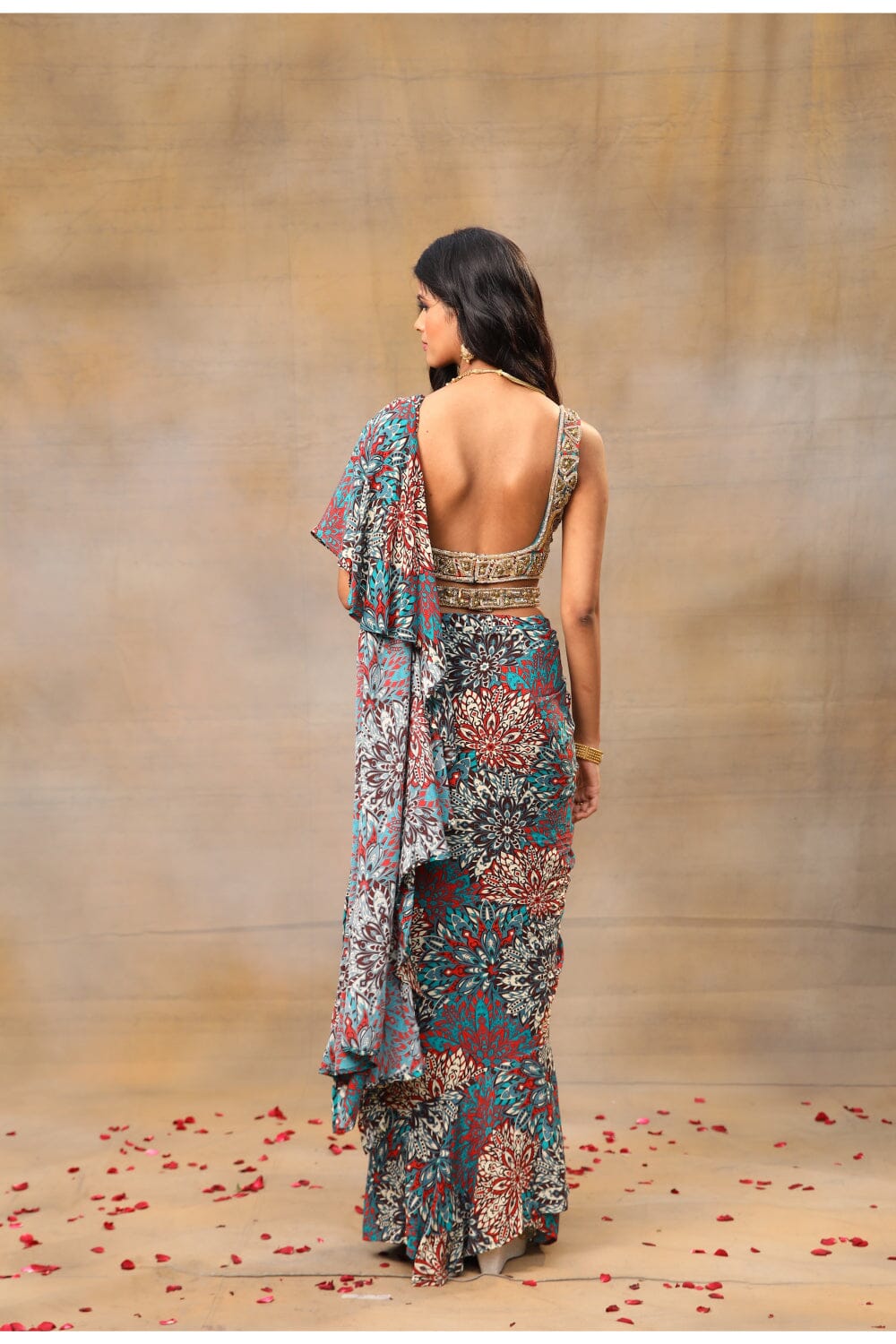 ¡Pasa a ser el centro de atención con nuestro impresionante conjunto de Choli con estampado floral verde y sari con volantes! Abrace el glamour de Bollywood con este conjunto atrevido y hermoso, perfecto para festividades de boda. El llamativo cinturón bordado ciñe tu cintura, creando una silueta dramática que es a la vez divertida y fabulosa. Prepárate para robar el espectáculo y hacer que cada momento sea memorable con este conjunto verdaderamente fascinante.