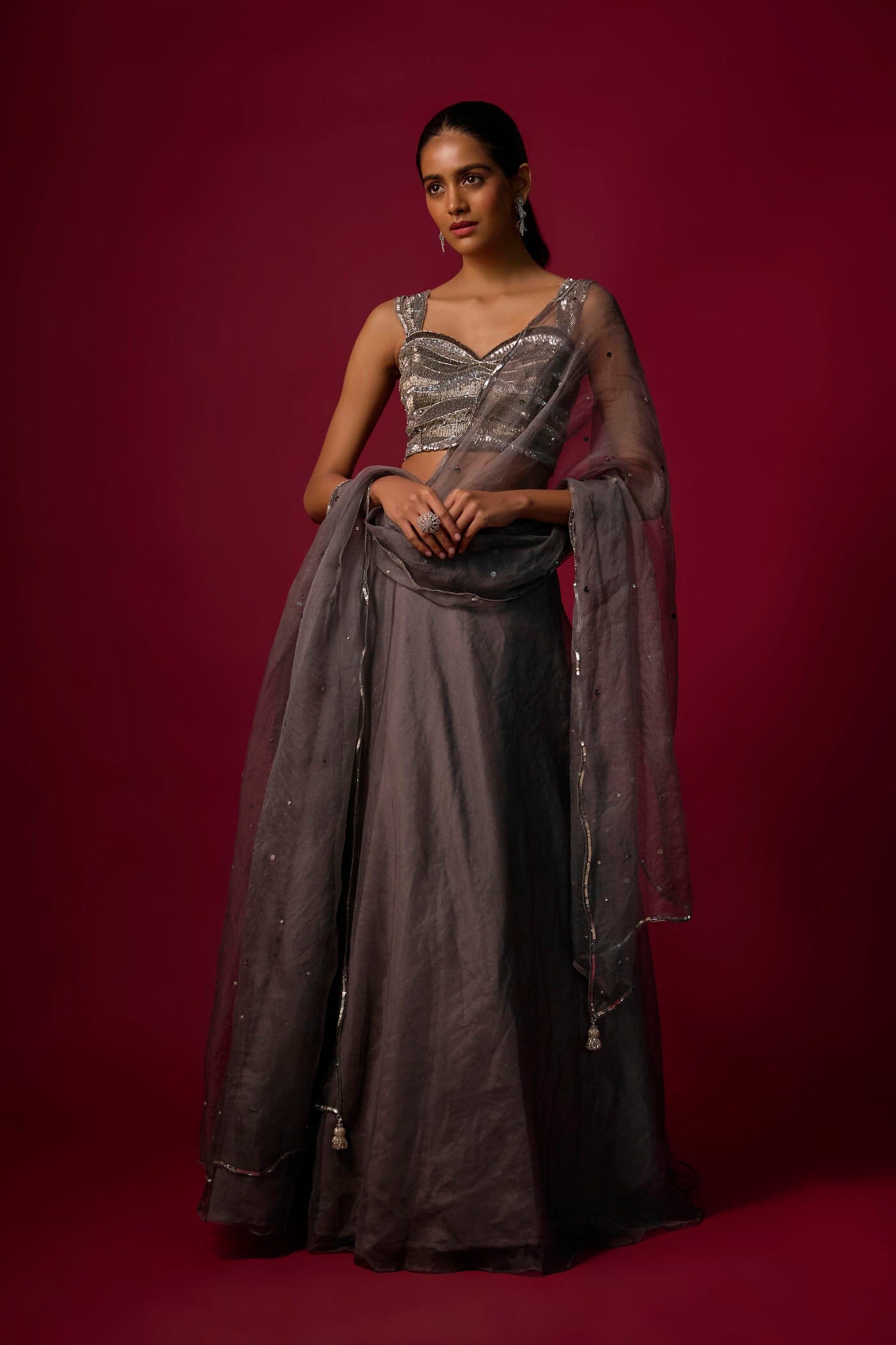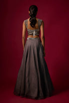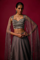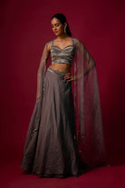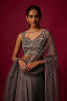 Turn heads in this steel grey embroidered choli, adorned with shimmering silver and grey detailing, paired with a flowing organza skirt for an ethereal silhouette. Complete the look with a delicate organza dupatta, featuring intricate embroidery and playful hanging accents at the edges.