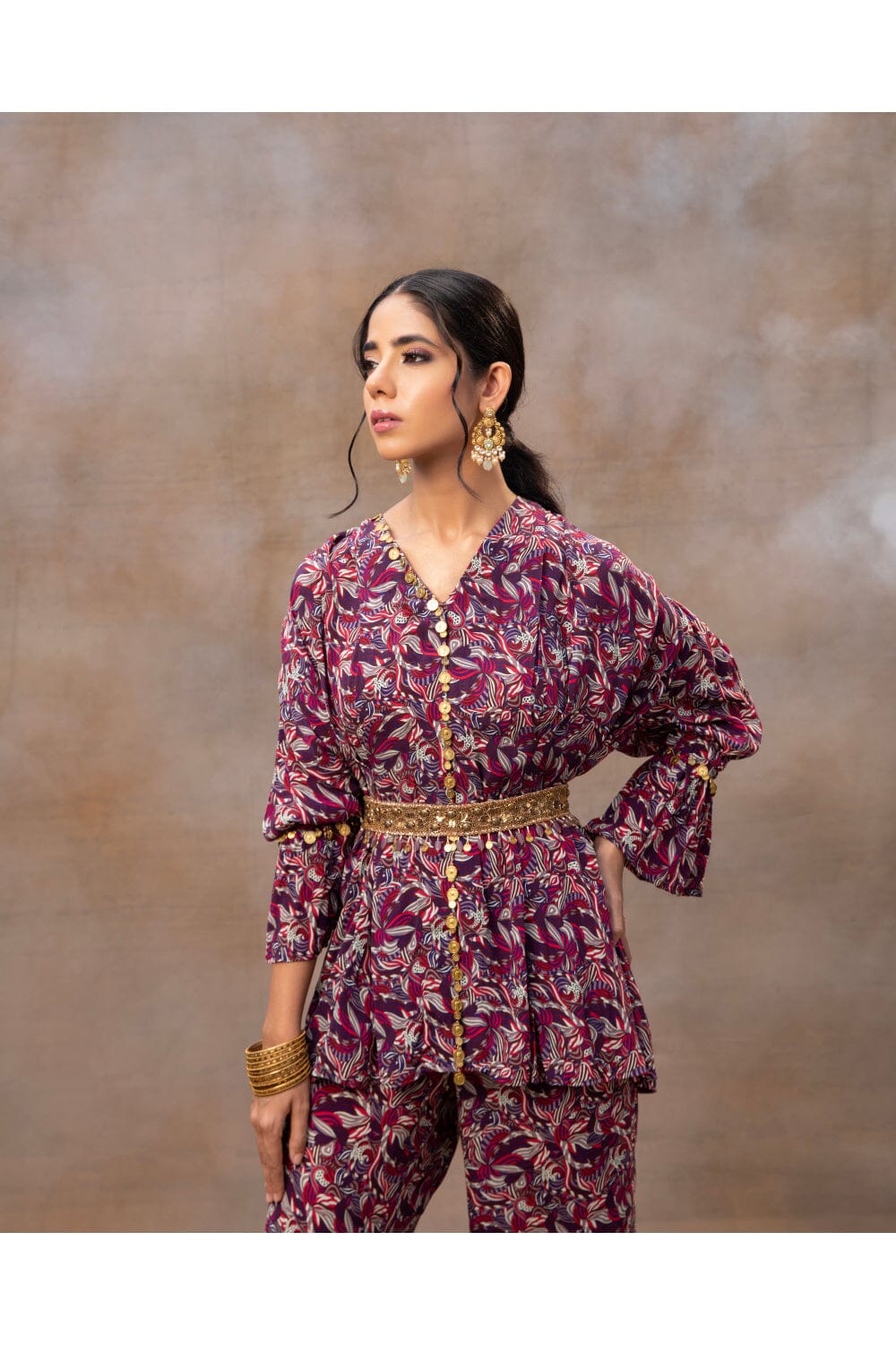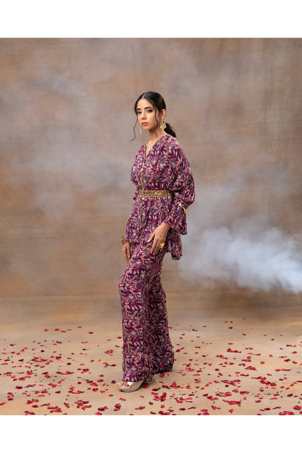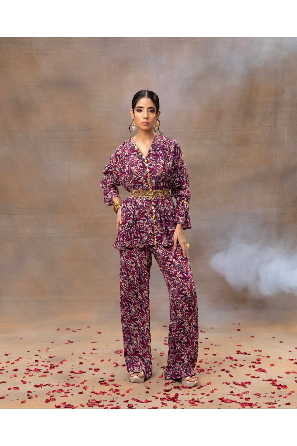 Presentamos nuestro impresionante conjunto de coordinación con estampado geométrico morado, una combinación perfecta de sofisticación y versatilidad. Los detalles plisados en la parte superior adornados con elegantes adornos dorados irradian un encanto atemporal, mientras que los pantalones de pierna recta añaden un toque de estilo contemporáneo. Completo con un cinturón intrincadamente bordado que se puede usar para realzar el factor chic o sin él para una apariencia más relajada, este conjunto pasa sin esfuerzo de ocasiones elegantes a asuntos informales, lo que lo convierte en una adición imprescindible a su guardarropa.